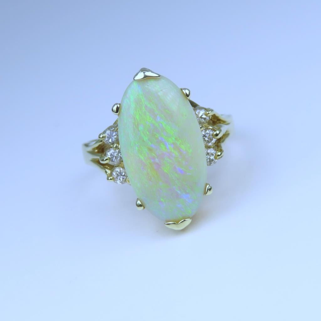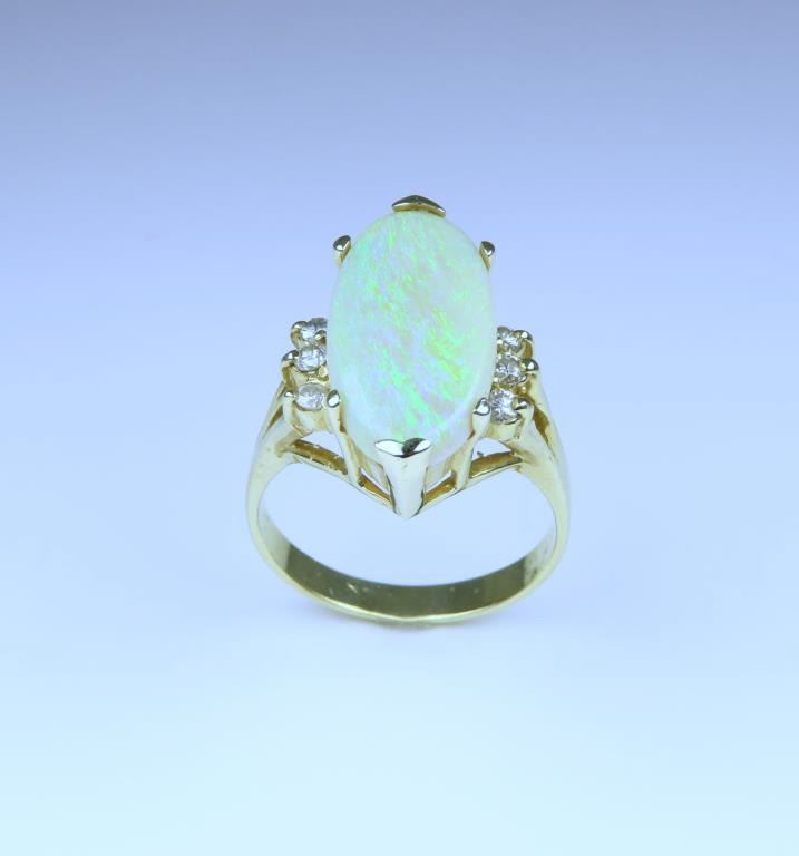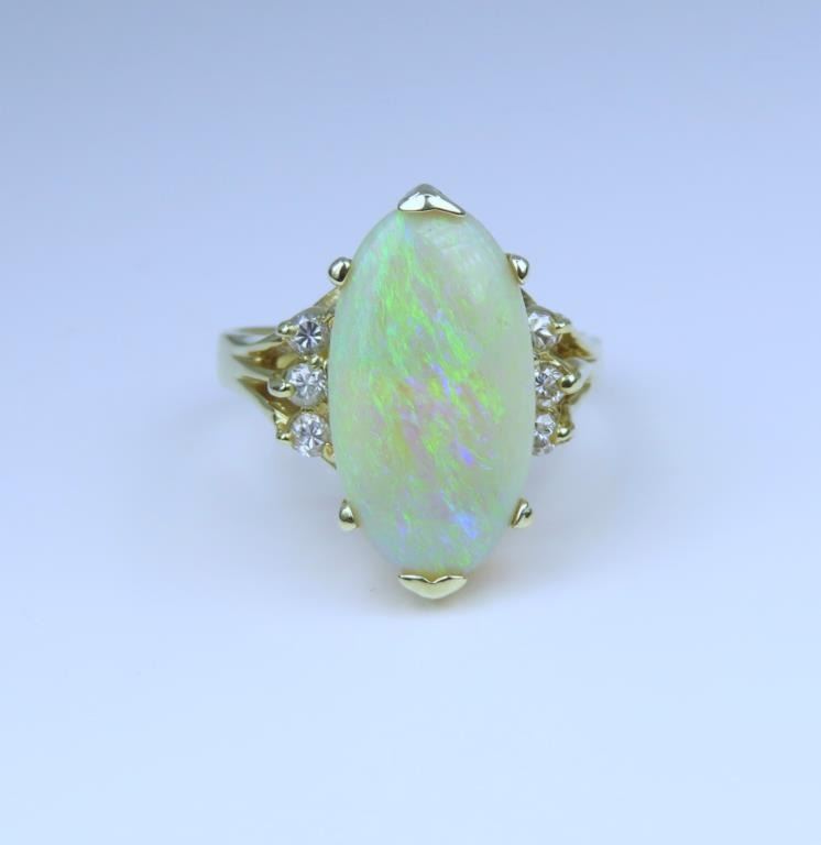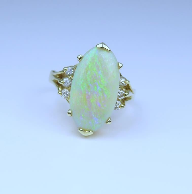 featuring an oval Opal weighing approx. 8.00 carats with flashes of green, blue and orange accented by 6 round cut side Diamonds set in 14 karat yellow gold setting, ring size 7. Retail $3,000-$4,000