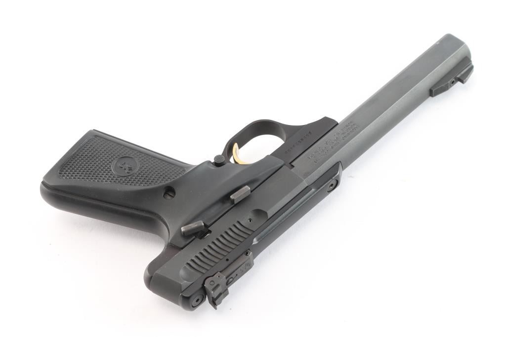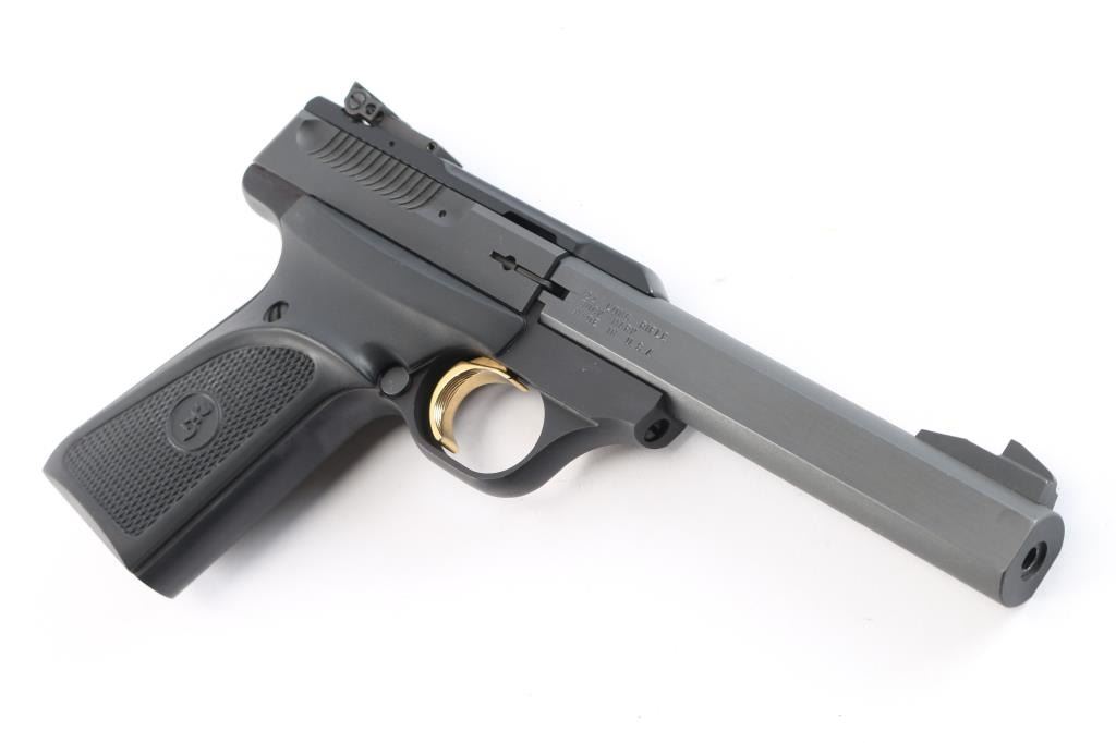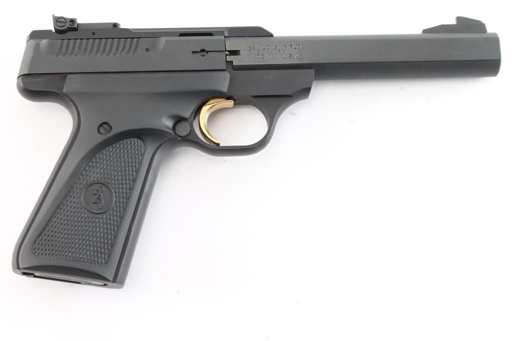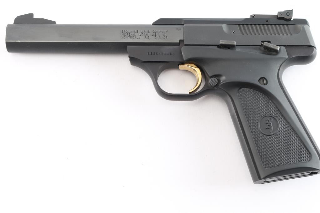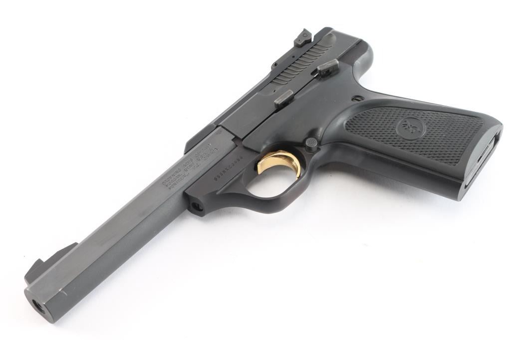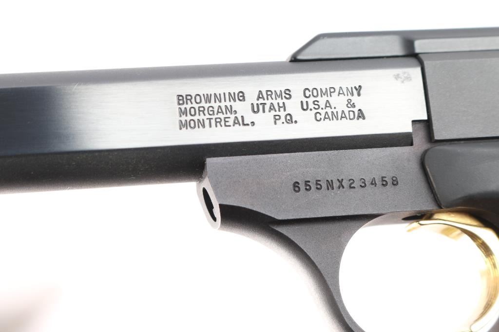 Blowback-operated semi automatic target pistol chambered in .22 Long Rifle. Features a matte black finish, 5 1/2" slab sided barrel, serrated, ramped front blade, micro adjustable rear sights, safety selector, partially serrated gold trigger, and Browning ambidextrous checkered black rubber grips. Pistol retains 98% original finish intact with a couple of very small chips on the slide, and slight muzzle wear. Action is firm, bore is excellent/bright, and grips are fine.