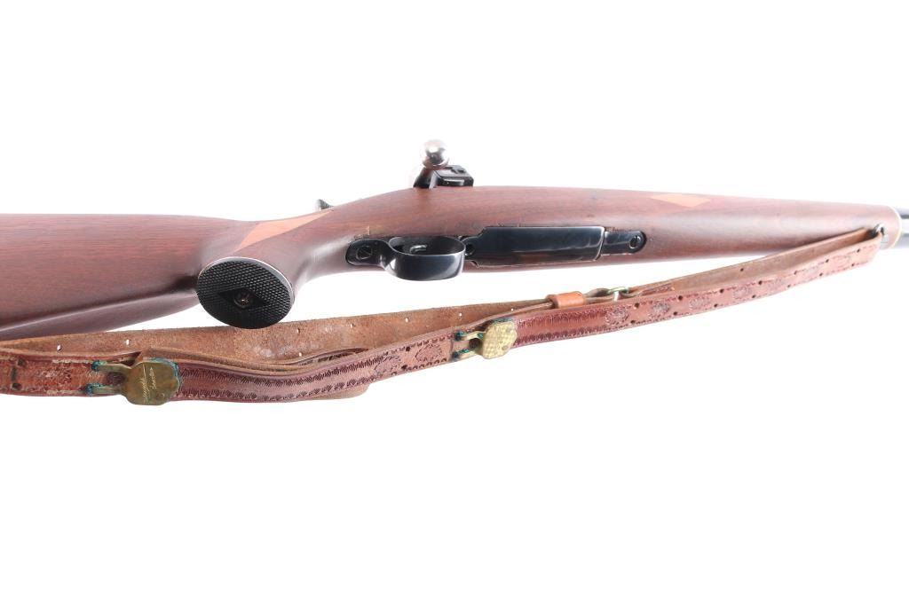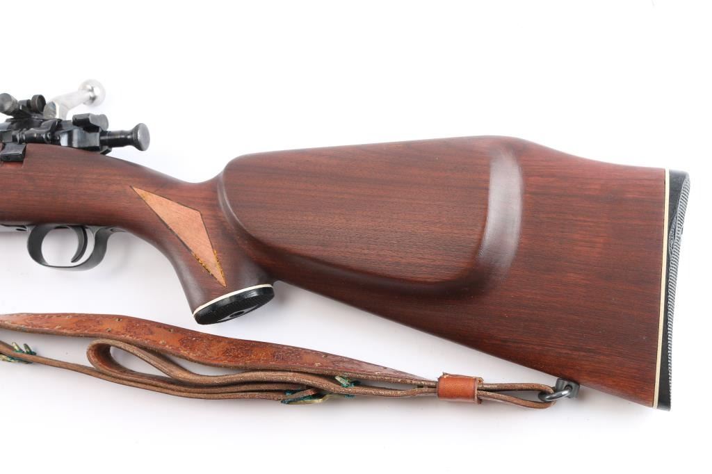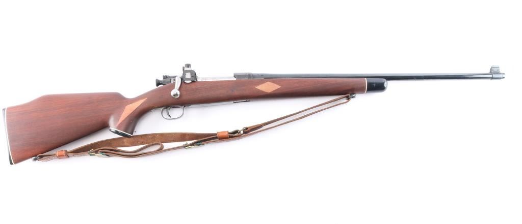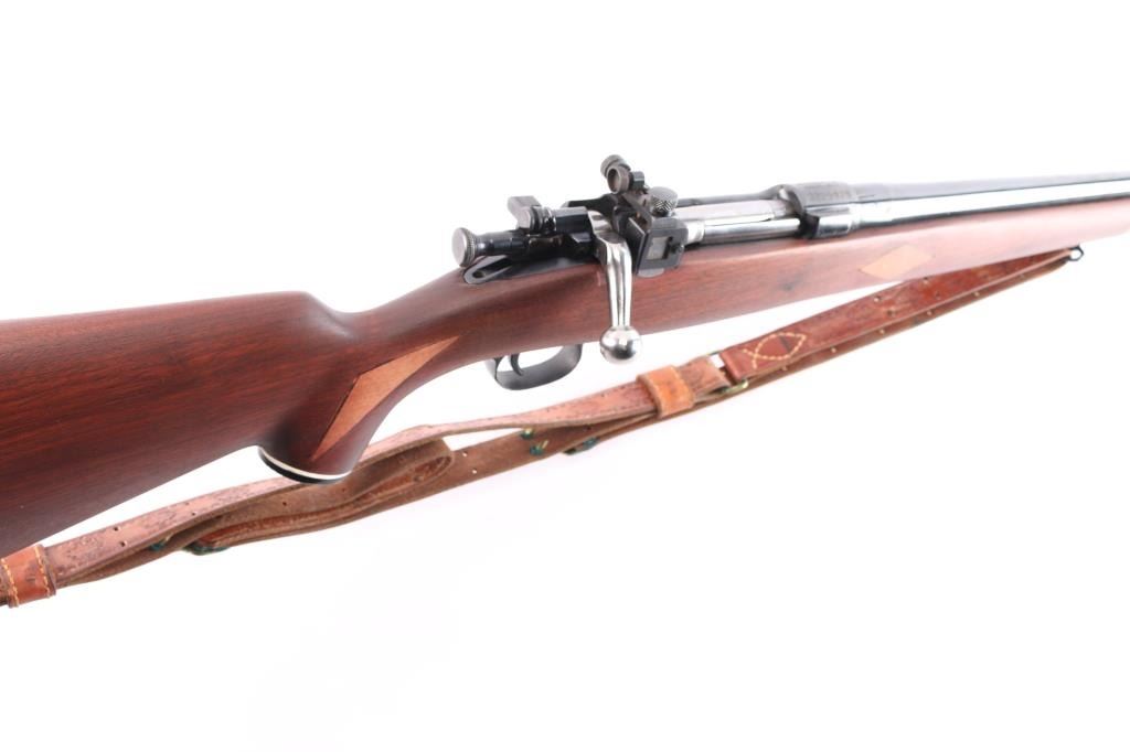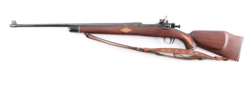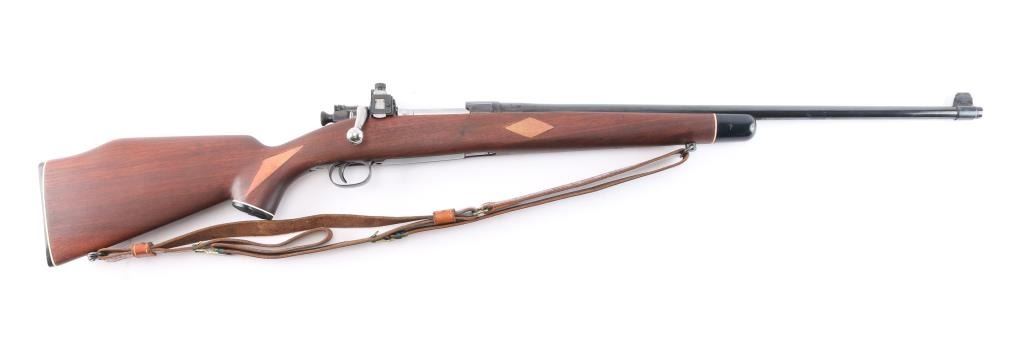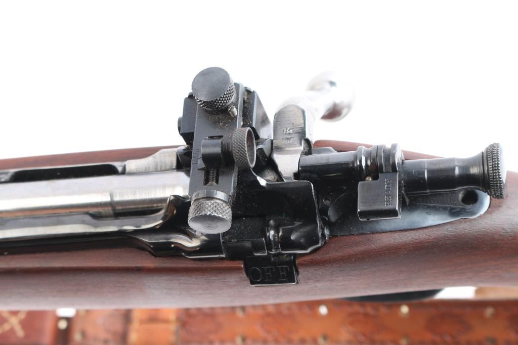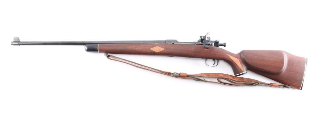 Sporterized U.S. Military contracted bolt-action service rifle chambered in .30-06 Springfield, circa 1942. Features a high polish blued finish, 24" barrel, ramped blade front sight with brass insert, Redfield adjustable peep sight installed on receiver, manual safety, 5-round integral box magazine, magazine cut-off, smooth trigger, polished bolt handle, stamped metal floorplate & trigger guard, and nice smooth Bishop Monte Carlo style wood stock with contrasting black forearm cap, grip cap and buttplate with white spacers, contrasting blond wood inletted in wrist and forearm, high comb, cheek rest for right-handed shooting. Rifle retains approximately 98% of it's refinish. Action is smooth, bore is very good/bright, strong rifling. and wood stock is very good. Brown leather sling attached. A really nice job.