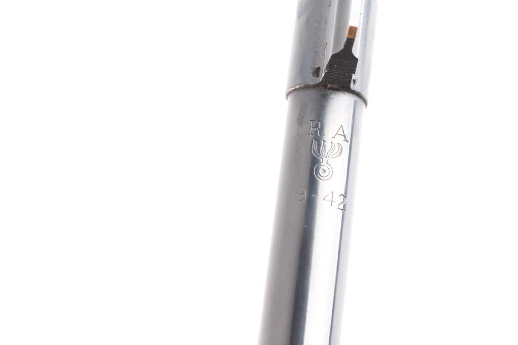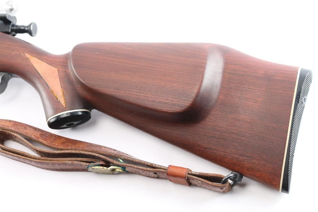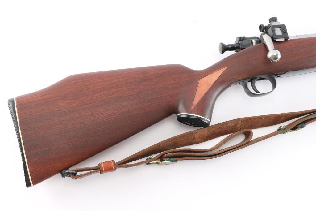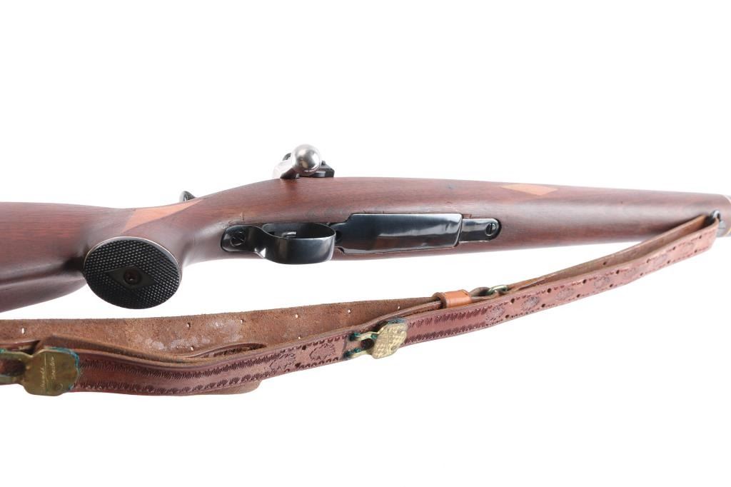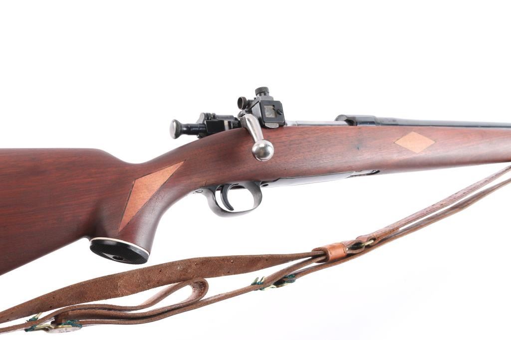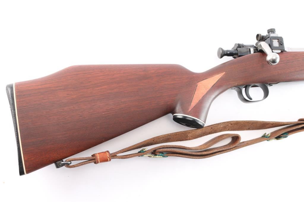 Sporterized U.S. Military contracted bolt-action service rifle chambered in .30-06 Springfield, circa 1942. Features a high polish blued finish, 24" barrel, ramped blade front sight with brass insert, Redfield adjustable peep sight installed on receiver, manual safety, 5-round integral box magazine, magazine cut-off, smooth trigger, polished bolt handle, stamped metal floorplate & trigger guard, and nice smooth Bishop Monte Carlo style wood stock with contrasting black forearm cap, grip cap and buttplate with white spacers, contrasting blond wood inletted in wrist and forearm, high comb, cheek rest for right-handed shooting. Rifle retains approximately 98% of it's refinish. Action is smooth, bore is very good/bright, strong rifling. and wood stock is very good. Brown leather sling attached. A really nice job.