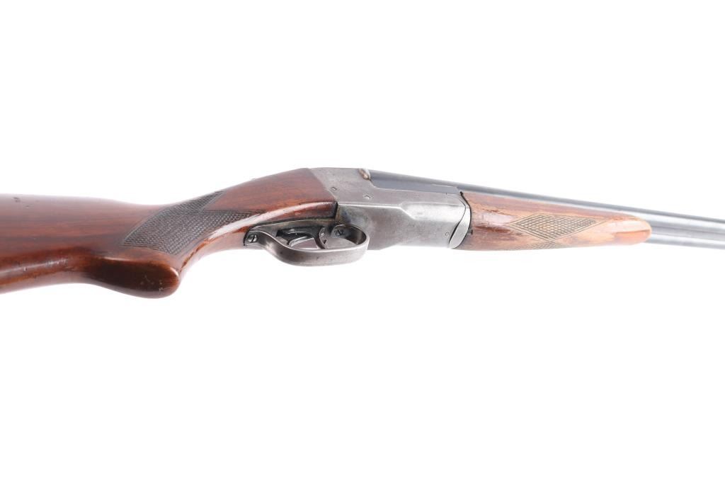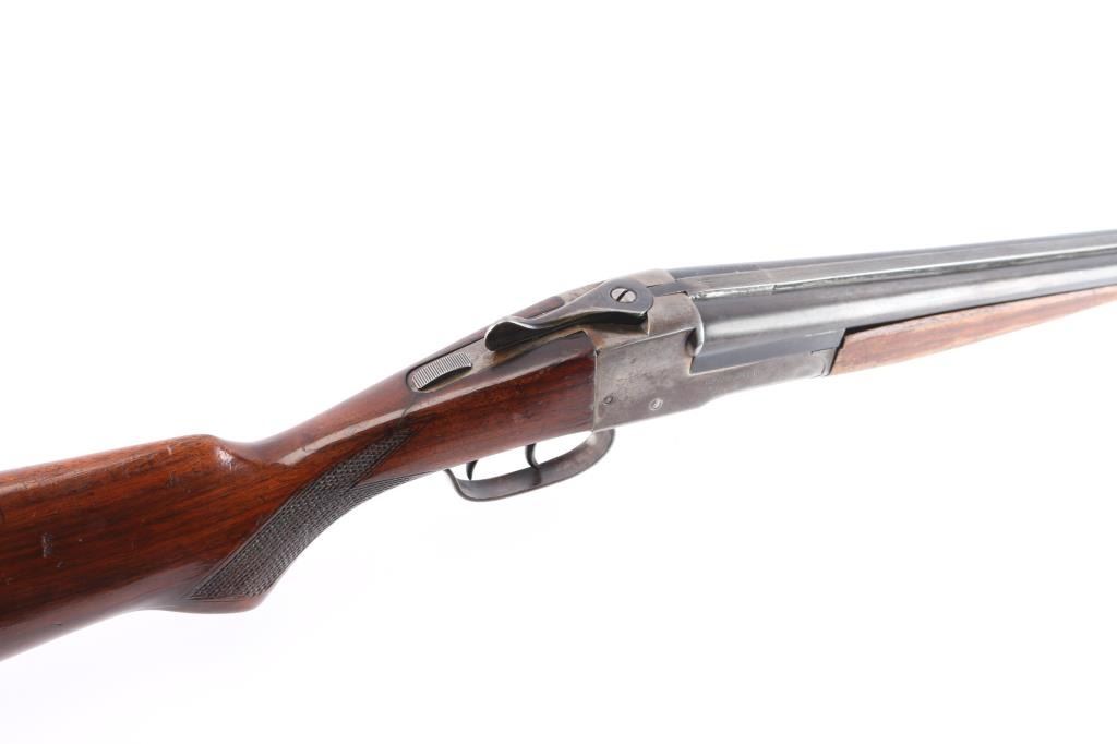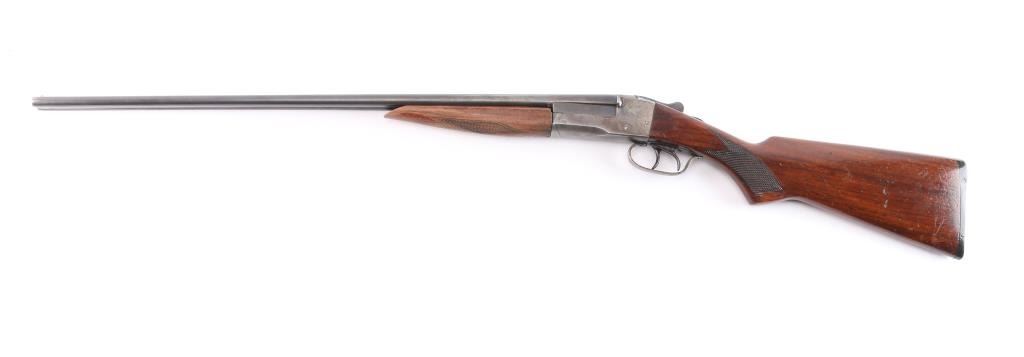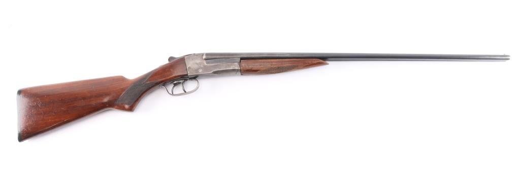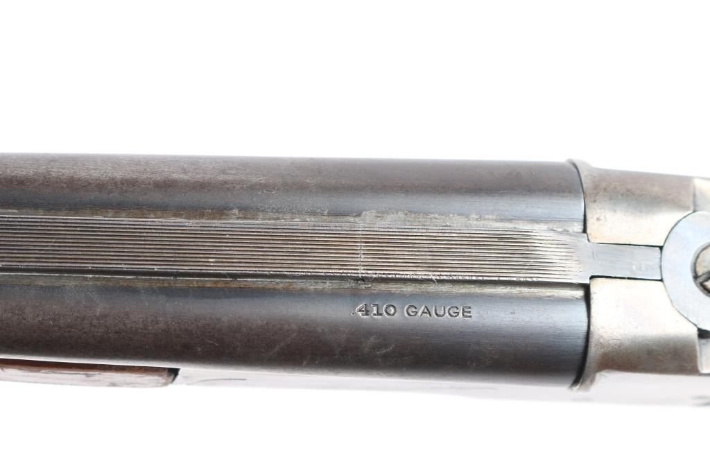Trade name for Sears, manufactured by Stevens. Double barrel side by side shotgun chambered for .410 gauge shells, 3" chamber. Features blued finish, case color receiver, wood 2 piece checkered stock with pistol grip shape, hard rubber buttplate, 26" barrels, white bead front and mid bead sights , tang safety , top lever, double triggers, extractor, 14-1/4" length of pull to forward trigger. Bores are excellent/bright. Blue barrels are about 60% with handling/muzzle wear. case color on action has mostly turned a gray/brown patina with traces in protected areas. Wood is overall good/sound with finish loss on the forearm from handling, some scratches/dings. Tight lock-up.