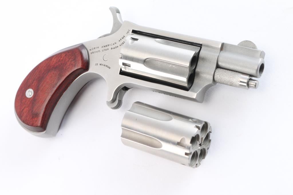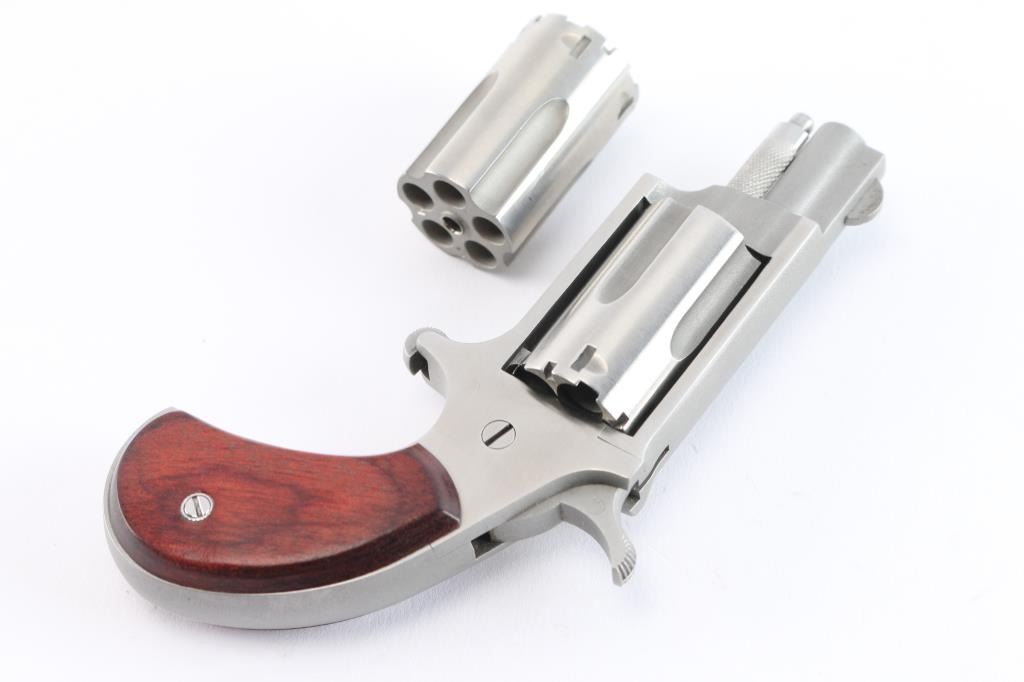 Miniature stainless steel spur trigger single action revolver chambered in .22 Magnum with a swappable .22 Long Rifle conversion cylinder. Manufactured in Provo, UT. Features a matte finish with polished flats, 1.13" barrel, round blade front sight, fluted five-shot cylinder, knurled cylinder pin head with push button release, serrated spur trigger, serrated hammer spur, and smooth laminated rosewood grips. Includes the original factory two-piece cardboard box with matching end label, documents, .22 LR cylinder, an extra set of grips, and black nylon pocket holster. Revolver exhibits minor handling marks with no major wear observed. The action is mechanically sound with good lock-up, the bore is excellent, and the rosewood grips are excellent.