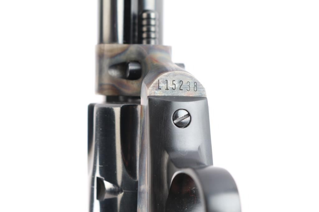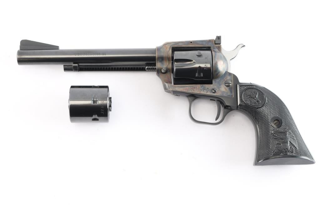 SN: L15238. Single action rimfire revolver manufactured 1974. Features 6" barrel, adjustable sights, side gate loading, ejector rod under barrel, blued finish, case color receiver, black plastic checkered grips embossed with eagles and Rampant Colt emblem. Bore is excellent/bright. Retains 98% finish with slight tracking on the cylinder. Case colors are vivid. Grips are excellent. Action is very smooth with crisp let off, good lock-up. Excellent .22 magnum cylinder included.