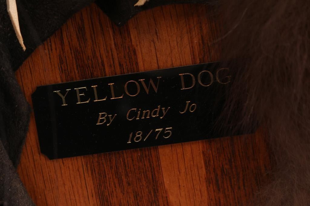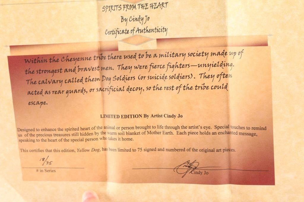 Titled "Yellow Dog", Spirits From The Heart. From the artist: "For more than thirty years, I have immersed myself in the study and creation of Native American art. My love for the narrative beauty of Native American culture, as well as a desire to honor my Cherokee heritage, has driven me to understand and represent the character, strength, and honor of Native American people. I am a self-taught artist, competent in ceramic, clay, bronze, and other mixed media, and I am meticulous in researching and understanding the subject matter I represent with each of my pieces. My intent is always to make my art speak to my audience. If eyes convey emotion, posture portrays movement, and detail portrays a story, then I know my pieces are conveying the stories I wish to tell with each one. My work and business accomplishments have been recognized both locally and throughout the Mountain West. I have been highlighted in magazines such as Cowboys & Indians and Western Art & Architecture, and my various awards and business endeavors have been recognized in local publications such as the Idaho State Journal and the Blackfoot Morning News. I independently owned and operated my own business, From the Heart of Idaho, where I sold my own artwork as well as that of various other local artists. I took great pride in showcasing my talents and providing an avenue for other developing artists to thrive." Comes with Certificate of Authenticity.