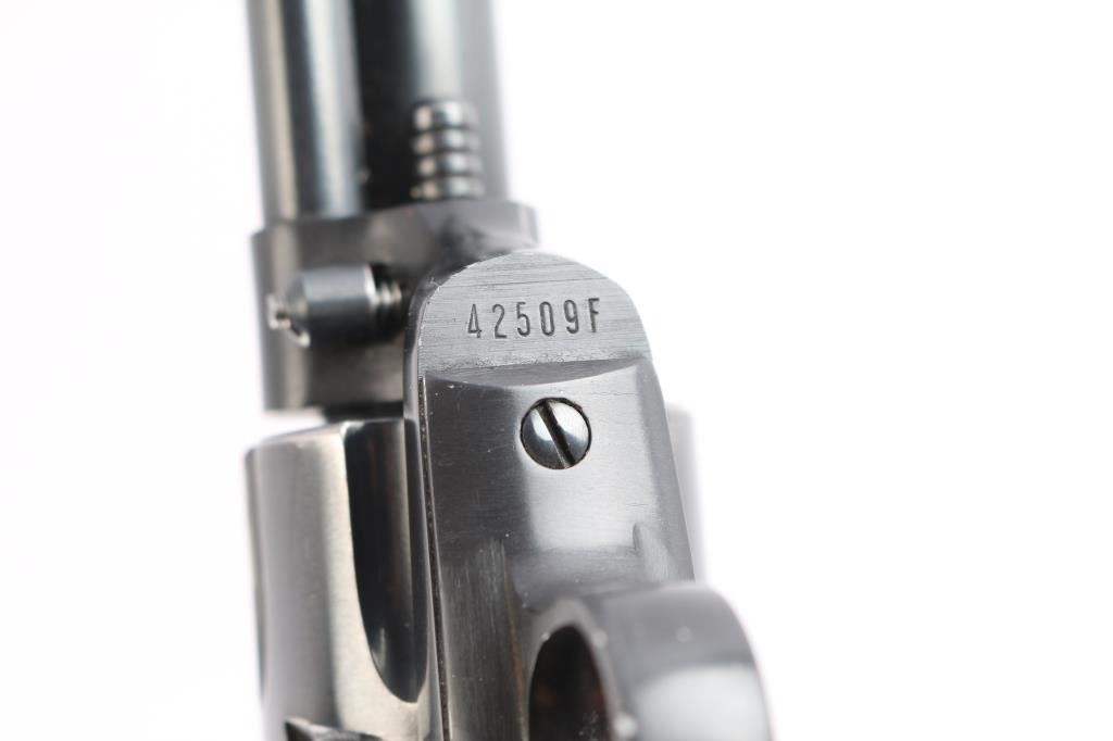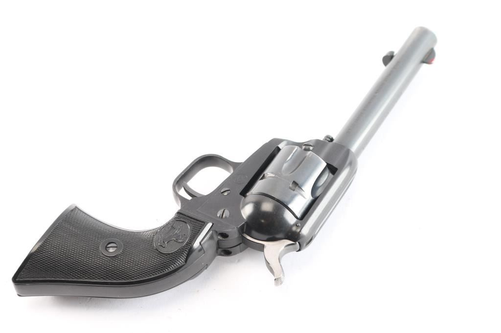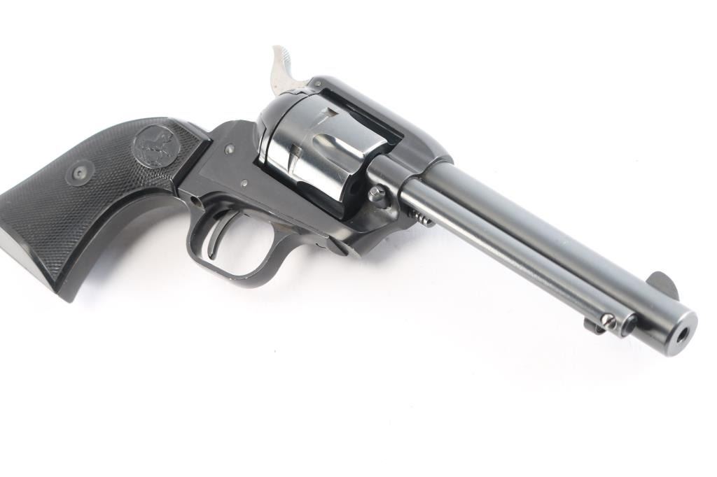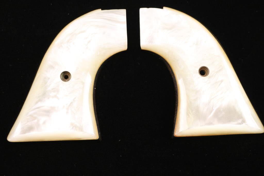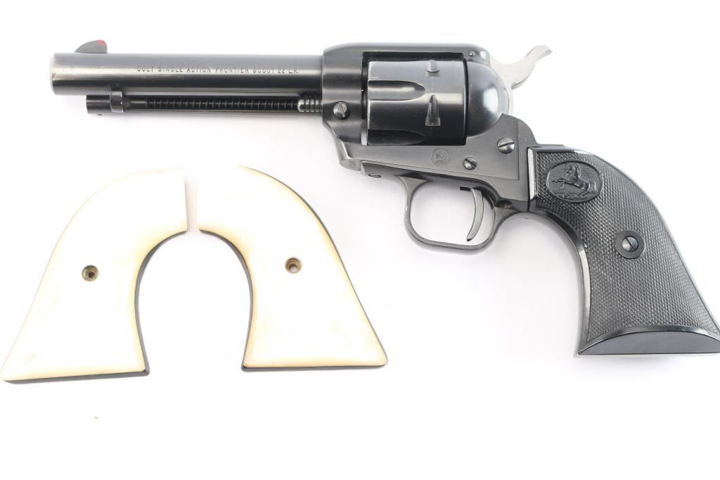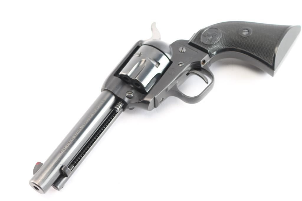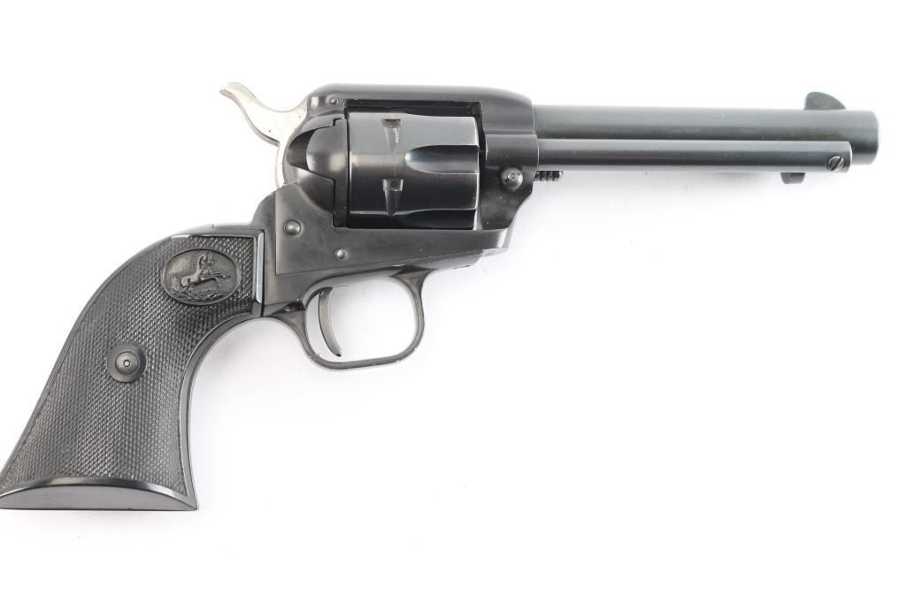 Vintage western style single action rimfire revolver manufactured circa 1958. Scaled down copy of a Colt Single Action Army. Features blued finish, checkered black hard rubber grips with Rampant Colt motifs, 4.75" barrel, fixed sights,front sight has red paint on it. 6 shot fluted cylinder. Bore and charge holes are excellent condition. Retains about 94% original blue with light tracking, edge wear on the cylinder and light muzzle wear. Grips are excellent. Action is smooth/tight. Comes with a very nice set of mother of pearl grips with black wood spacers.