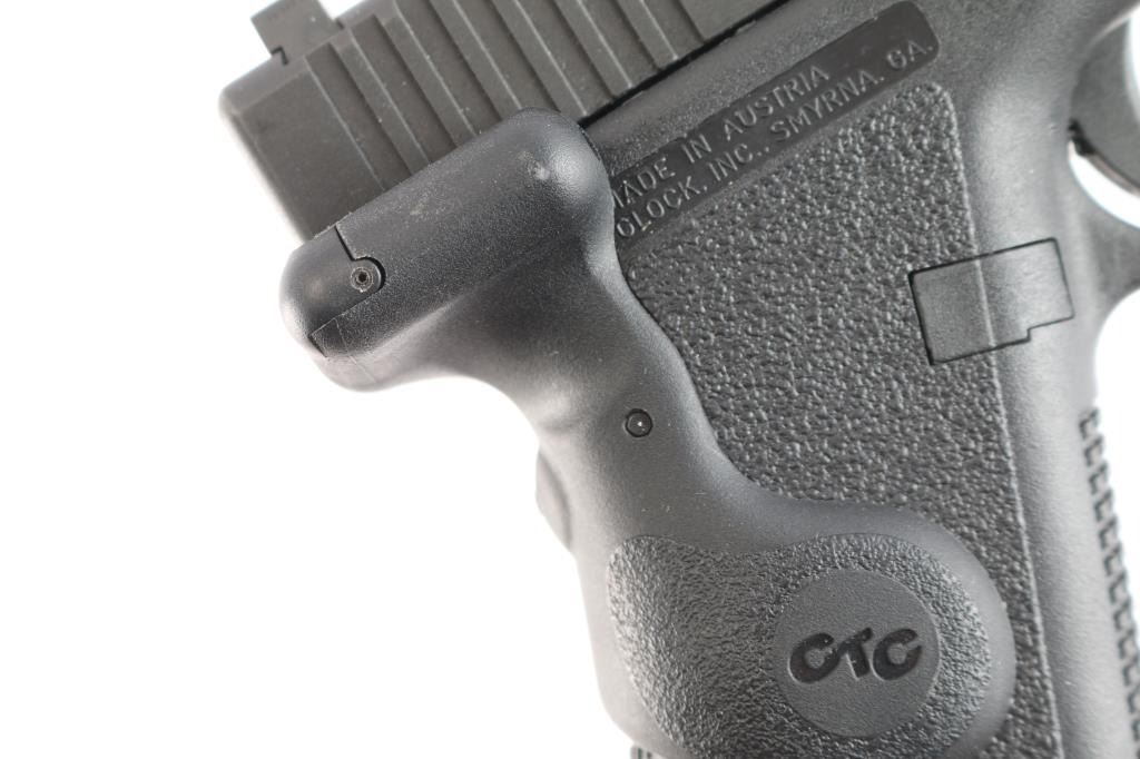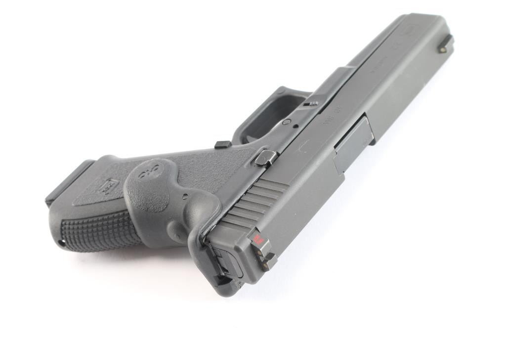 Austrian made full size safe-action semi-automatic pistol imported by Glock Inc, Smyrna GA. Features a black finished slide, 4.49" barrel, full-length guide rod, Meprolight Tru-Dot white dot front sight, dovetailed rear sight with white dot square notch, trigger safety, push button magazine release, factory 14 round magazine, and durable black polymer frame with integral accessory rail & knurled straps grip. Right grip mounted Crimson Trace red laser sight, pressure activated, in good working order. Overall condition is like new with few signs of handling or use. Bore is pristine. Includes four spare 14 round magazines (total of 5 14 rd), and two factory 10-rd magazines, (total of seven magazines), lock, manual, cleaning gear. factory plastic case with matching label.