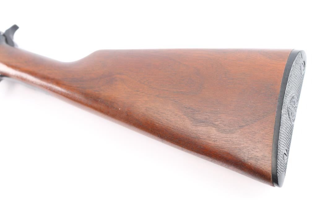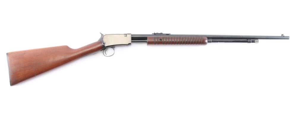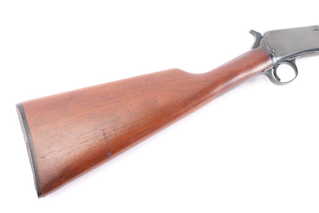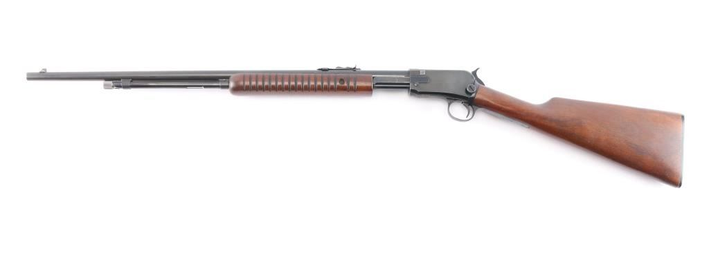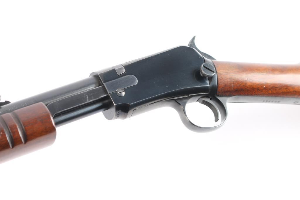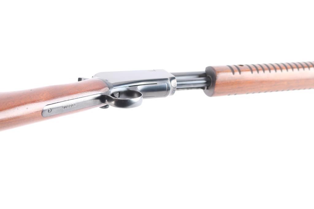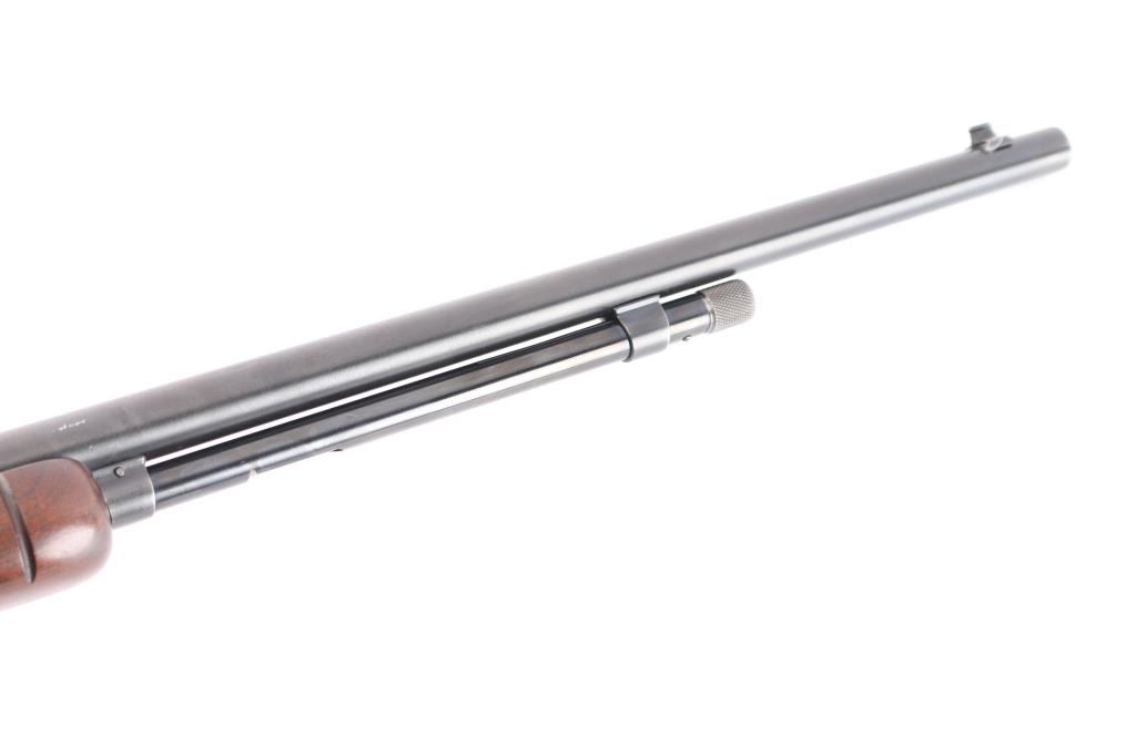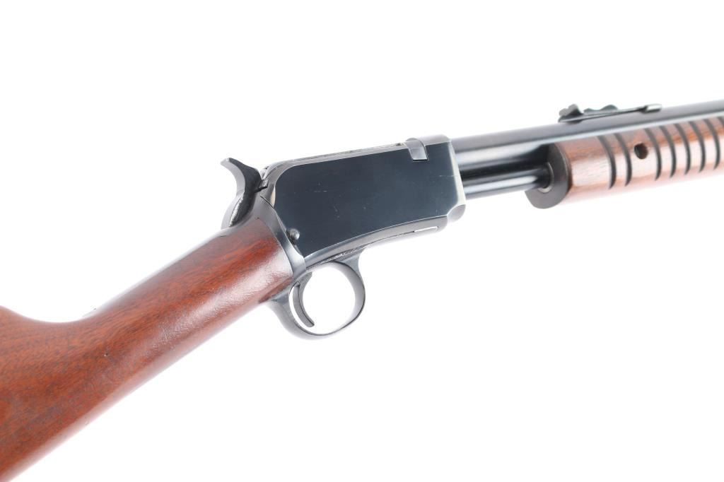 American made slide action, rimfire rifle chambered for .22 Short, Long and Long Rifle cartridges, circa 1954. It sports a 23" round barrel with 3/4 magazine tube, a blued finish, dovetailed blade/bead front sight, adjustable rear sporting sight, take-down receiver, serrated hammer spur, smooth trigger, grooved walnut slide handle and smooth straight grip shoulder stock with factory hard rubber buttplate. Bore is excellent, bright, strong rifling, blue finish is about 95% with some very minor scratches, edge wear, slight friction wear on the action bar and a couple of minor scuffs, wood is near excellent with some minor scratches/scuffs, action is crisp/smooth. Matching serial number on receiver, & lower tang. Winchester markings are crisp/sharp.