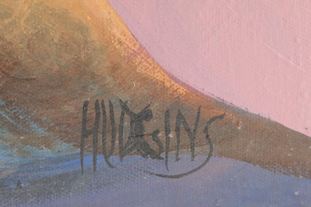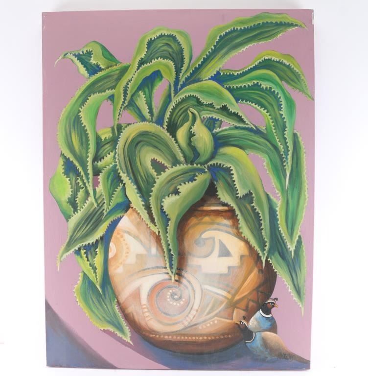 Titled "Agave II", by Native American artist Mary Margaret Hudgins. Signed lower right corner. Measures 40" by 30". Slight damage to paint in upper corners.