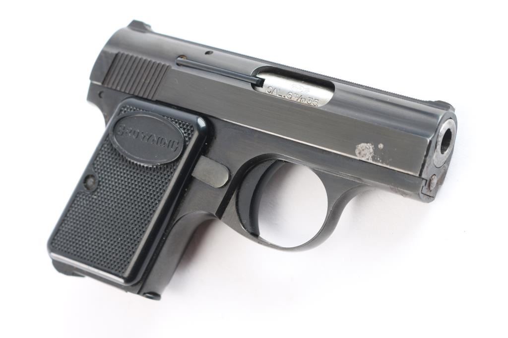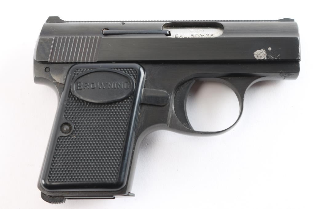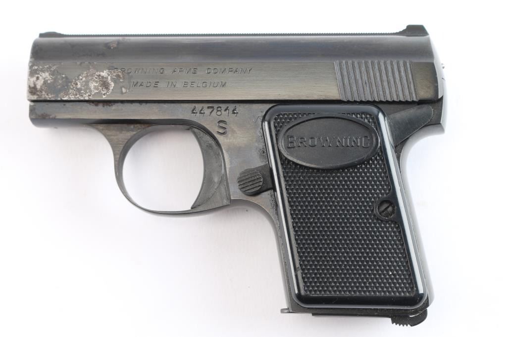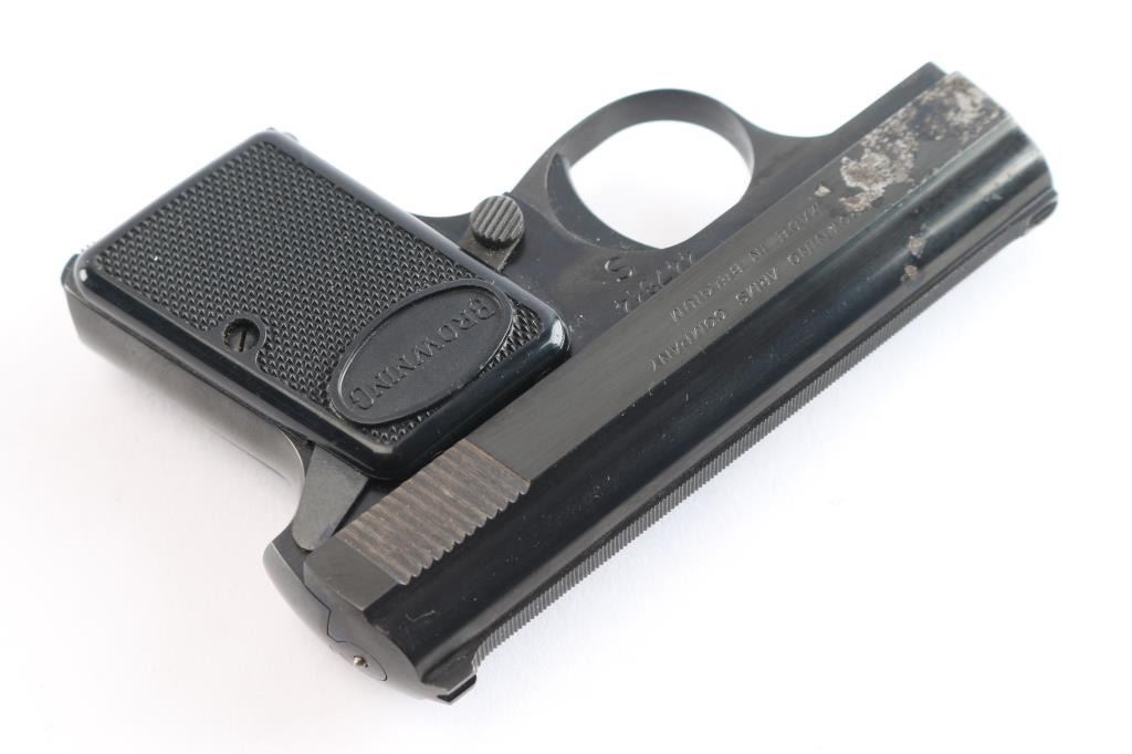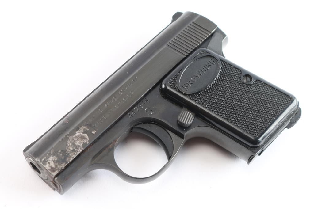 Belgium made striker-fired semi-automatic pocket pistol chambered in .25 Auto. Manufactured circa 1968. Features a blued finish, 2" barrel, fixed sights, smooth trigger, cocked indicator on the rear of the slide, thumb safety on the left side of the frame, magazine disconnect safety, heel magazine release, 6 round magazine, and two-piece checkered black plastic grips with Browning motifs. Pistol retains approximately 85% of its original finish with surface rust and pitting on the front. The action is sound, the bore is excellent, and the synthetic grips are very good+ with minor wear.