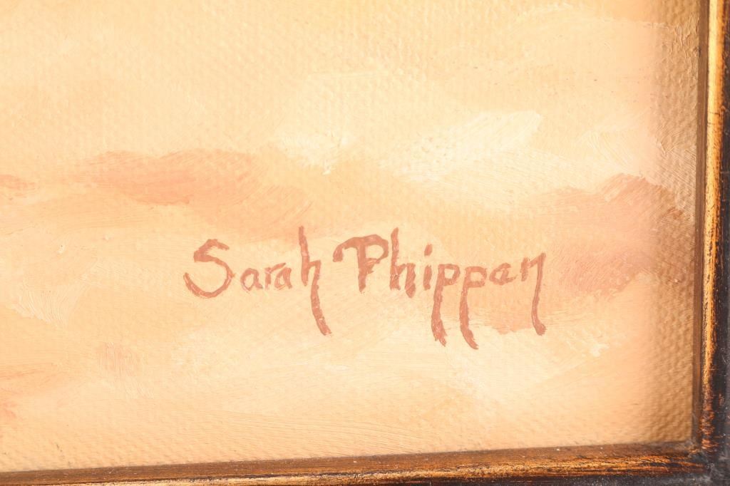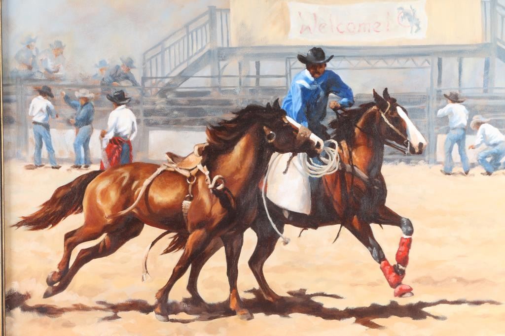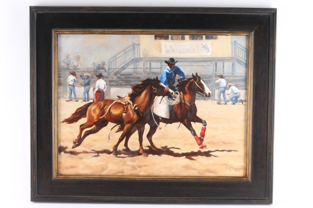 Entitled "After the Ride", by Sarah Phippen, dated 2008. Rodeo scene from a Colorado rodeo. Sarah Phippen is an artist who specializes in portraying the West through her paintings. She is the granddaughter of the famous artist George Phippen and has studied under several prominent artists. In 2013, she was honored with the Joe Beeler CA Foundation Award at the Phippen Museum Western Art Show and Sale. Measures 24" x 30" in a black antiqued frame; painting measures 18" x 23". Signed lower right corner.