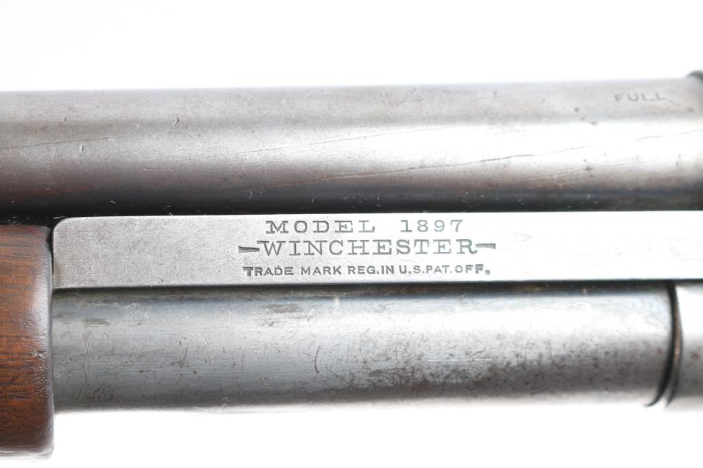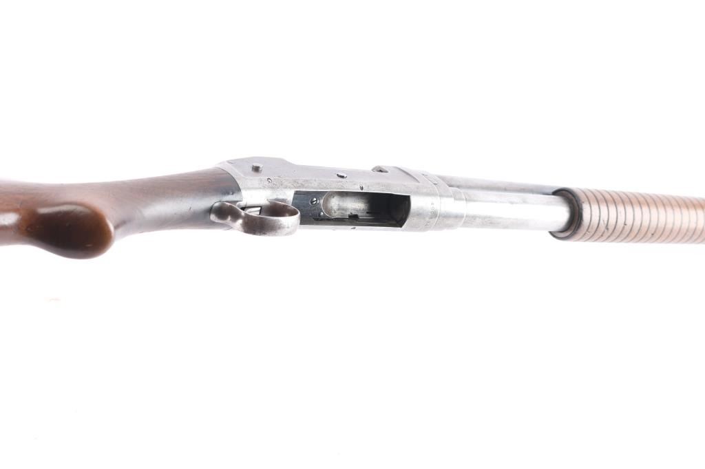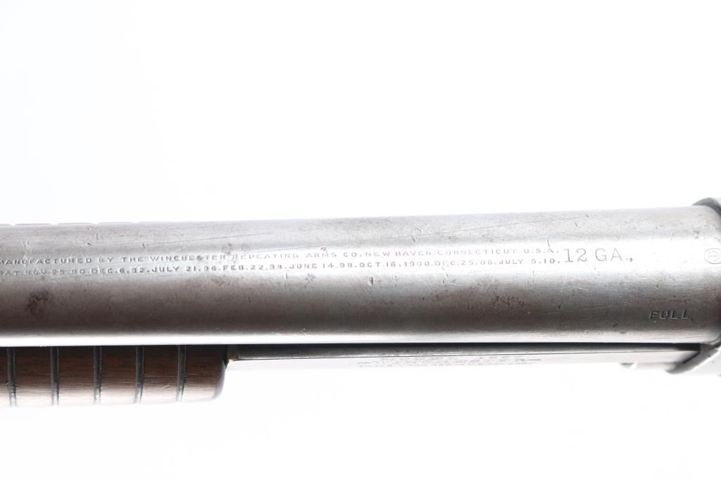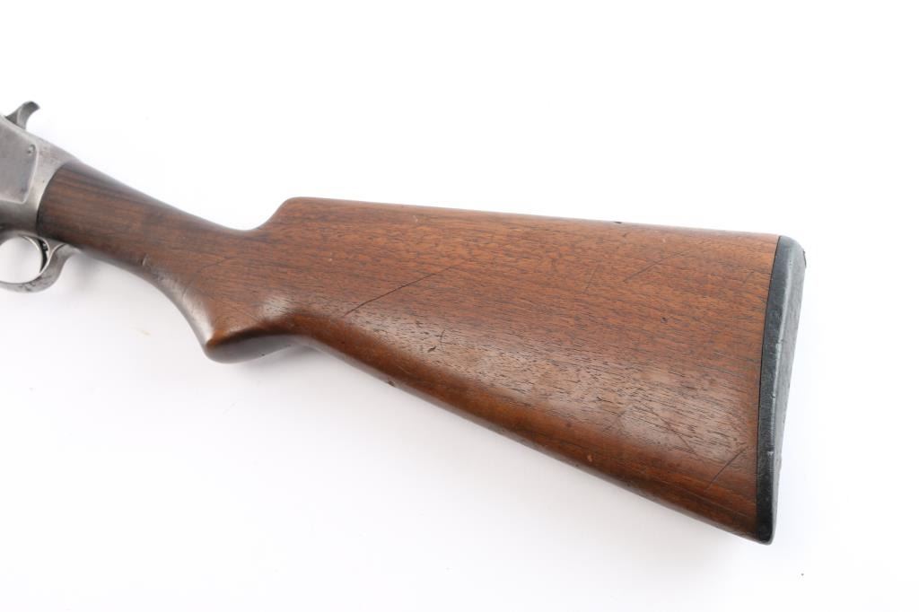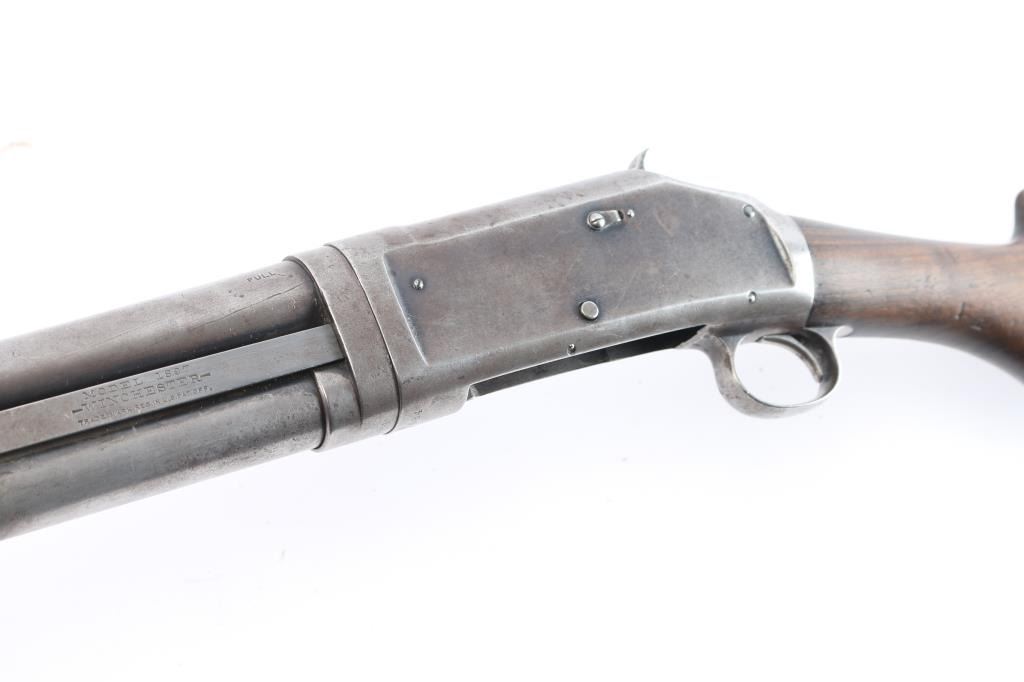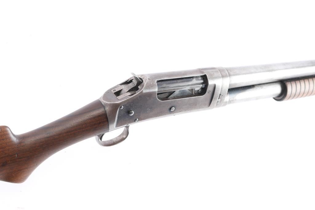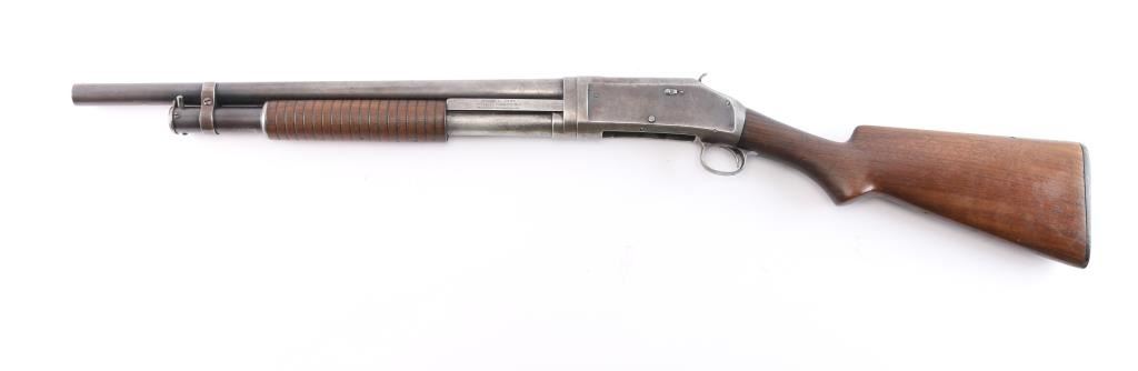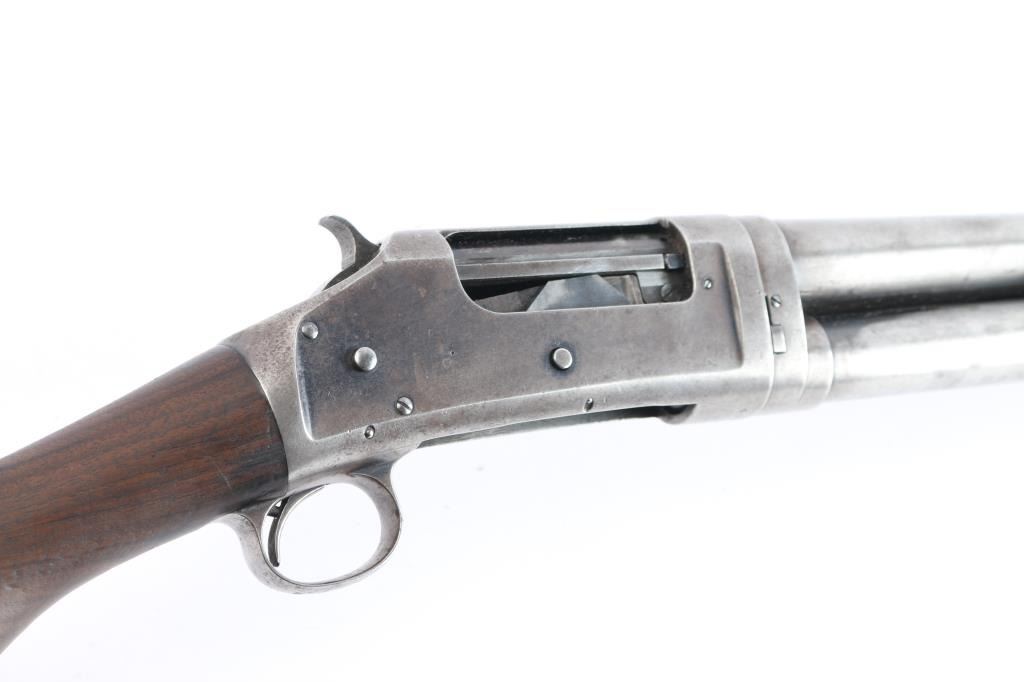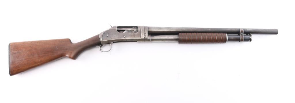 'Take Down' Vintage pump action shotgun features blued finish, grooved walnut pump handle, smooth walnut stock, plain hard rubber buttplate, 20" barrel (marked "FULL", now measures "IC", appear cut down), bead front sight, knurled hammer. Bore is good condition, a bit dull, needs cleaning. Finish is mostly a thin dull brown color with much bare metal showing, some darker color in protected areas. Wood is solid condition, butt is possible an older replacement.