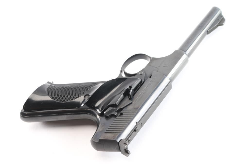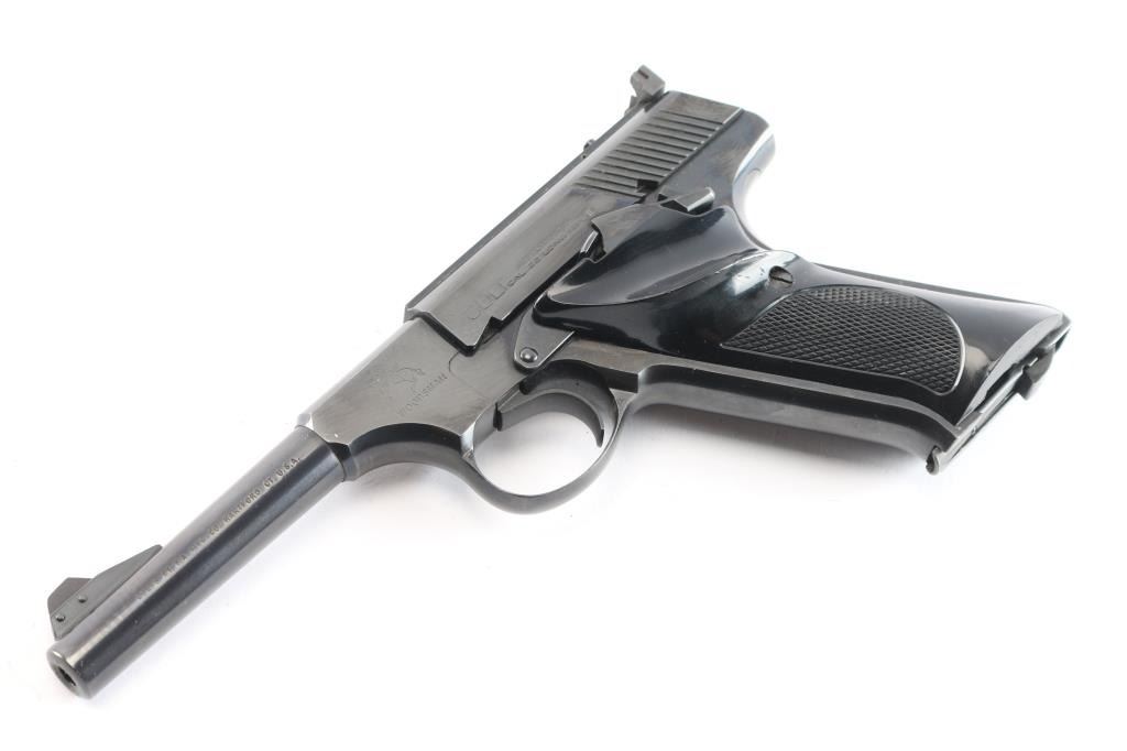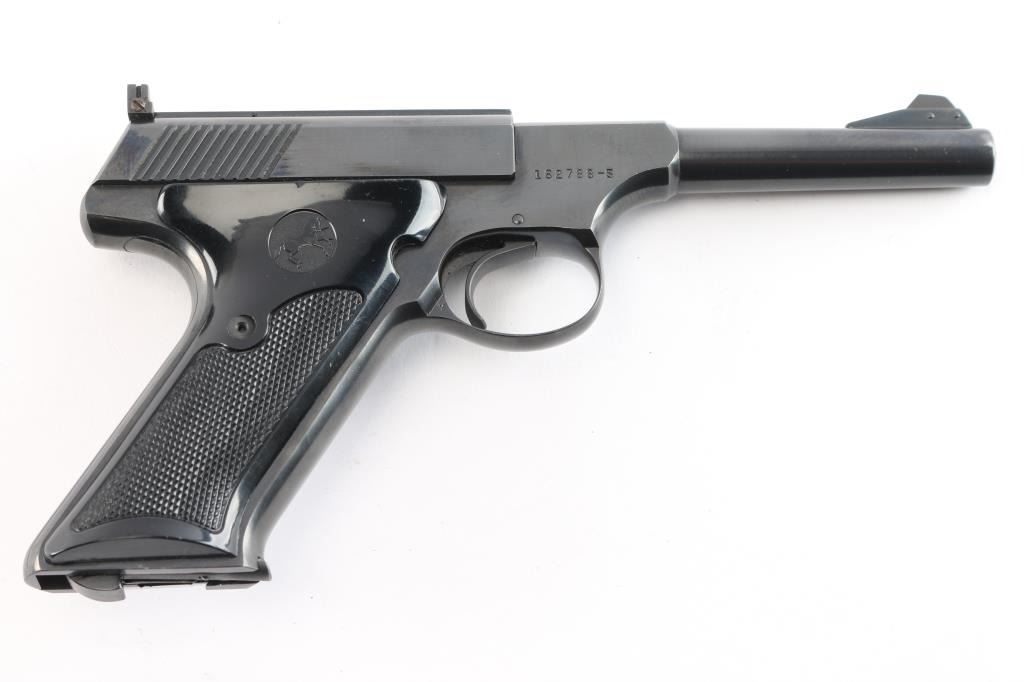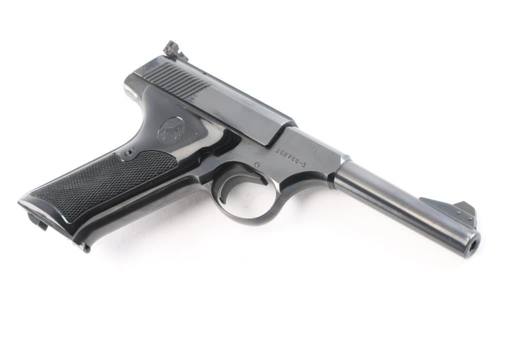 Vintage semiautomatic rimfire pistol manufactured circa 1956. Third Series 'Sport Model". Features blued finish, black checkered bakelite grips with Rampant Colt on right panel, thumb rest on the left, 4.5" barrel, pinned, serrated, blade front sight, adjustable square notch rear sight, heel magazine release, slide stop,manual safety. Bore is excellent/bright. Retains 98% original blue, with minor edge losses, slight muzzle wear. Grips are excellent condition. Includes (1) Colt marked magazine.