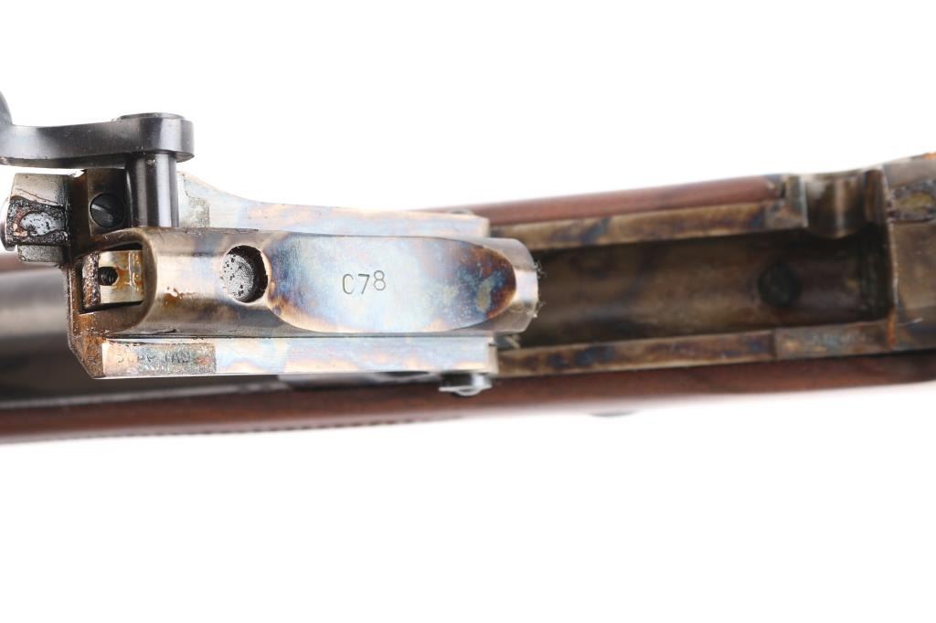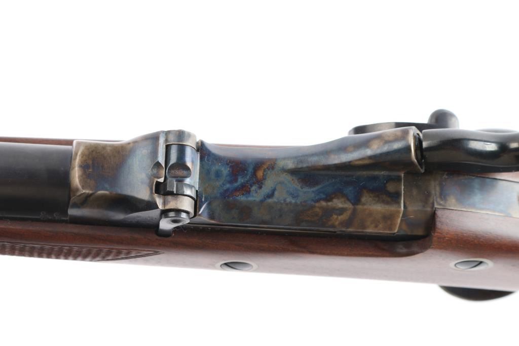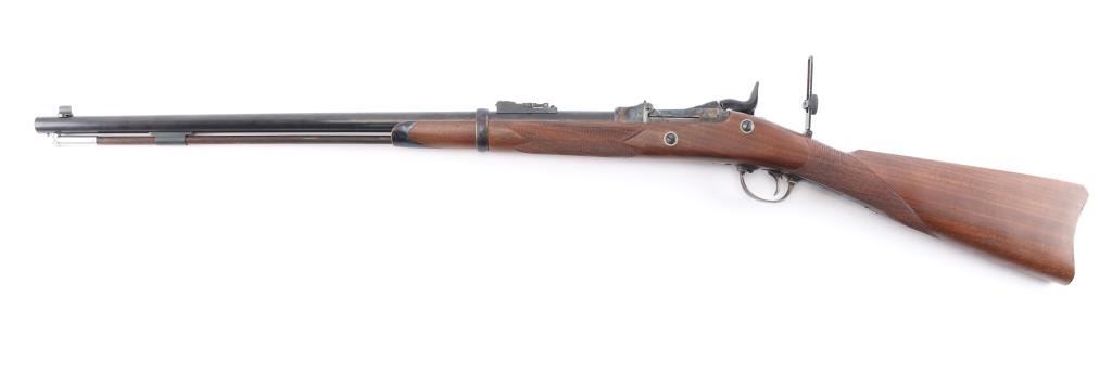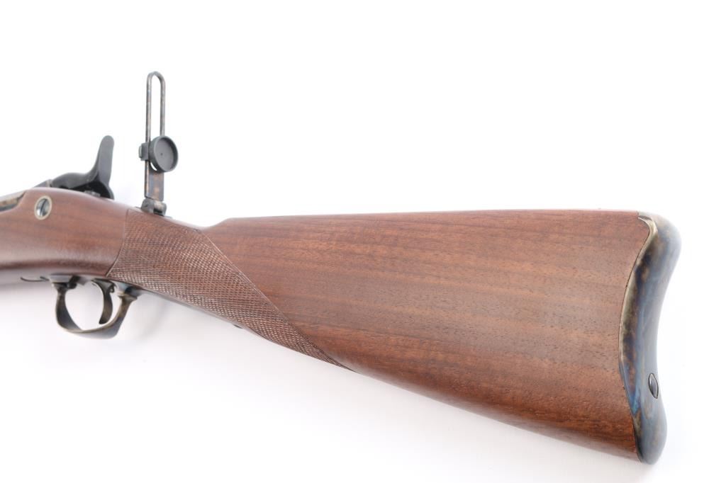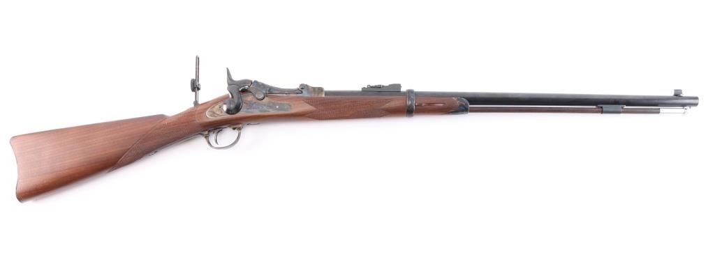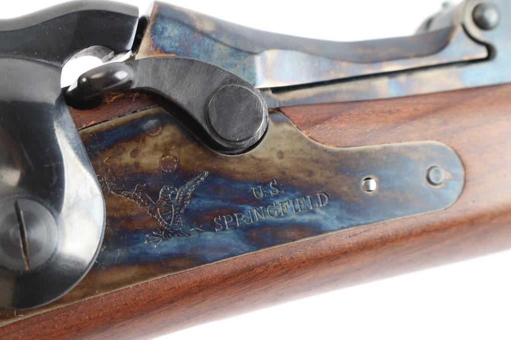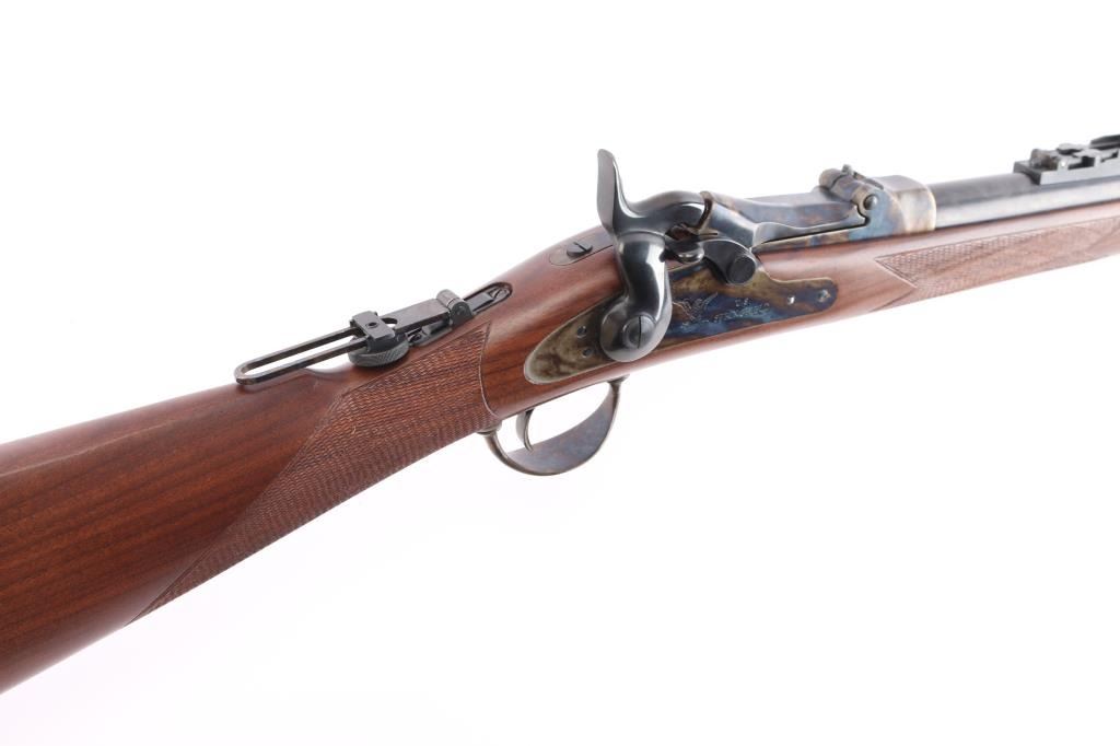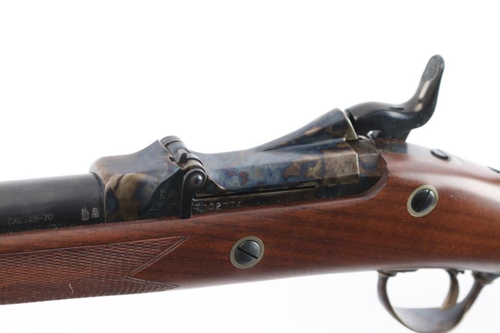 'Officer's Pattern' Italian made reproduction of the Springfield 1873 Officers Model trapdoor rifle chambered in .45-70 Government circa 2006. Features a blued/case hardened finish, 26" round barrel, dovetailed blade front sight with brass bead, adjustable ladder rear sight, adjustable flip rear aperture sight mounted on top of the wrist, wood cleaning rod with aluminum tip, smooth trigger, checkered hammer spur, case colored forend cap and checkered walnut stock with case colored metal buttplate. Has correct markings on lock plate. Rifle exhibits vivid case colors and approximately 99% of the blued finish on the barrel. Action is sound, bore is excellent/bright and wood stock is excellent.