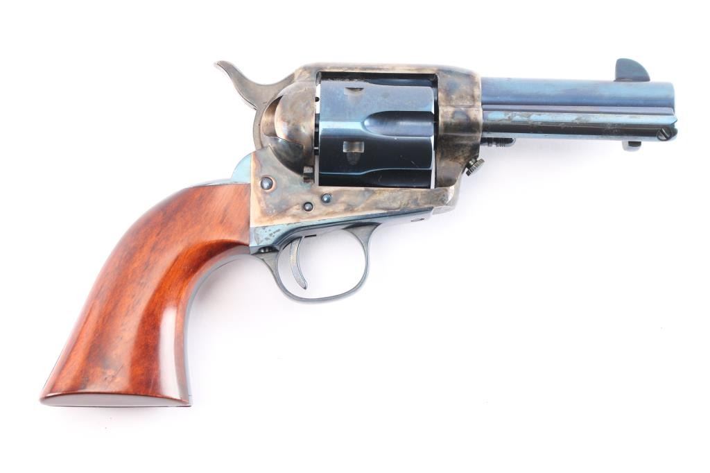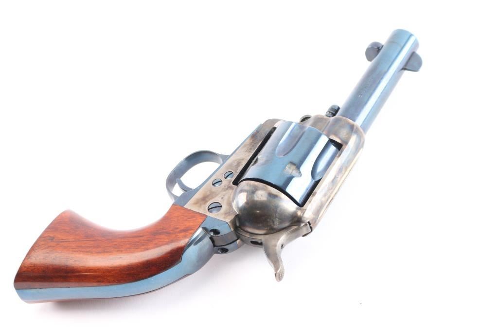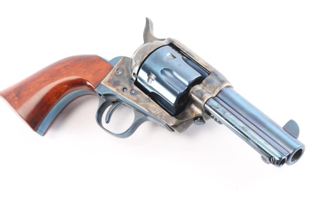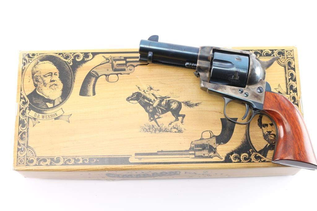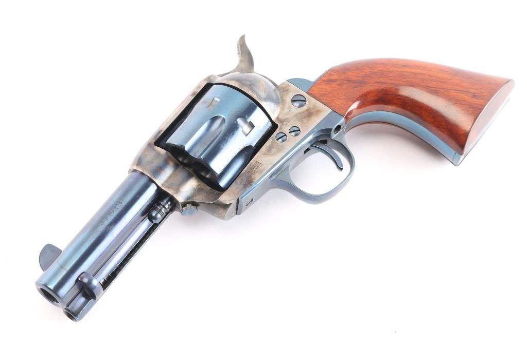 Italian made (2001) single action six-shot revolver imported by Cimarron of Fredericksburg, Texas. Close copy of the Colt 1873 Single Action Army, chambered for .44-40. Features blued finish (with case colored frame, loading gate, hammer), 3 1/2" barrel, blade front sight, U notched rear sight, smooth thin trigger, knurled hammer spur, fluted cylinder, ejector rod, thumb screw cylinder pin retaining screw . Cylinder numbered "5807" with matching number on loading gate. Overall condition is excellent with few signs of handling, bore is excellent, action is crisp, and the blue is very good with a couple of minor scratches. Includes a Cimarron factory box matching label, manual, & documents. In cardboard shipping box.