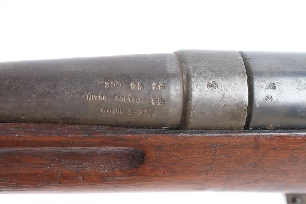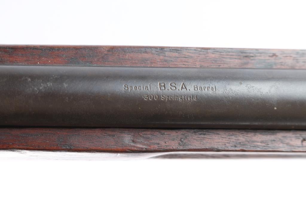 Romanian military bolt action rifle modified to accept 22 long rifle ammunition. Barrel has been sleeved and the bolt modified, and a small ejector block installed in the receiver wall. British proofed. Top of barrel marked "BSA / 300 Springfield". Front sight has been ground down, and no rear sight is present. Latch and other small parts in the Mannlicher type magazine system for clip loading have been removed. Bore is bright and shiny. Metal shows a uniform dark brownish color faded blued finish, with cleaned patina on magazine. Wood is mostly good condition, with large chip broken out of side of front end. No hand guard.