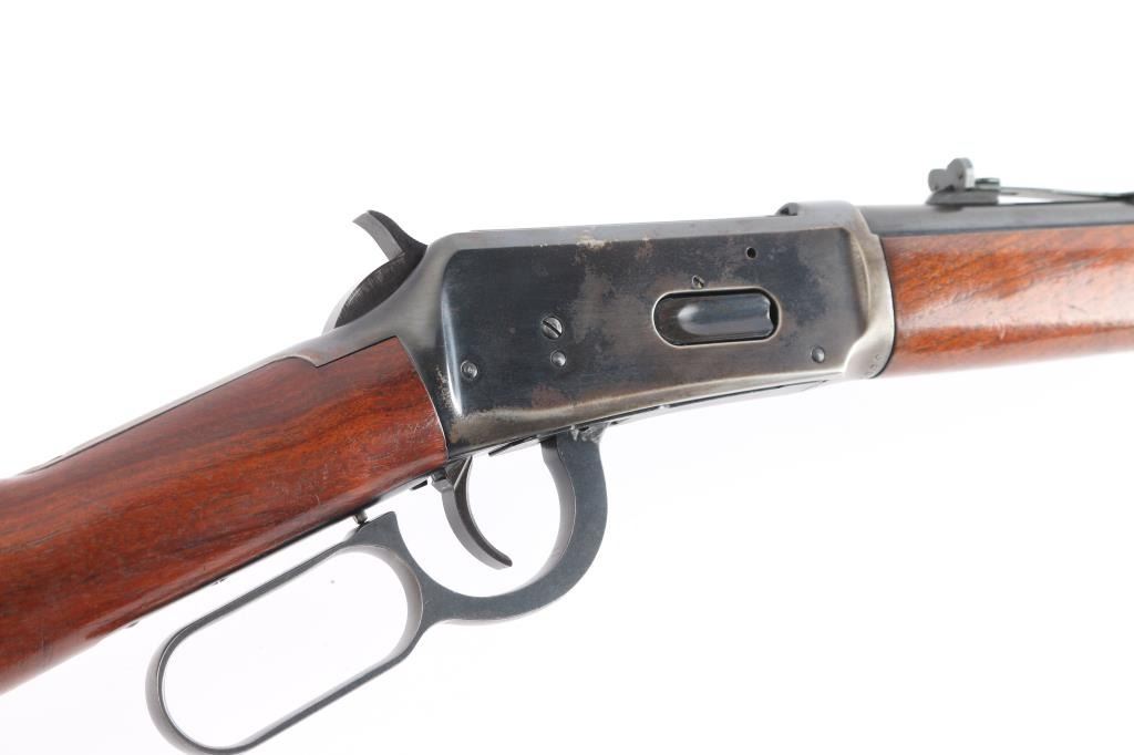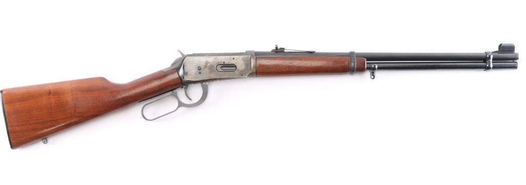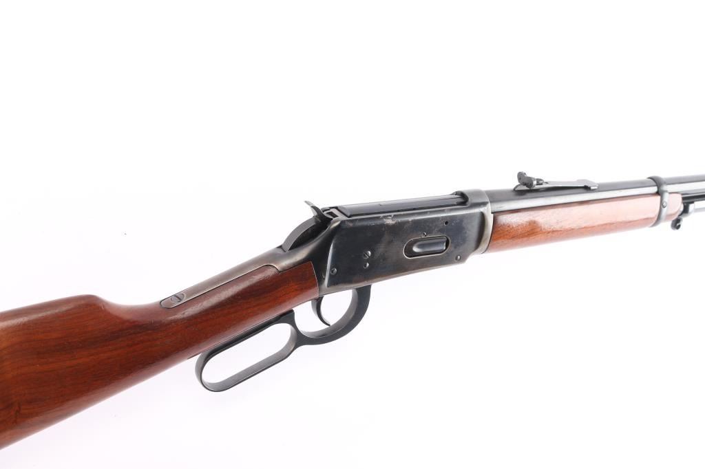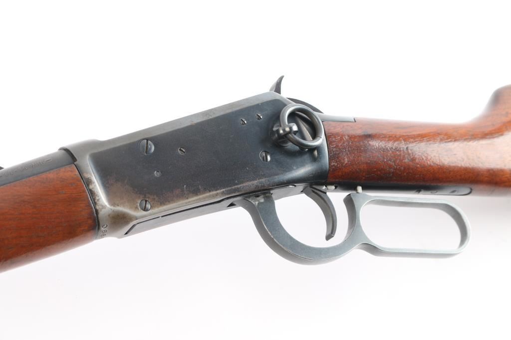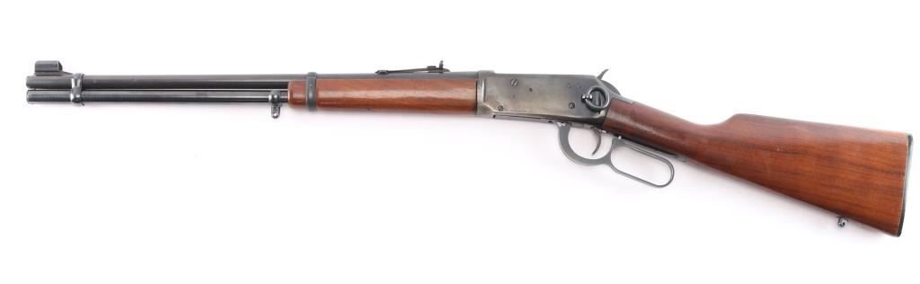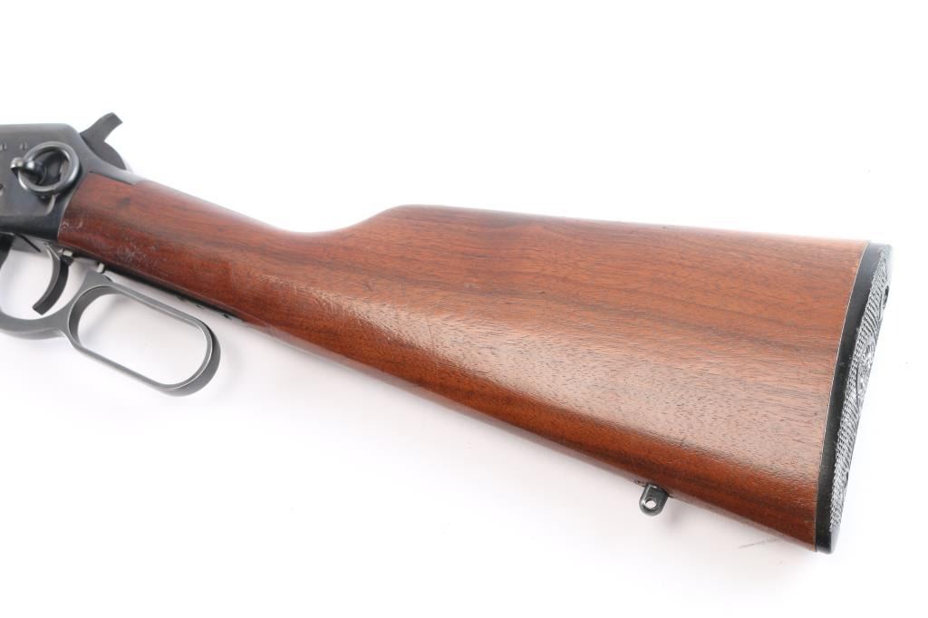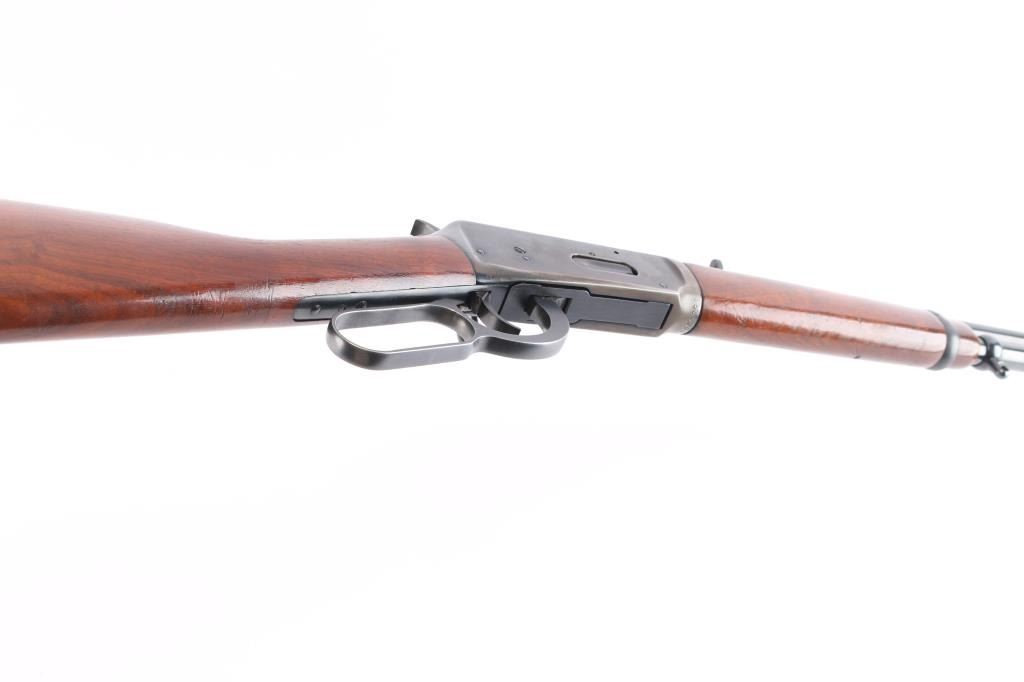 SRC 'Saddle Ring Carbine' Vintage lever action repeating rifle, manufactured in New Haven, CT circa 1971. Features a blued finish, 20" tapered barrel, full-length tube magazine, hooded blade/bead front sight, sporting rear sight, smooth trigger, serrated hammer spur, steel receiver, sling studs, two barrel bands, saddle ring, lever grip safety, smooth walnut forend and straight grip shoulder stock with checkered black plastic Winchester buttplate. Bore is excellent/bright. Retains about 70% finish, with moderate to heavy losses on receiver & tang, much dark original blue on barrel and mag tube. Receiver sides show some bare metal, much mottled brown or plum color with slightly scaly texture from patina or light pitting, with dark bluing retained in rear scallops. Wood is very good condition with minor scratches. Action is crisp/smooth.