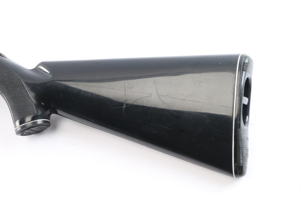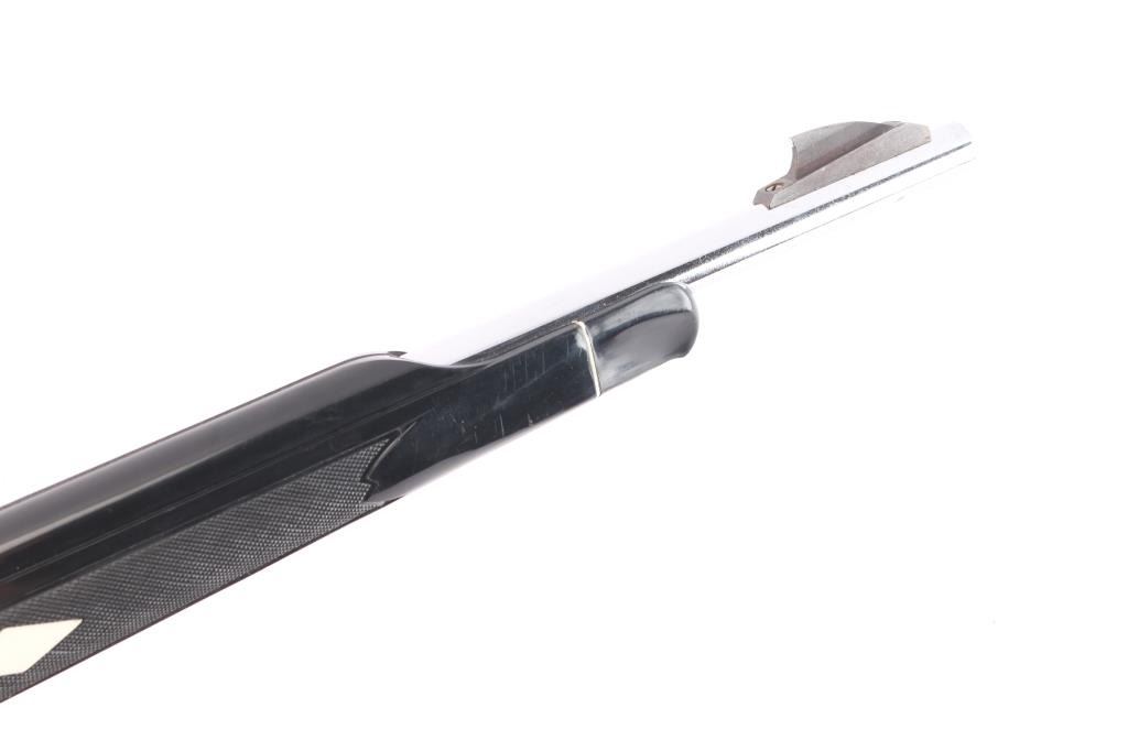 Apache Black, manufactured 1962-84. Chrome plated barrel, and receiver. Black polymer/nylon, checkered, pistol-grip stock. White diamond and white spacers on caps, and butt plate. 19.5" barrel, with adjustable open sights. Bore is excellent/bright, Light-weight at 4 lbs. magazine fed by a 14-rd tubular magazine located in the stock. Chrome finish is very good, with some slight scratches present. Stock is very good, with minor scratches/scuffs present. Action is smooth/tight. Manufactured 1969.