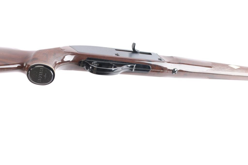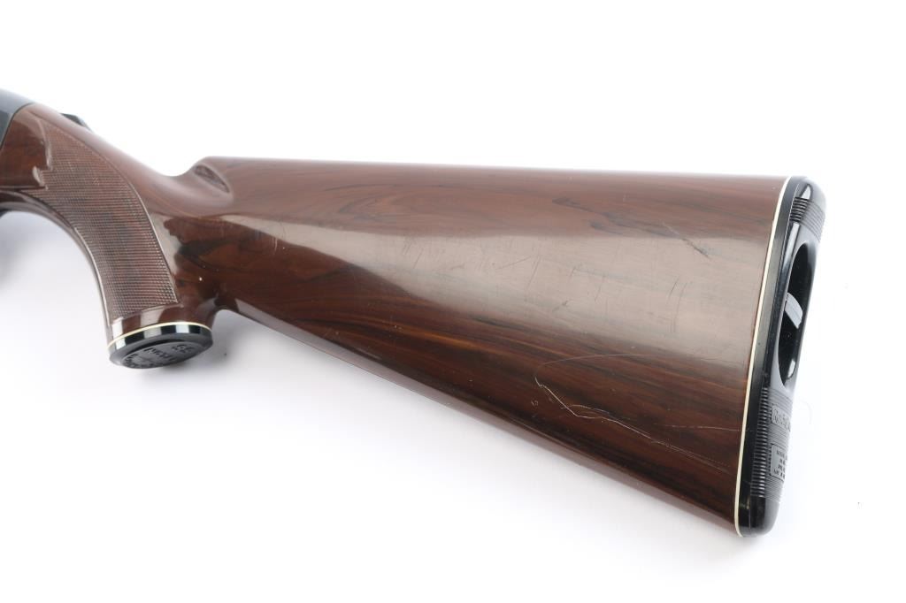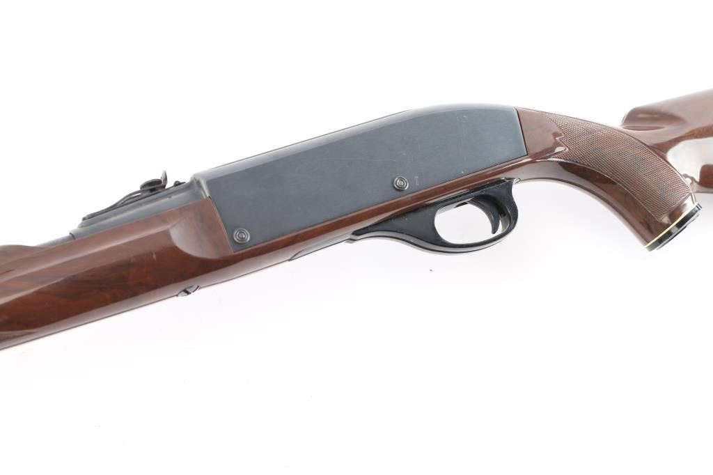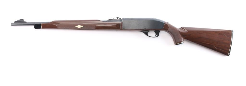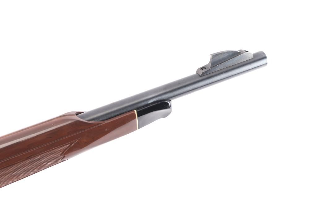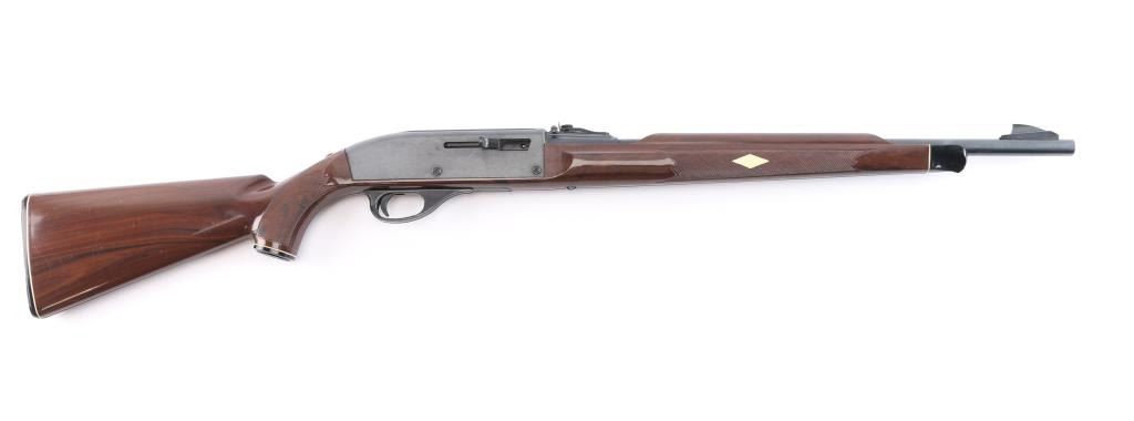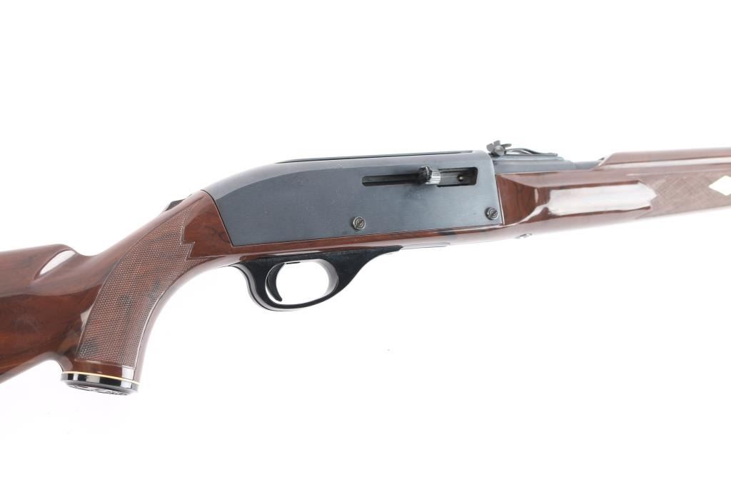 Semiautomatic rimfire rifle. Barrel code dated 1986. Features blued finish, "Mohawk Brown" polymer stock, 19.5" blue barrel, large blade front sight, adjustable rear sight, sliding tang safety, tube magazine in butt, grooved trigger, plastic trigger guard and integral scope base machined into receiver. Bore is pristine. Retains about 98% finish on blue finish with minor scratches, stock is near excellent with very light scratches.
