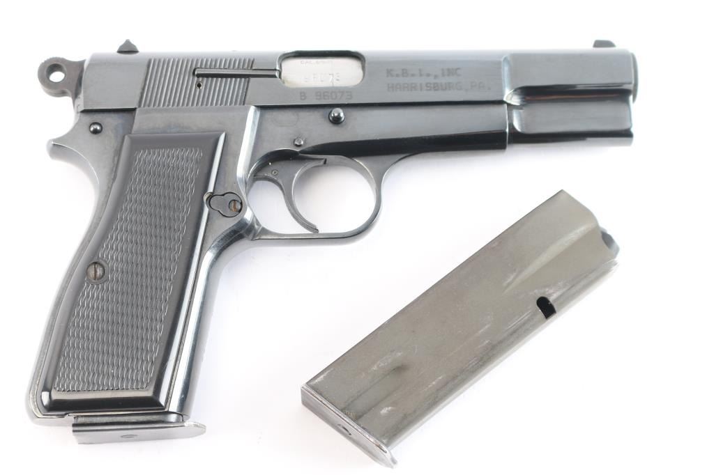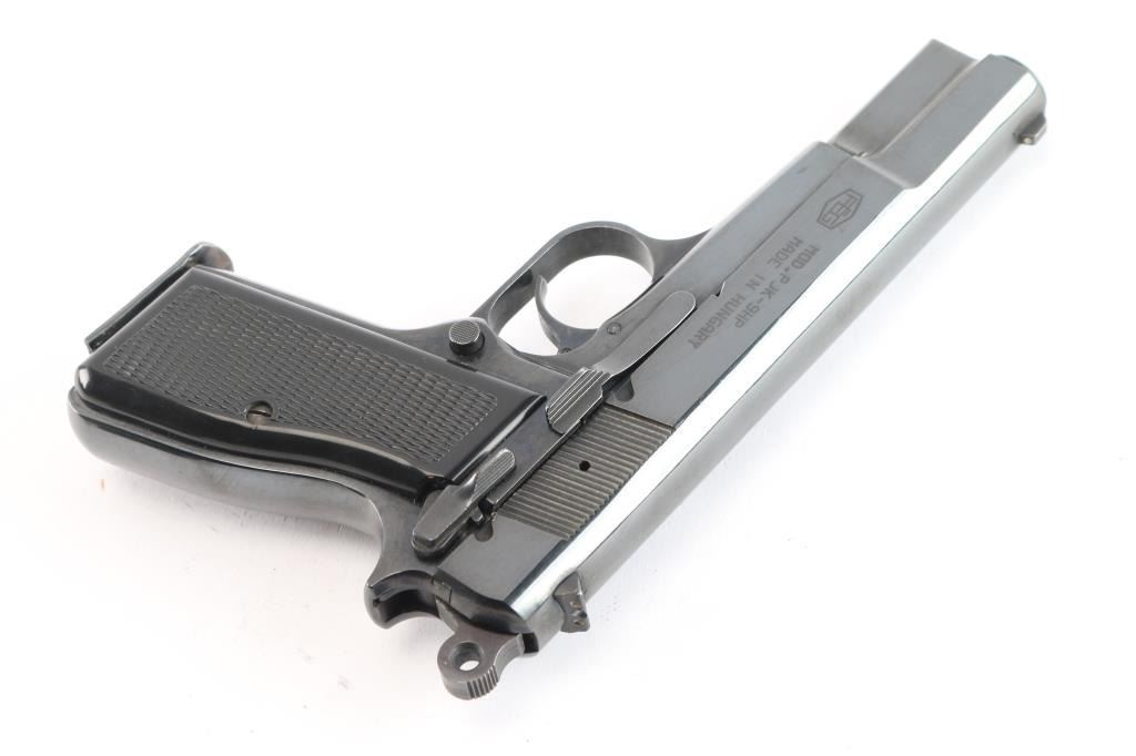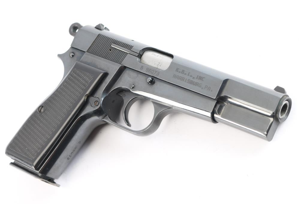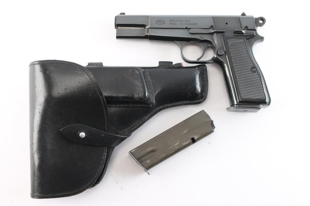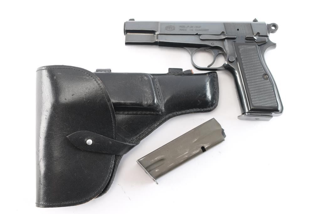 Semi-automatic, single-action trigger. 13+1 capacity. Manufactured by Fegarmy Arms factory in Hungary. An almost exact copy of the Browning Hi-power pistol. manufactured 1980-2011. Recoil operated. Frame mounted safety. Fixed open, 3-dot sights. 7.8" overall. 4.65": stainless steel, ramped barrel. Polished blue steel finish, with black plastic checkered grips. Imported by K.B.I. PA. , marked on the left frame. Comes with two 13-rd magazines and a military/police Chinese made black leather flap holster. Slide action is smooth/tight. Bore is excellent/bright. Blued metal finish is about 97%, with some minor scratches. Grips are excellent.