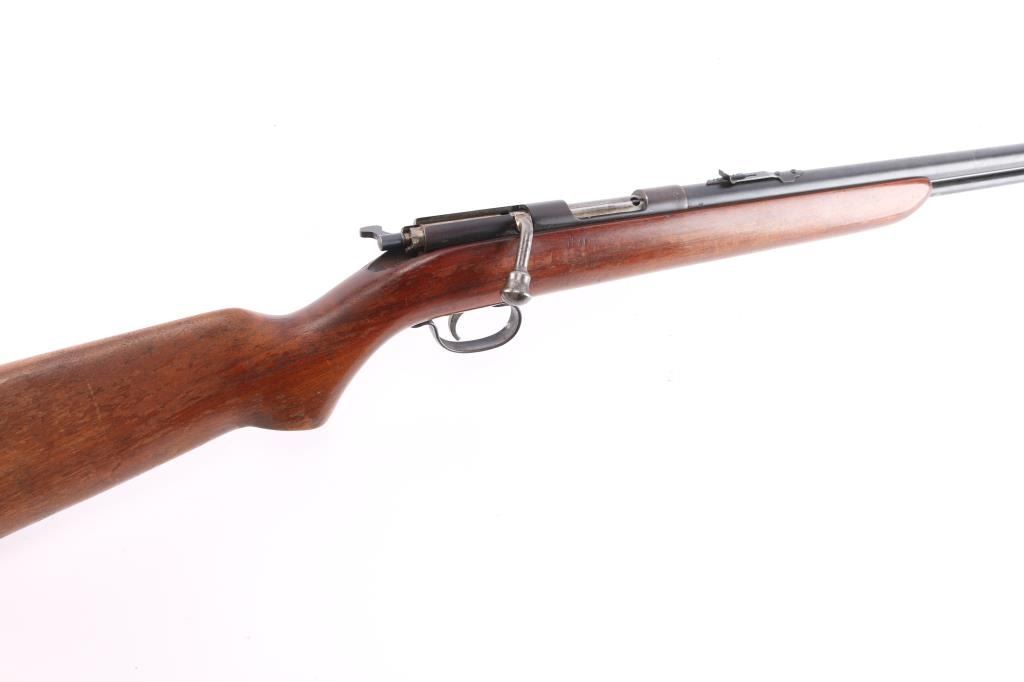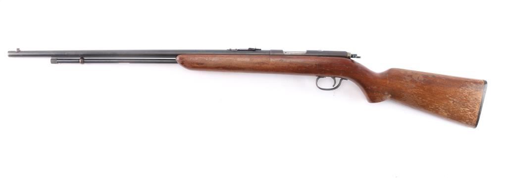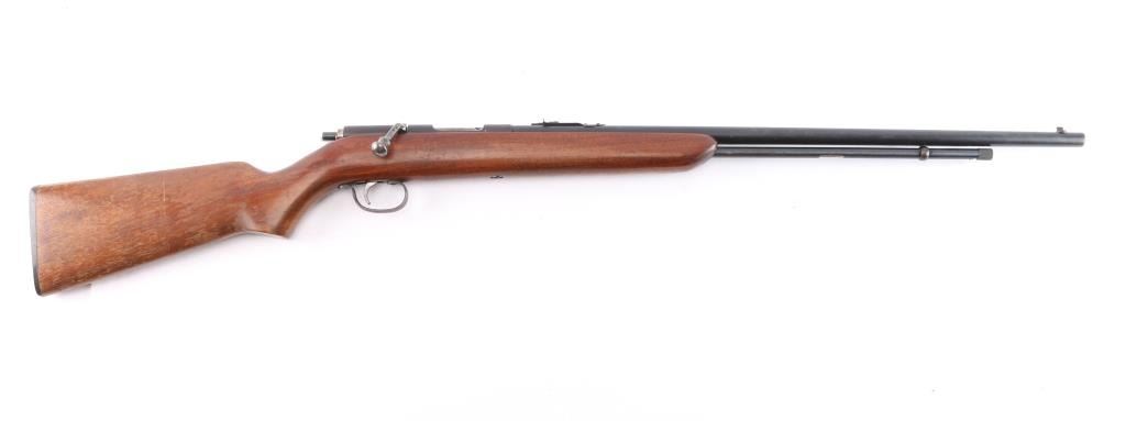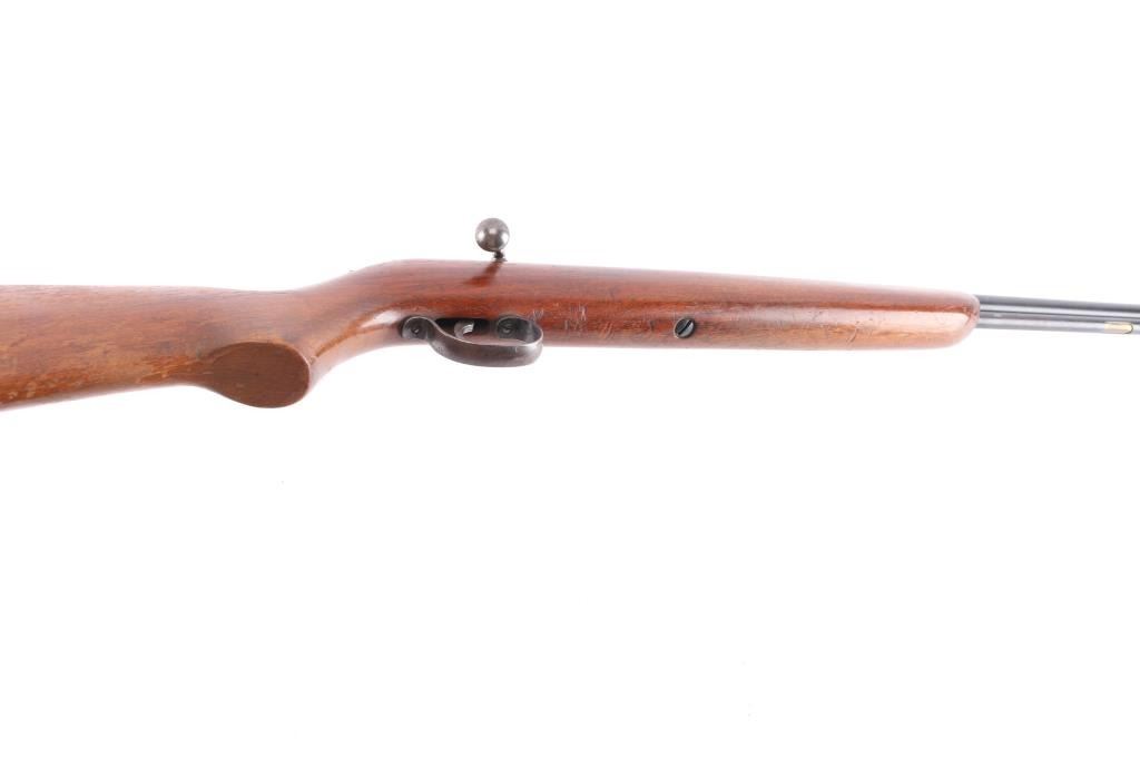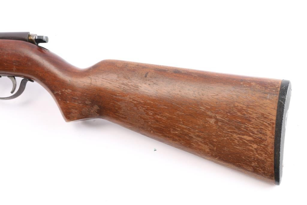 'The Sportsmaster' Vintage tube-fed bolt action sporting rifle chambered for .22 Short, Long & Long Rifle, manufactured in Ilion, NY circa 1936-1940. Features a blued finish, 24” barrel, 15 round tube magazine, blade/bead front sight with post insert, adjustable rear sporting sight, smooth trigger stamped steel trigger guard, turned-down swept back bolt handle, two-position flag safety on the rear of the bolt and smooth walnut semi-pistol grip shoulder stock with factory buttplate. Blue has dulled with age, about 80% with handling wear, chamber is turning a brown patina, action is sound, the bore is good/bright and the wood stock is sound with minor scratches/scuffs and a lot of finish loss from handling. Date code DF. (1937)