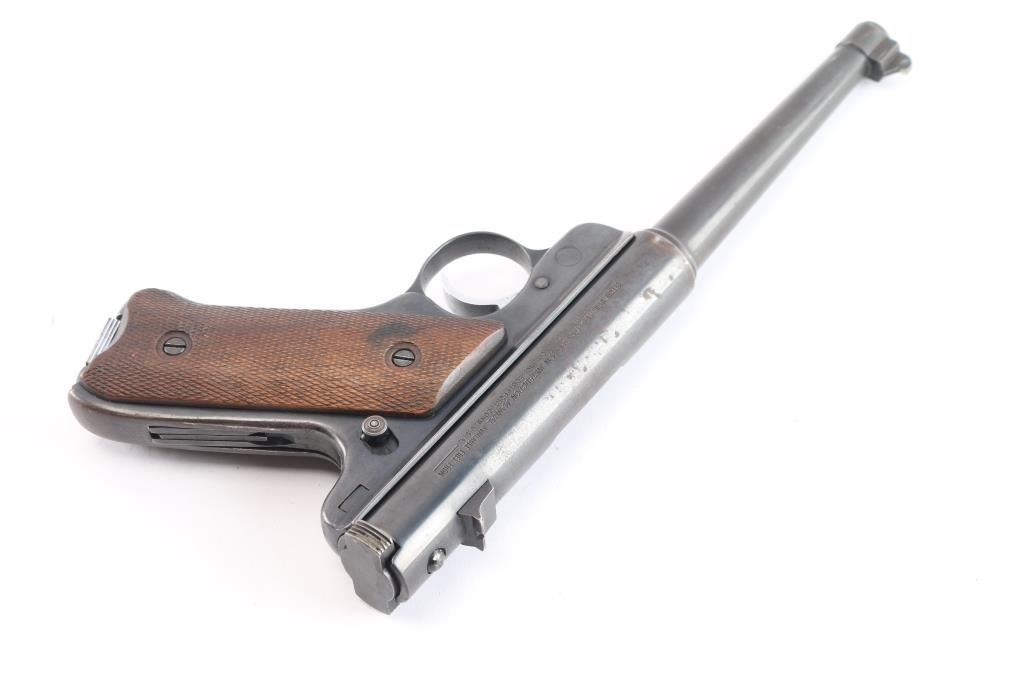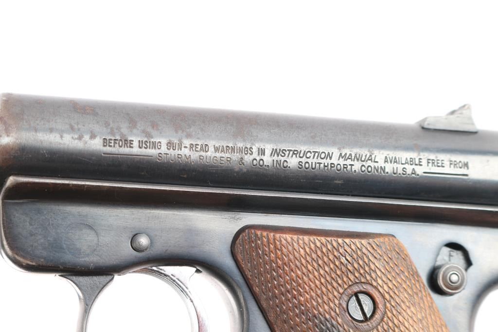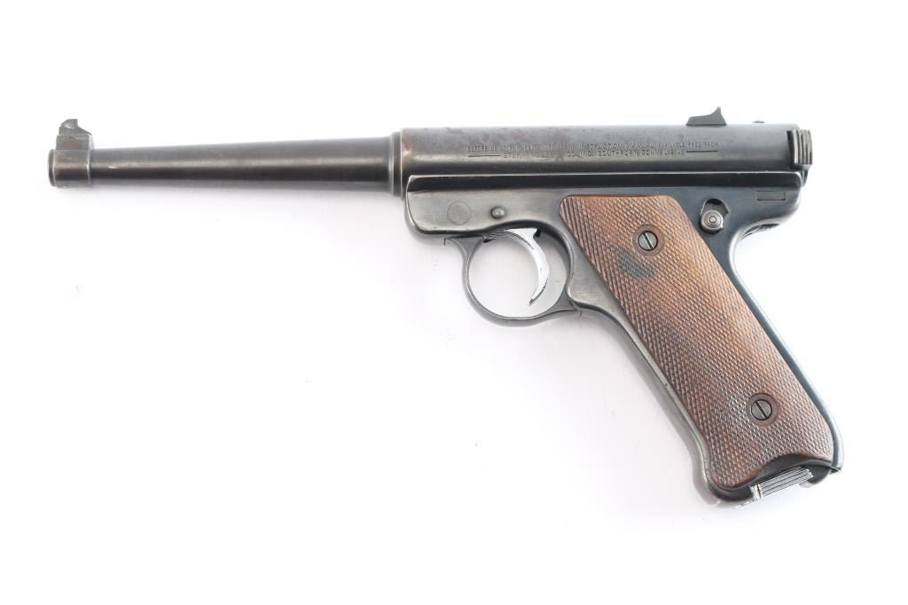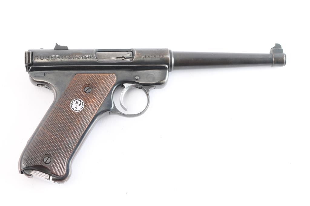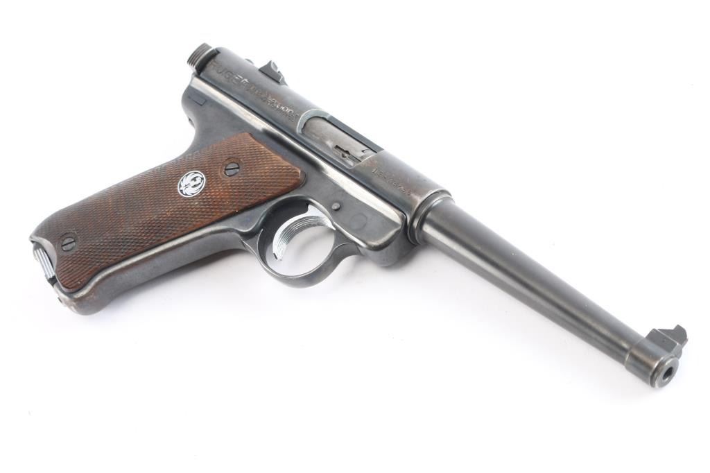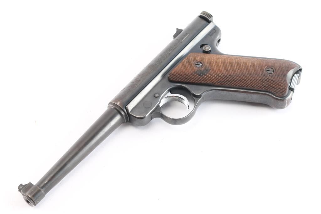 American made semi-auto blued pistol chambered for .22 long rifle ammunition, manufactured circa 1978. It has 6" tapered barrel, partridge front sight, dovetailed rear notch sight, silver tone serrated trigger, checkered wood grips with black/silver Ruger medallion on right panel, manual safety (also serves as manual bolt hold open), heel mag release. Bore is excellent/bright. Retains about 75% blued finish with edge losses, handling wear, losses on backstrap and scattered patches of light pitting on the left receiver. Grips are very good. Includes one magazine.