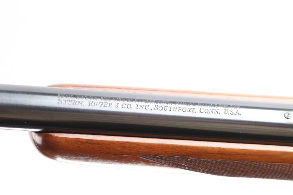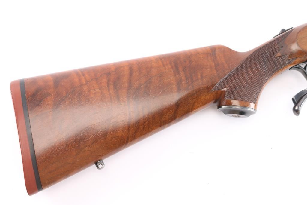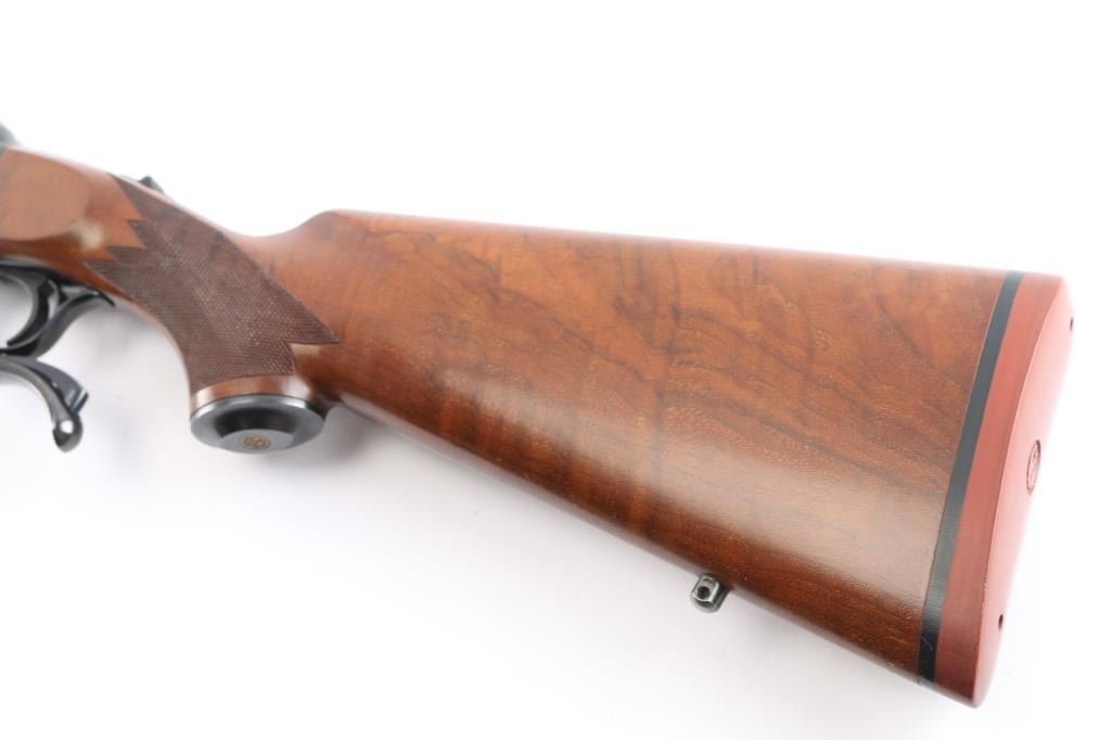 The Ruger No. 1-V (Varminter) model is a single-shot, falling-block rifle known for its accuracy and features designed for varmint hunting. Manufactured 1978, first year of production of the V-1 model. Single-shot, falling block action, 26" tapered barrel, no provisions for sights,1"rings installed on two bases, tang safety, highly figured American walnut stock and forearm with with fine checkered wrist and forearm, steel Ruger grip cap, sling swivel studs and factory red rubber recoil pad. Bore inspected by Accuracy Speaks, his findings are that it is like new / fired very few times. Action is smooth, blue is about 97% with very minor scratches and the wood is excellent.