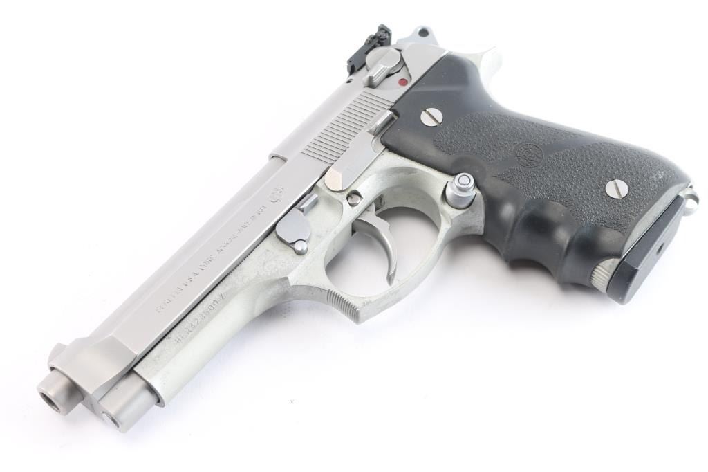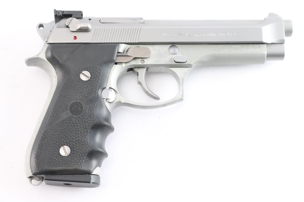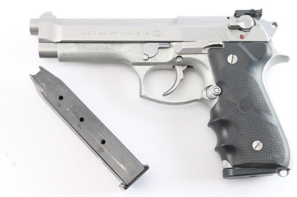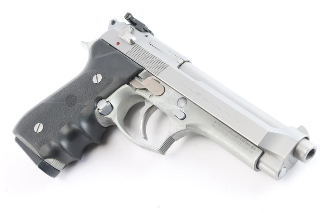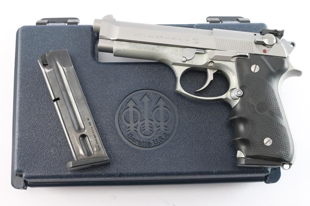 American made double-action semi automatic pistol chambered in 9x19mm, frame manufactured in Italy (Z in serial number). Features a matte finished stainless steel slide with integral front sight, 5" stainless steel barrel, dovetailed LPA rear window sight, ambidextrous thumb safety/decocker, alloy frame with serrated grip straps, push button magazine release, Two 15 round factory magazines, and Hogue black rubber, pebbled one-piece grips. Lanyard loop in heel. Pistol exhibits wear on the alloy frame Action is tight, bore is excellent/bright, grips are excellent. Comes with Beretta hard case and two 10-rd magazines.