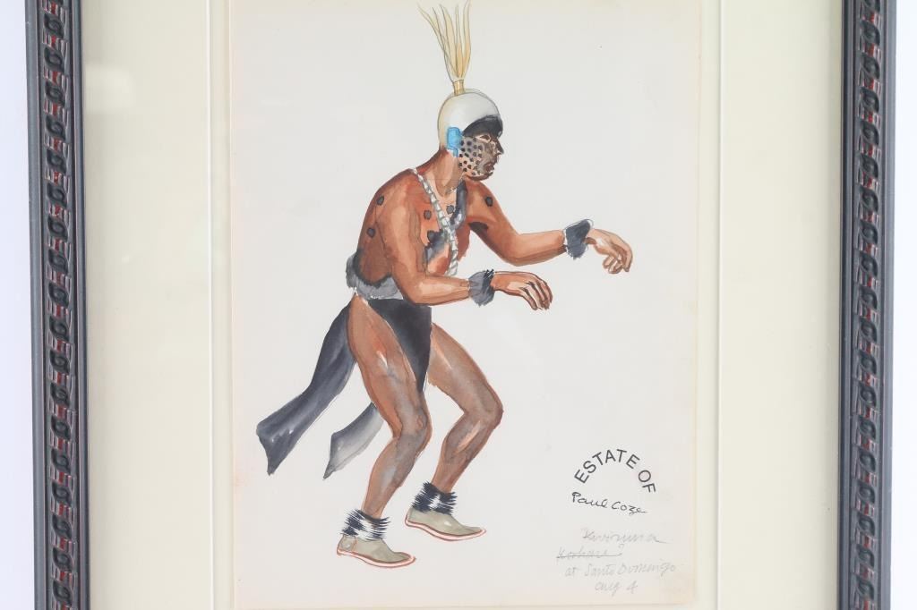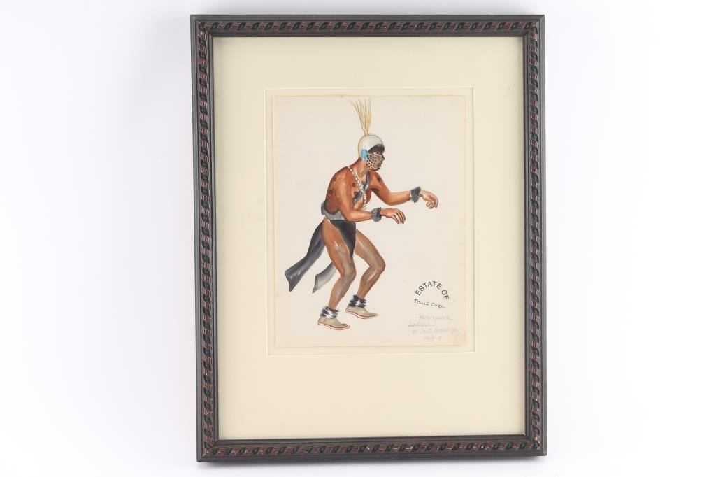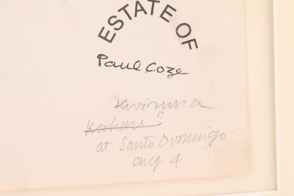 Depicting a dancer at Santo Domingo annual Aug 4 corn dance. Stamped "Estate of Paul Coze". During years of art training, an increasing fascination with cowboys and Native Americans led to four museum-sponsored anthropological expeditions to western Canada (1928-1932) and a book, Mœurs et histoire des Peaux-Rouges (1928, with Rene Thévenin). Many of Coze's hundreds of collected artifacts now reside at the Royal Alberta Museum. He led expeditions to North America while studying in Paris, and the connections he developed led to his becoming an adopted member of seven tribes. He later immigrated to the U.S. and lived in Los Angeles, working as a technical consultant for films, before moving to Phoenix, opening a school and studio, and turning his focus to art. Coze’s public artwork in Phoenix included murals at the Arizona Veterans Memorial Coliseum and another mural (since removed) at the City Council chambers, along with a phoenix sculpture at the Town & Country shopping center on Camelback Road. This watercolor is matted and framed; artwork measures 11" x 8 1/4". Condition is a little rough, commensurate with age.