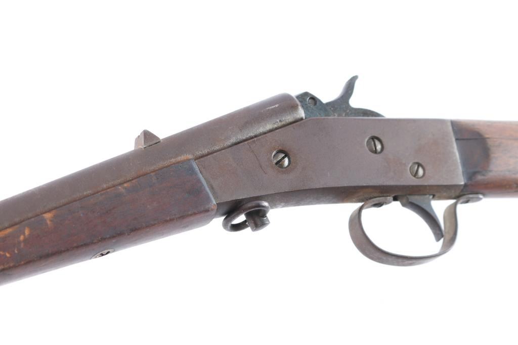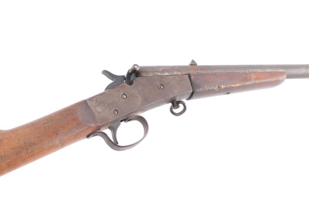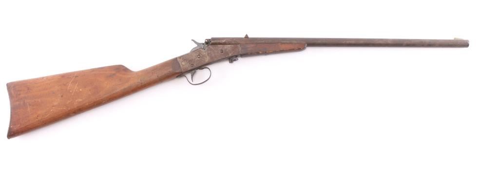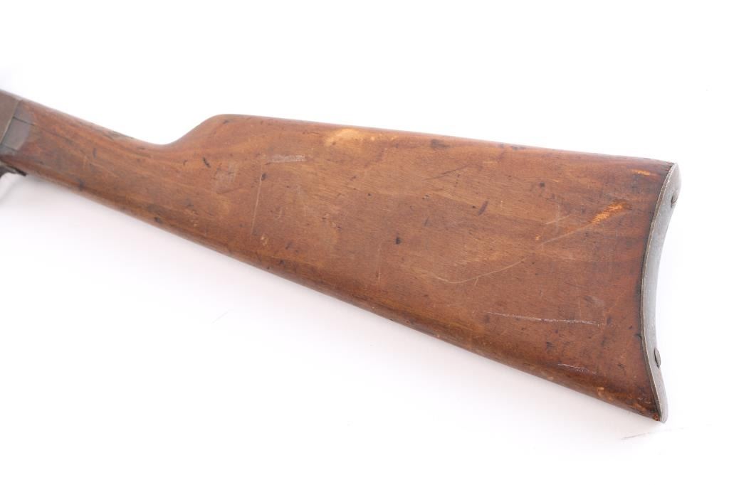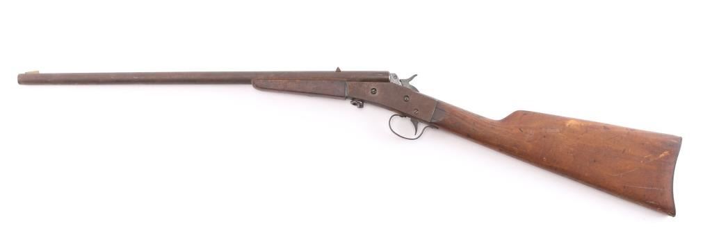 "Boys Rifle". NVSN Single shot rolling block rimfire rifle manufactured circa 1903-1941. Features blued finish, 18" barrel, blade front sight, notch rear sight, takedown screw under receiver, plain wood forend, wood shoulder stock with straight grip, curved metal buttplate. Bore is dark, rough with pitting, visible rifling throughout. Finish is nearly full coverage, mostly patina brown on barrel, mottled grays elsewhere, generally smooth textured. Wood is good condition, dented and scratched with finish losses. Markings are sharp, readable.