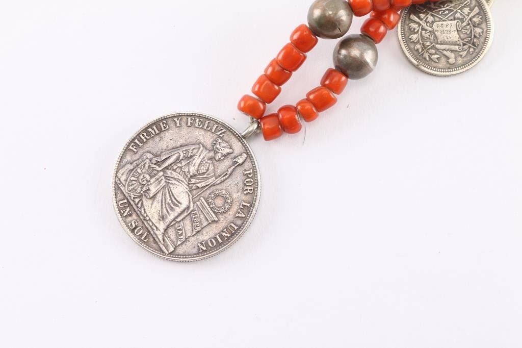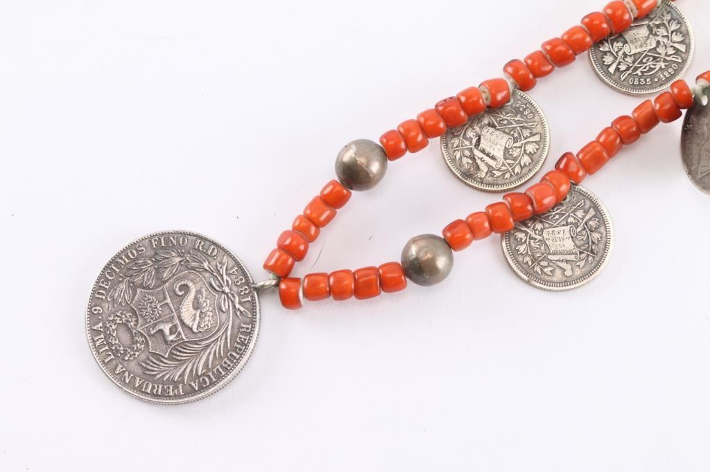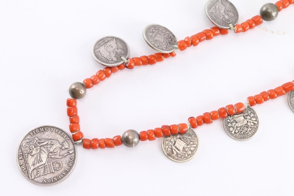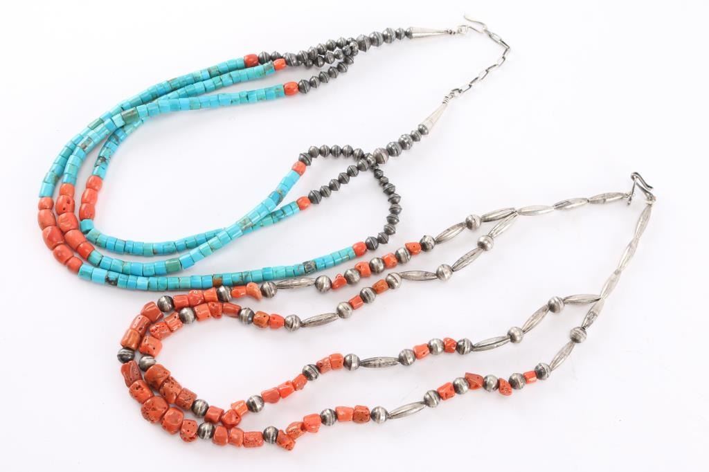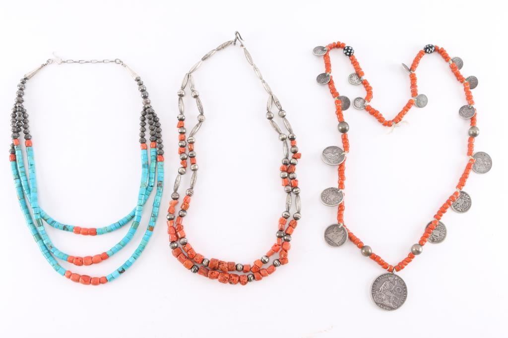 (1) Navajo Coral Necklace and sterling beads; (1) Navajo 3 Strand turquoise necklace accented with coral; (1) Coin Necklace with Guatemala coins with orange glass beads.