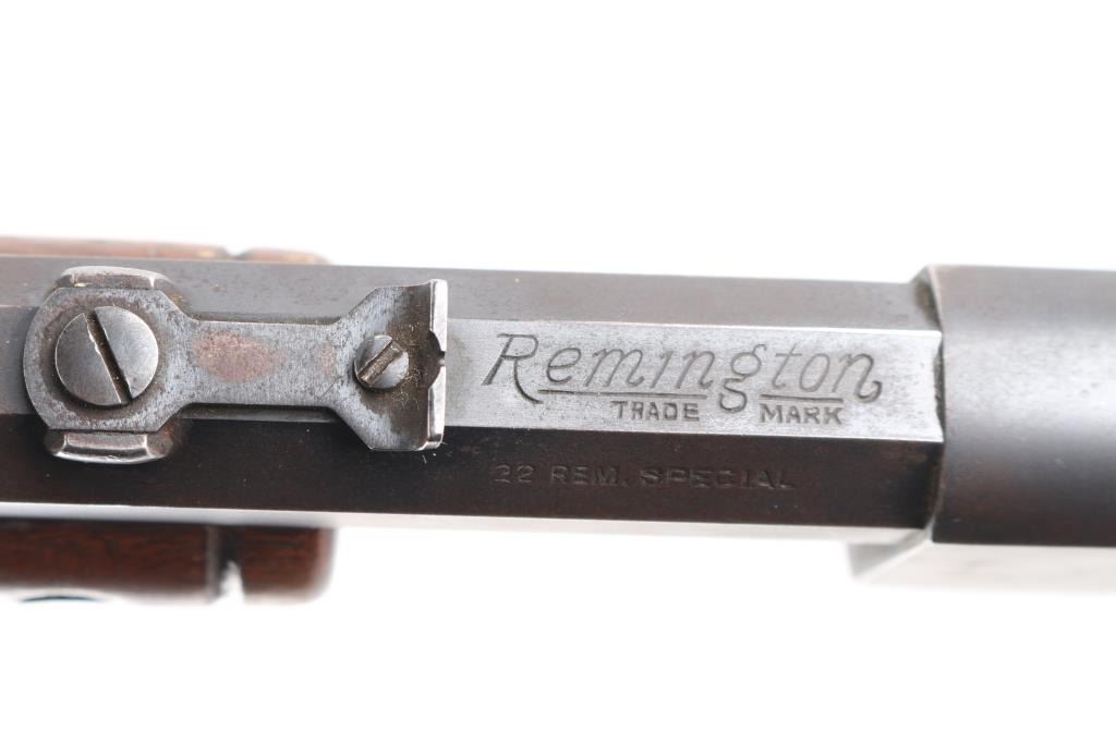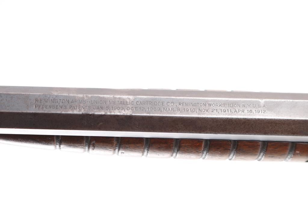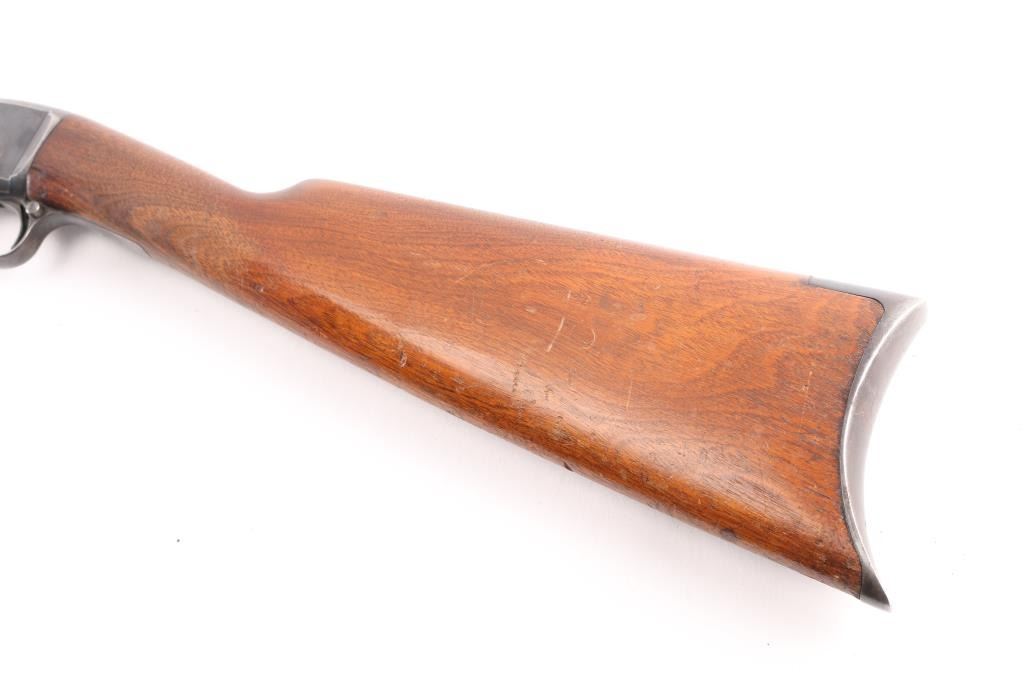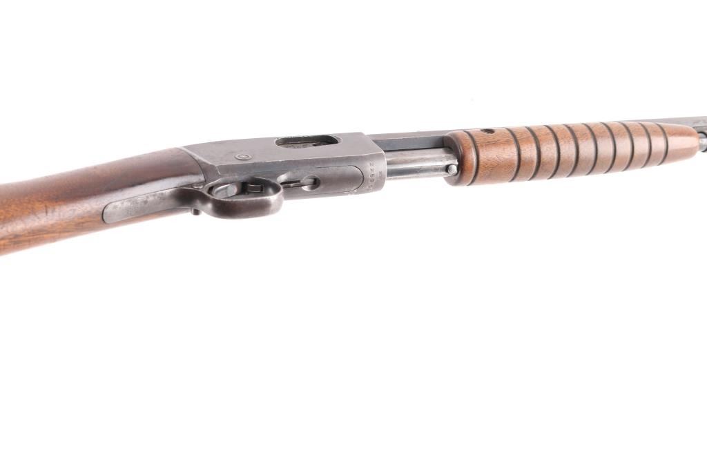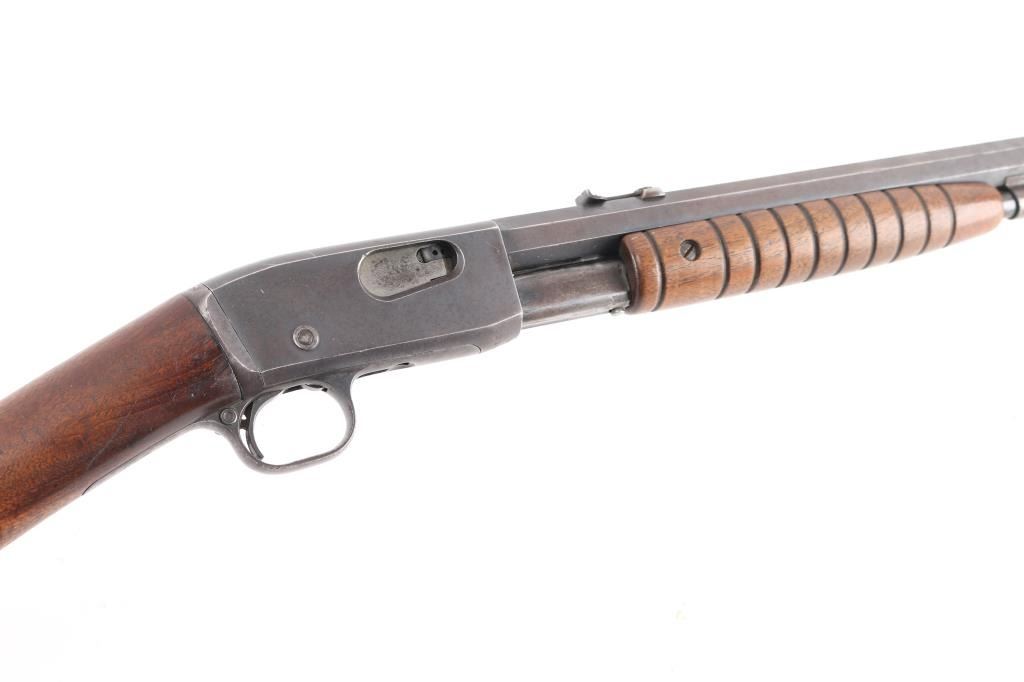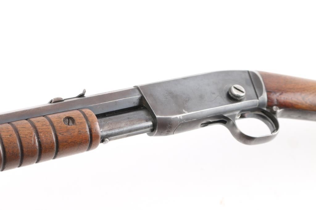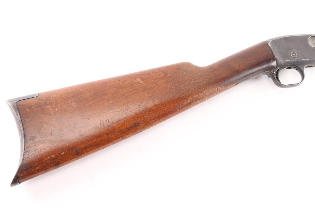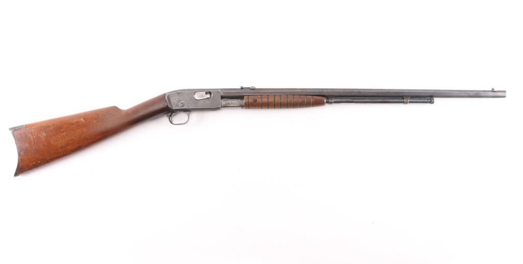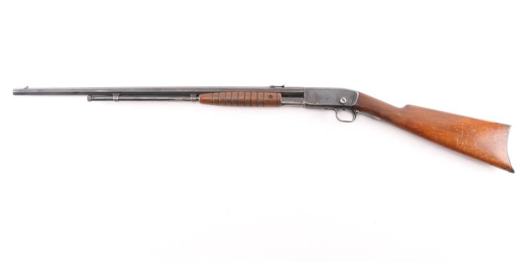 Vintage take-down slide action repeating rifle chambered for rare .22 Rem Special (.22 WRF), 24 inch octagon barrel . Manufactured 1913. Features a blued finish, 24" octagonal barrel, dovetailed blade/bead front sight, adjustable rear sight, 2/3 length tube magazine, smooth trigger, concealed hammer, push button safety, take-down steel receiver, grooved walnut slide handle and smooth curved grip shoulder stock with crescent steel butt plate. Bore is fair to good, somewhat bright with good rifling, some light scattered pitting. slide action is smooth, blue has dulled but mostly all there with handling/edge wear, scattered areas of very light pitting. Wood is very good/sound, minor scratches, some finish loss. Markings are generally crisp.