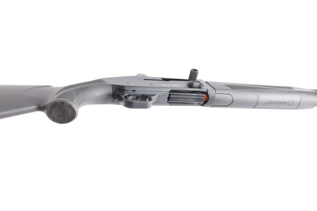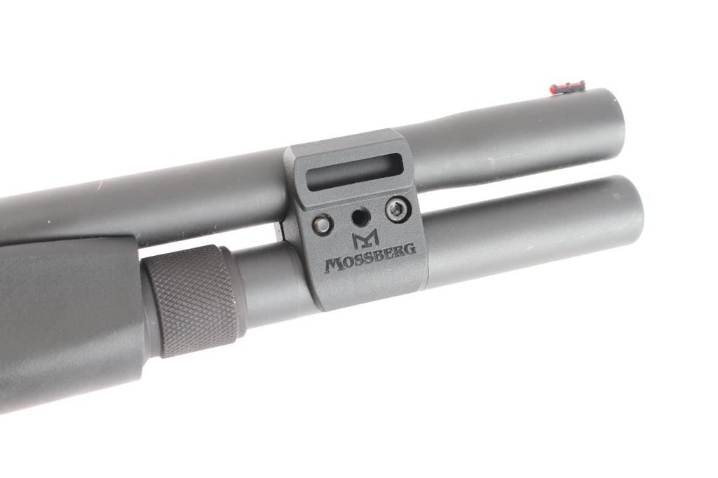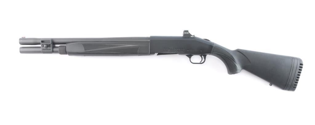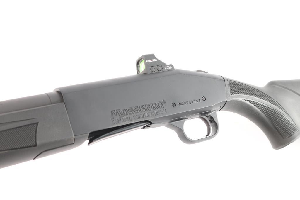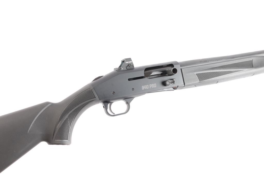 940 Pro Tactical 8-shot auto-loading shotgun, optic-ready receiver; oversized controls, adjustable stock, 18.5-inch barrel with interchangeable choke system, CYL installed, red fiber optic front sight, Holosun red dot sight installed on receiver, good working order, full length tube magazine, sliding tang safety, matte black finish, right mounted bolt release, black polymer stock with checkered panels on the wrist and forearm, vented rubber recoil pad. Bore is excellent/bright, like new condition. Comes with owners manual, choke wrench, cable lock, recoil pad, spacers. LOP-13 3/4".