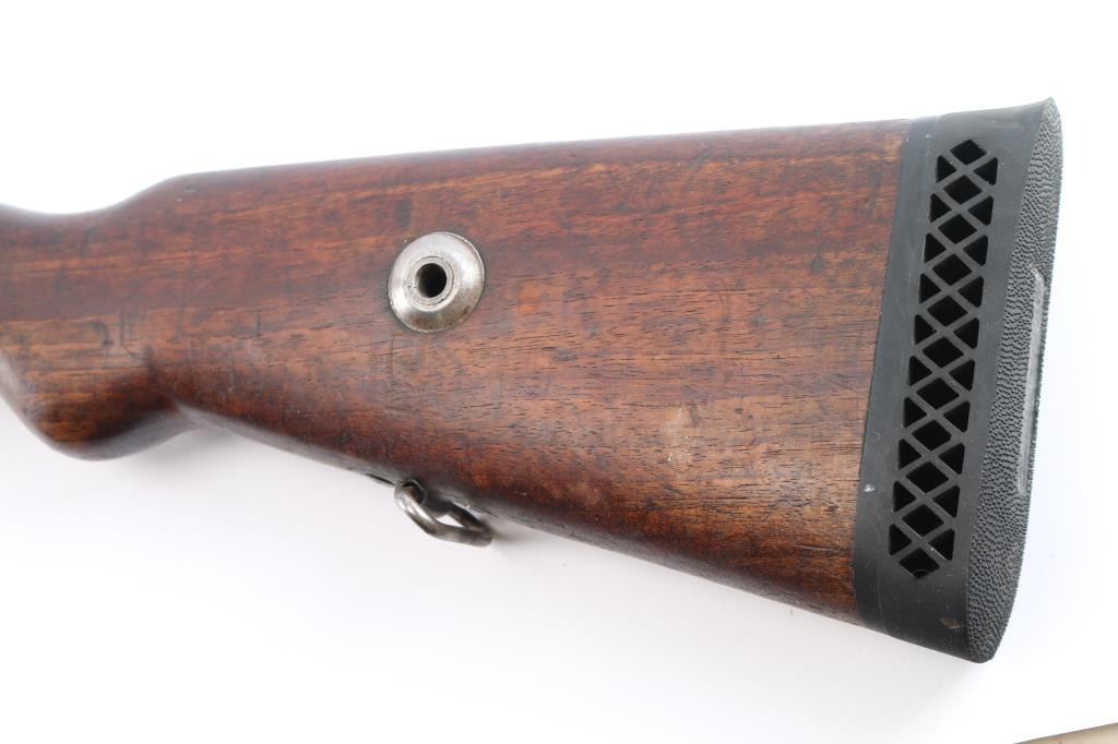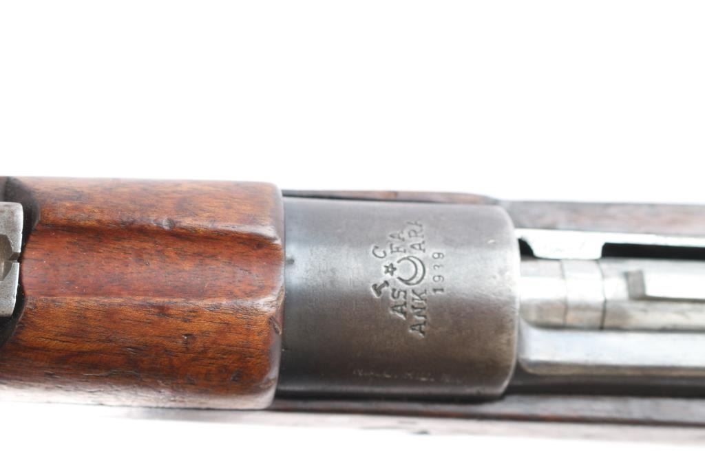 Turkish military bolt action rifle built by the ASFA Ankara Rifle Factory and imported by Navy Arms Ridgefield, NJ. Chamber dated 1939. Features blued finish, wood stock & handguard, 29" barrel, blade front sight, tangent rear sight, bayonet lug, no cleaning rod, sling swivels, straight bolt handle, polished bolt. Mauser style safety. Bore is good condition, frosted with strong rifling. Retains about 50% dull blue with handling/edge wear. Stock is very good condition, showing minor small dents & scrapes. Steel buttplate has been replaced with a White-Line vented recoil pad.