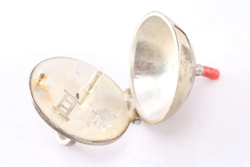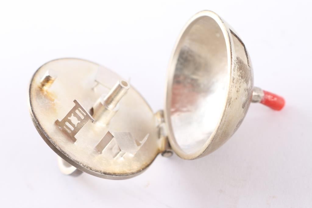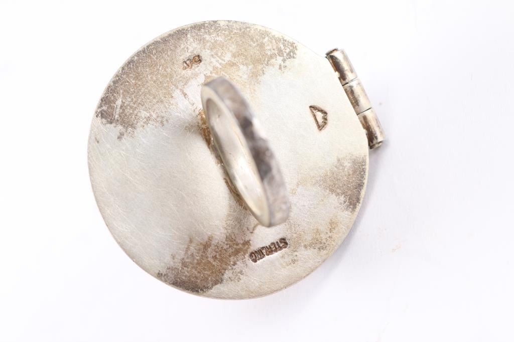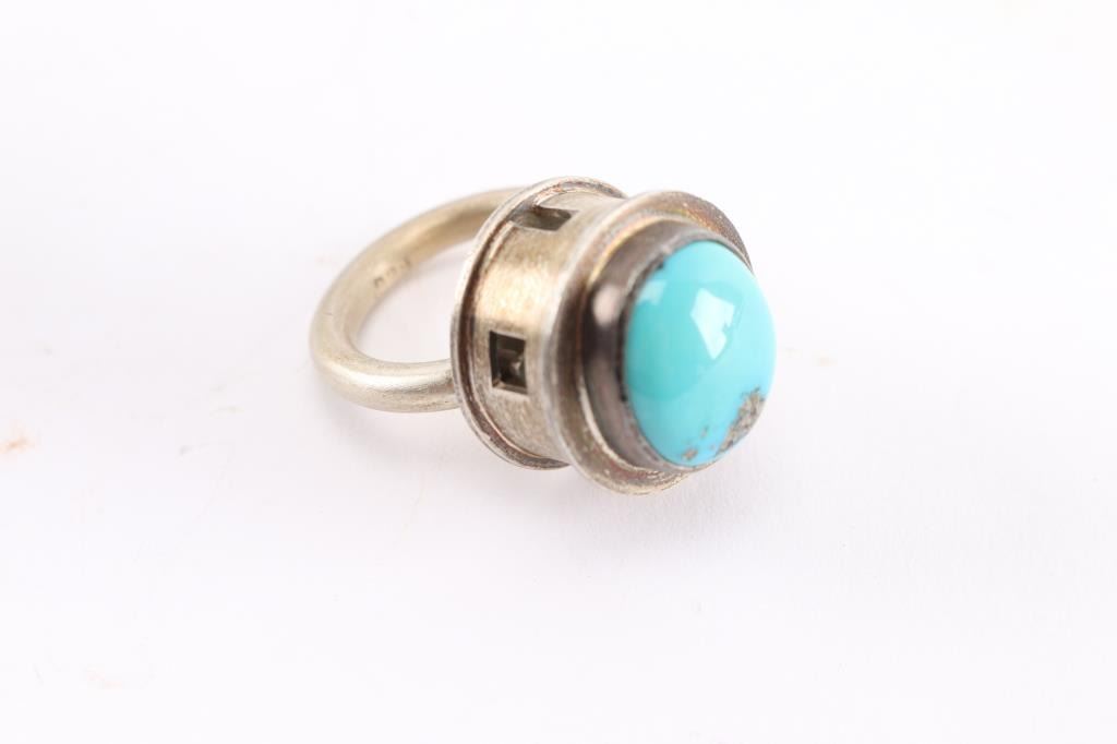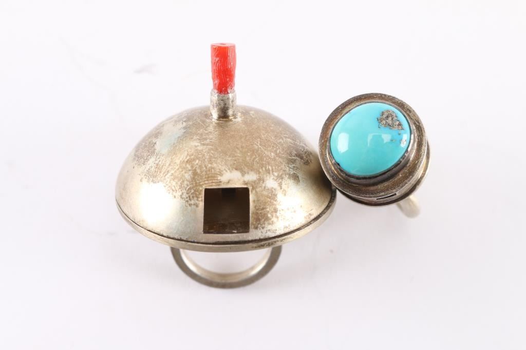 Navajo Amelia Joe-Chandler's jewelry is designed after the Dine’ (Navajo) philosophy of life, which encompasses air, fire, water, and earth. The four sacred directions, colors, plants, and mountains are also an integral part of her designs. Her jewelry is set in sterling silver. Both rings are shaped like Navajo hogans, the smaller has a cabochon of turquoise on top and is size 5 1/2; the other is larger and the top lifts up to reveal inside living quarters with furniture. Has a coral tube for smoke from chimney, size 5 1/2". Truly a conversation piece. Both maker marked AJC and the artist's mark.