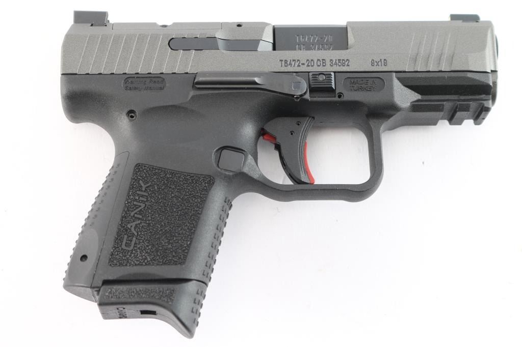 Made in Turkey this semi-auto sub-compact pistol is chambered for 9x19 ammunition. It features a 3.6" match grade barrel with nitride finish, a Tungsten Cerakote over nitride slide finish, serrated blackout rear and phosphorous front white dot sight, cut for optics, front and rear slide serrations, textured grips with stippling on the front and back straps. It has an ambidextrous slide lock, serrated safety trigger, loaded chamber indicator, cocking indicator and an accessory rail. Gun is new. Factory 12 rd magazine with finger rest. Comes with original factory hard case, owners manual, extra back strap, extra flat floor plate, tool kit, cleaning rod and brush, factory 15 rd extended magazine and kydex paddle holster.