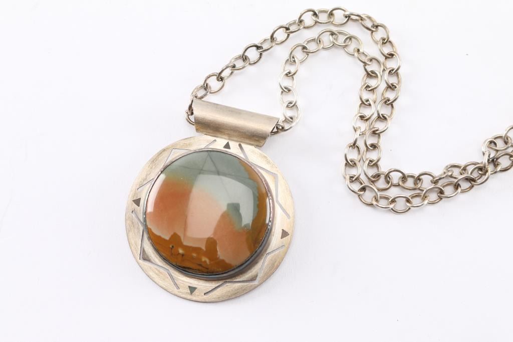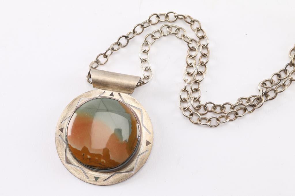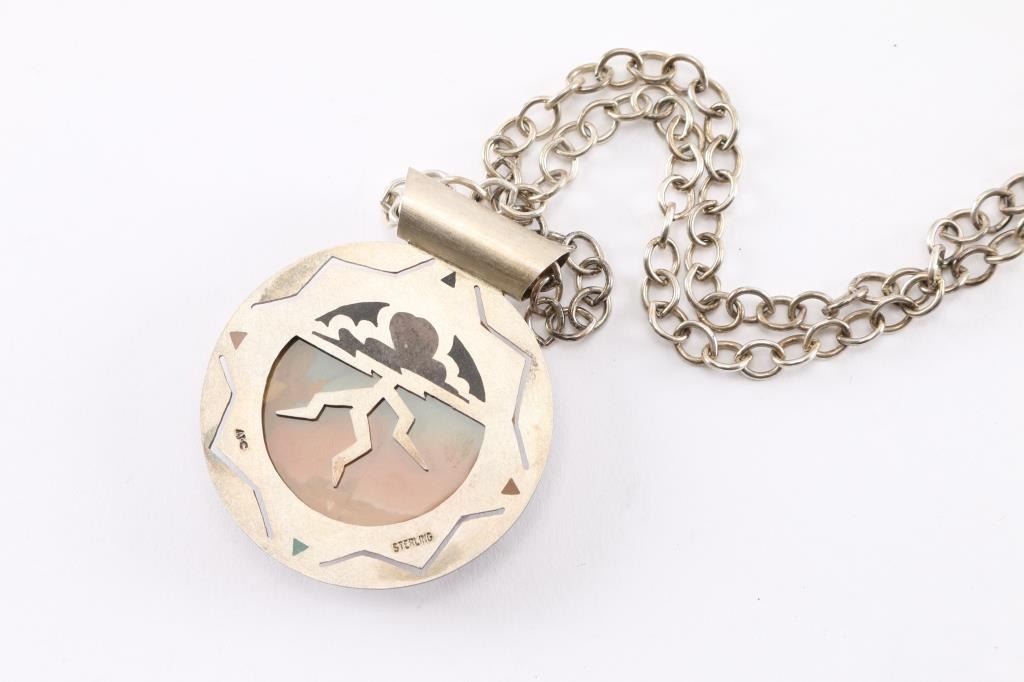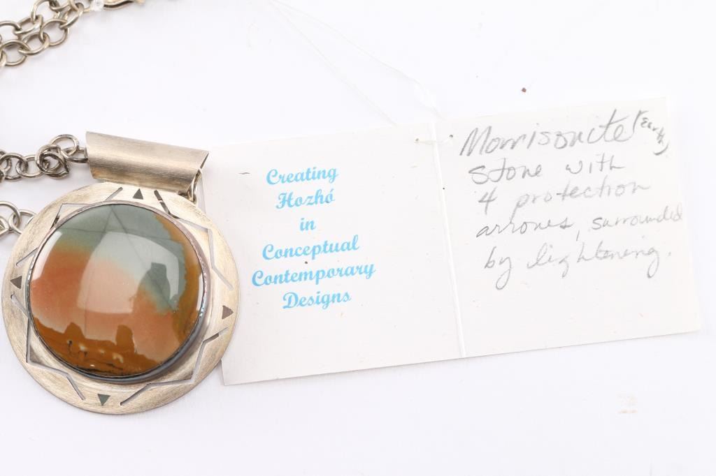 Round morrisonite (Earth) stone with 4 protection arrows, surrounded by lightening, set in sterling silver, maker marked. On a large round link sterling silver chain. Measures 10 1/2" from drop.