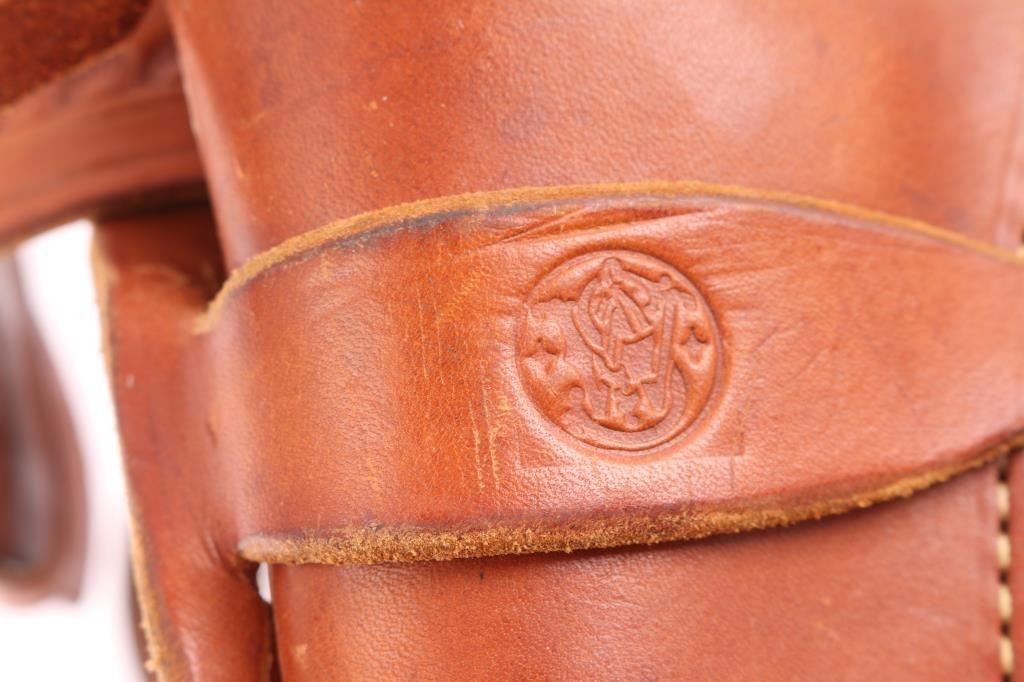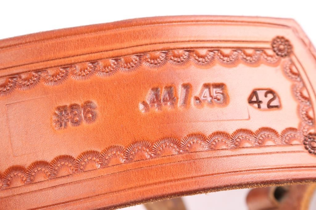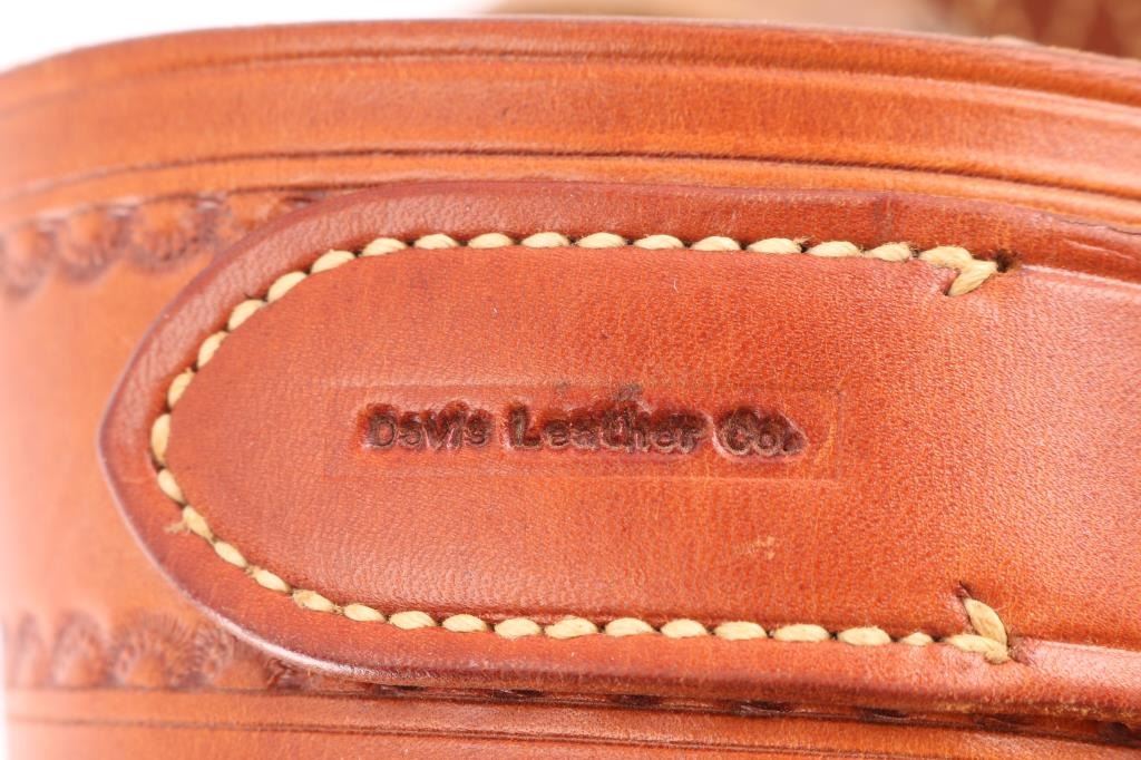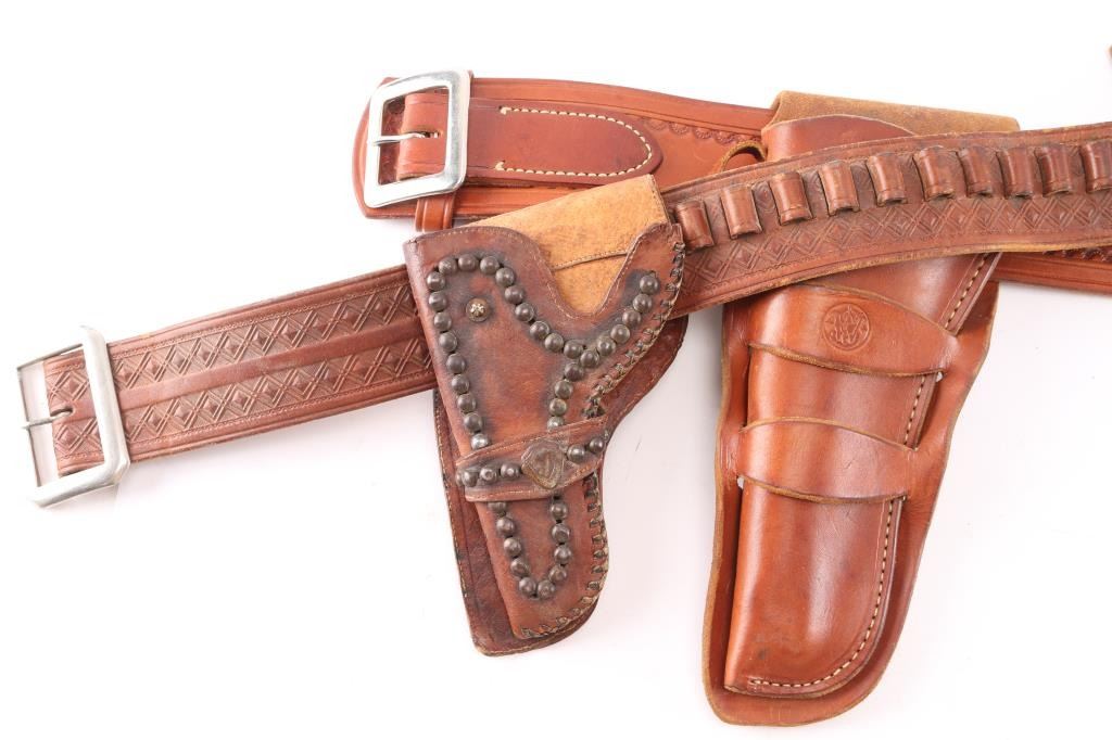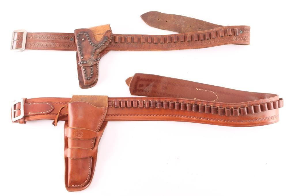(1) Smith & Wesson leather holster and belt made by Davis Leather Company, 45" waist. (1) Vintage leather holster with belt, 40 waist.