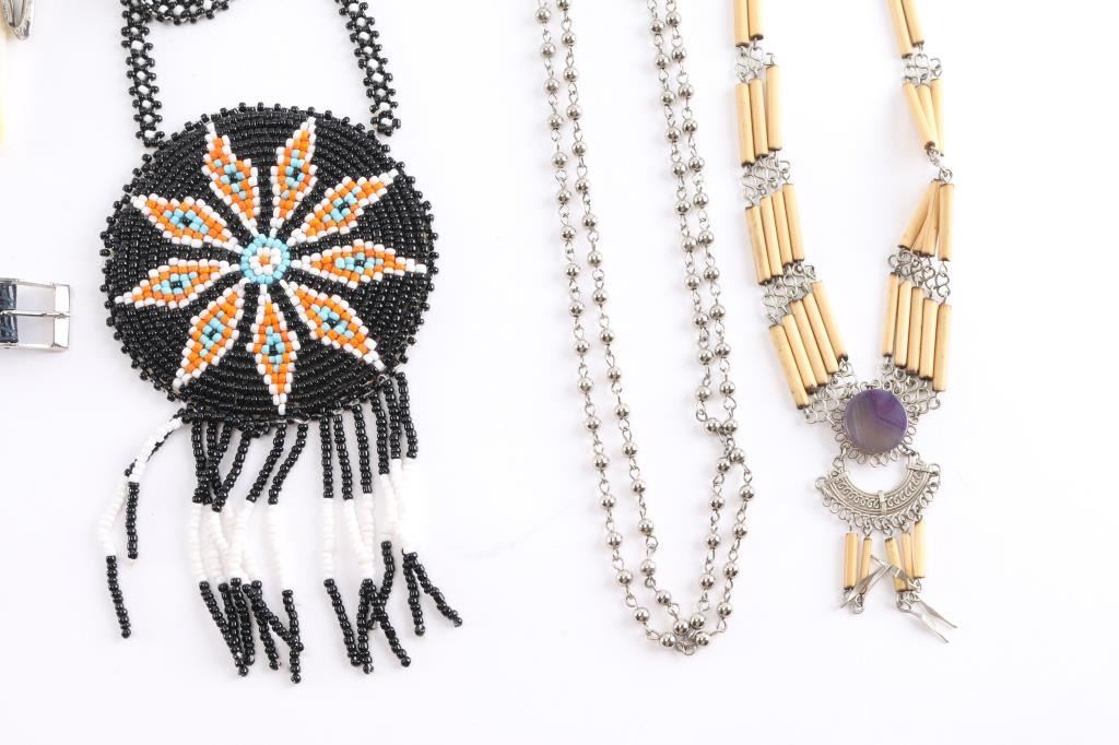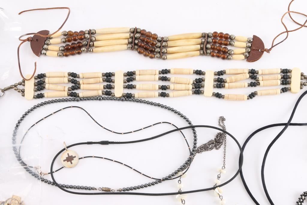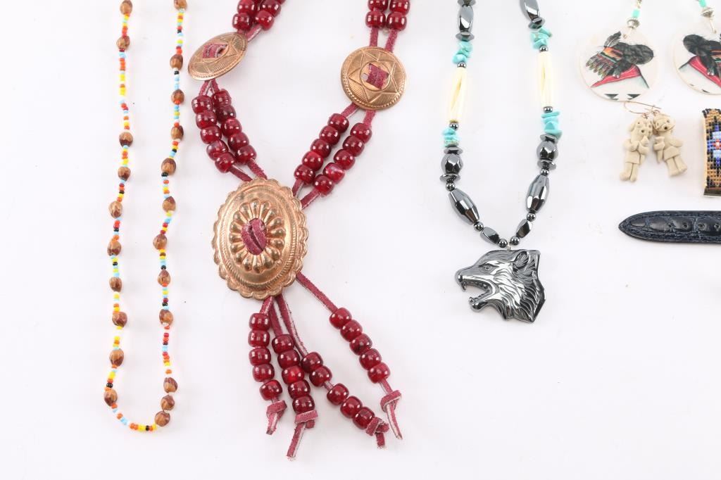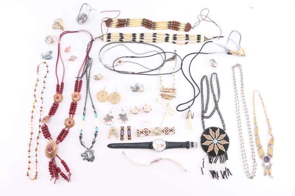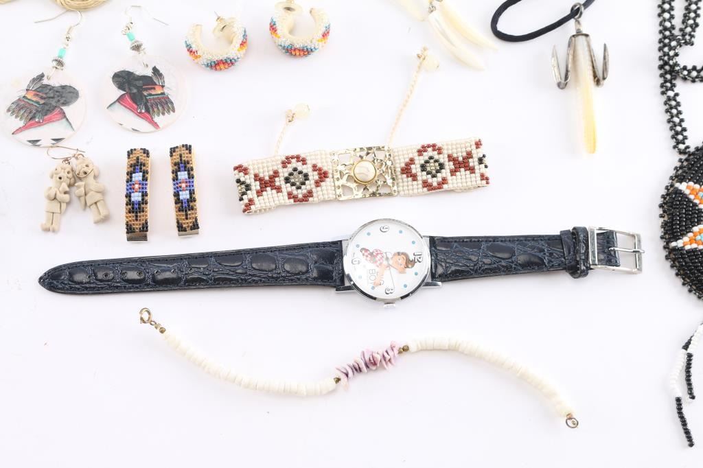 15 fun necklaces; 2 bracelets; 1 Bob's Big Boy watch; 1 ceramic pendant; 1 pair beaded hair clips; 11 pair of pierced earrings.