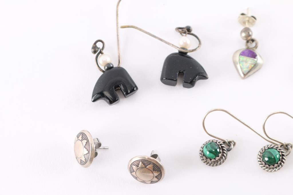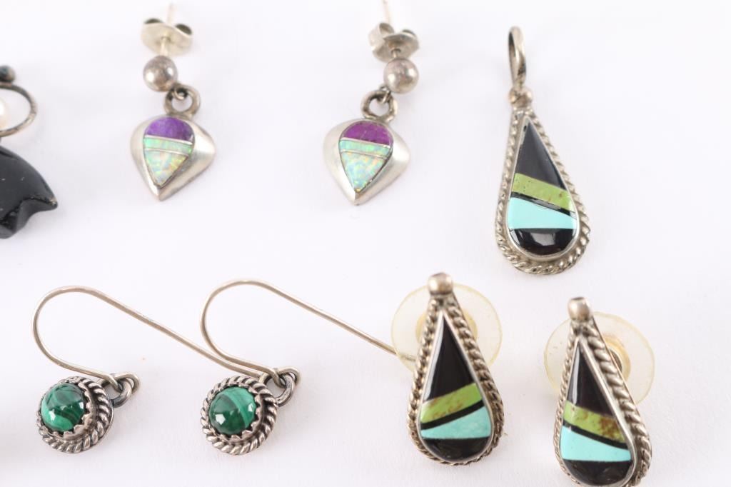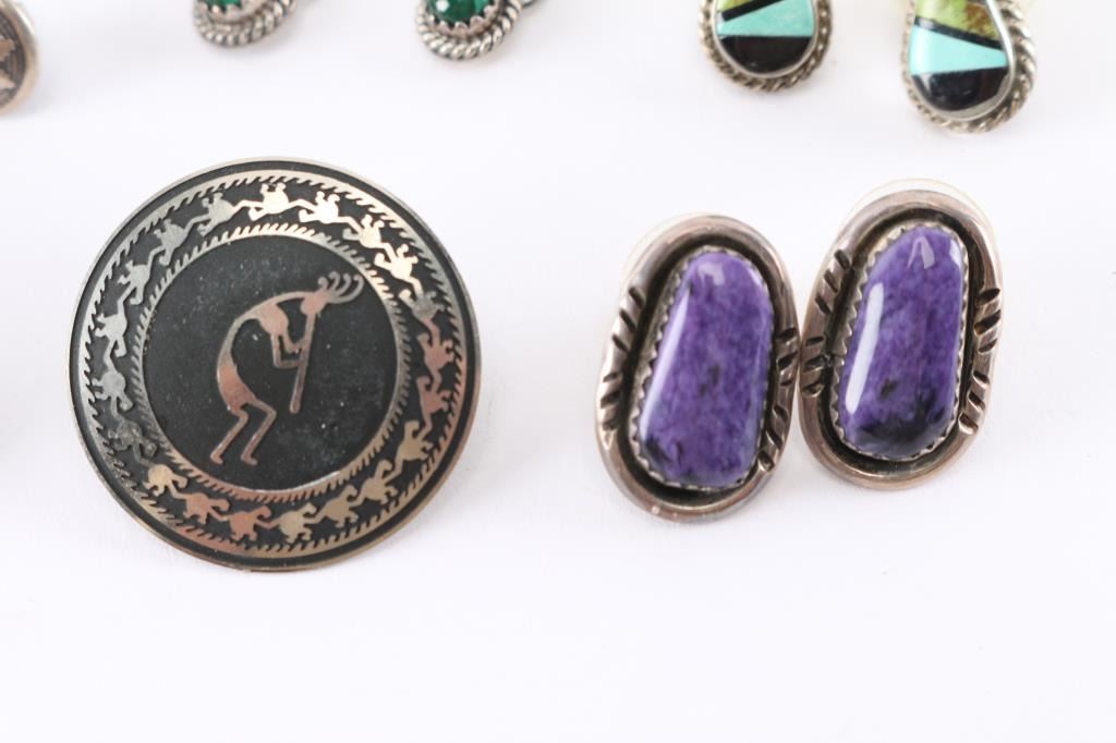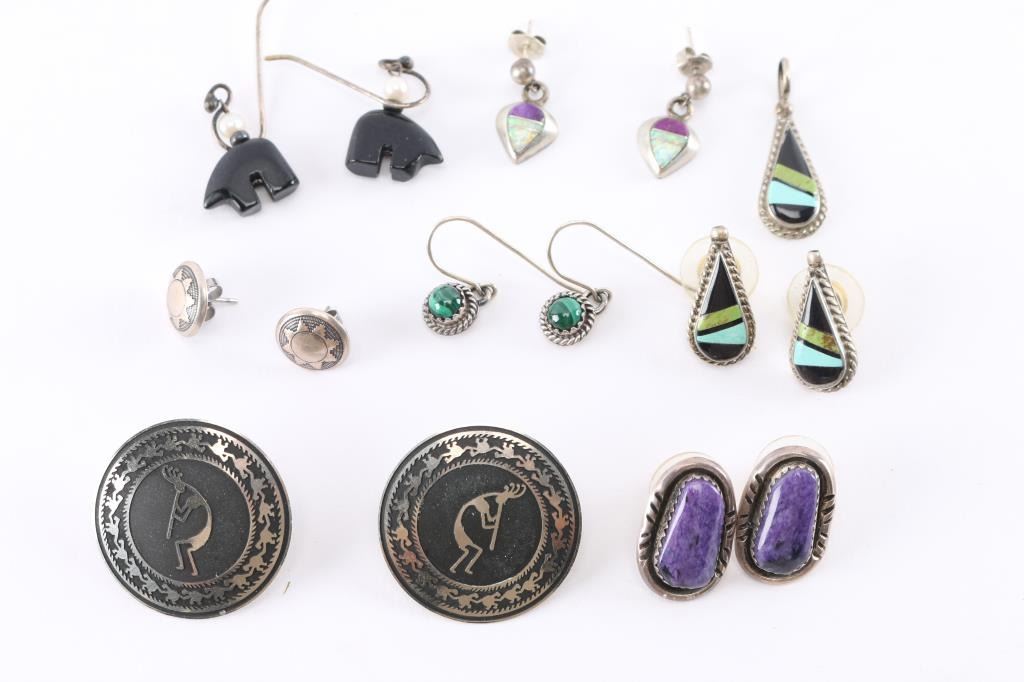 All pierced, includes a pair of sugalite, inlay jet (or other black stone) with turquoise, malachite, and an opal and purple stone inlay, among others. All appear to be native American made and most are maker marked.