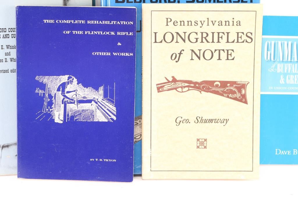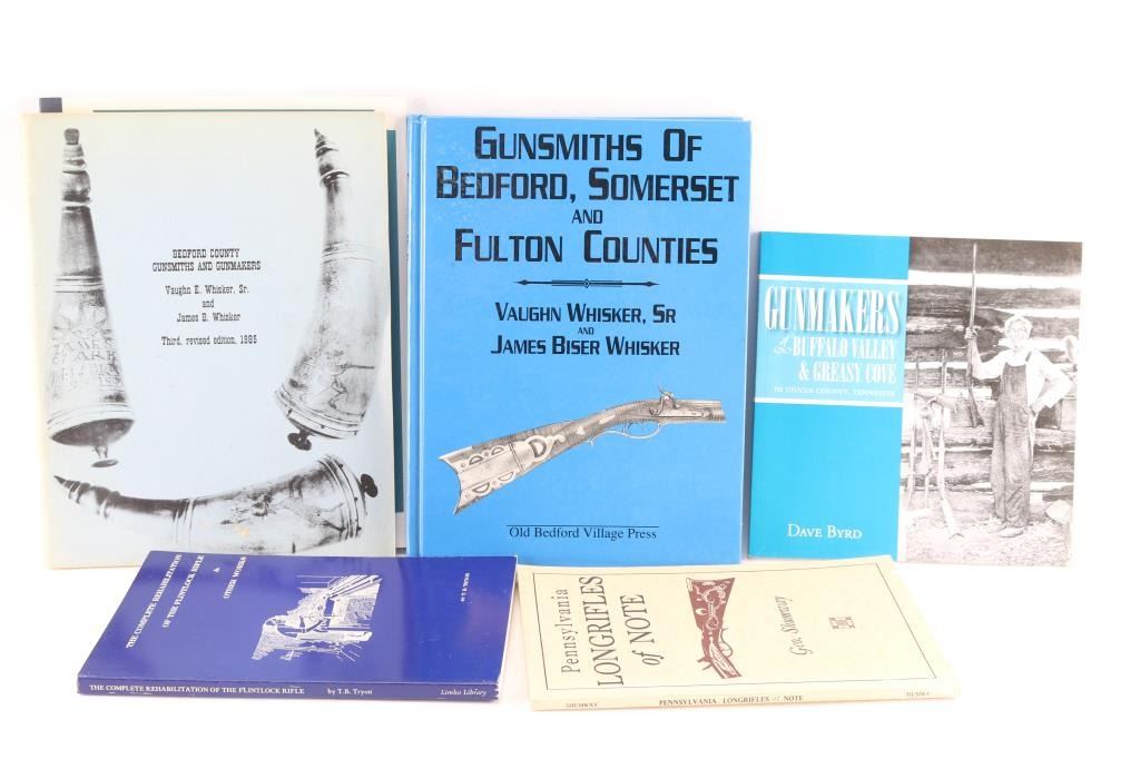 Includes: Pennsylvania Longrifles of Note (3rd Ed.) signed by the author George Shumway; The Complete Rehabilitation of the Flintlock Rifle & Other Works by T.B. Tryon; Gunmakers of Buffalo Valley & Greasy Cove in Unicoi County, Tennessee by Dave Byrd; Gunsmiths of Bedford, Somerset and Fulton Counties by Vaughn Whisker Sr. and James Biser Whisker; Gunsmiths and Allied Professions of Western Pennsylvania by James B. Whisker; Bedford County Gunsmiths and Gunmakers by Vaughn E. Whisker Sr and James B. Whisker.