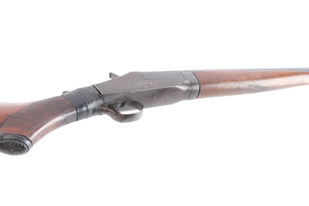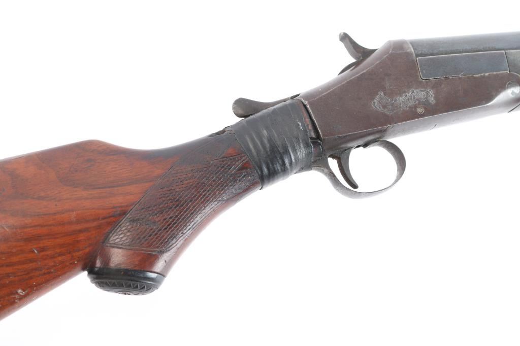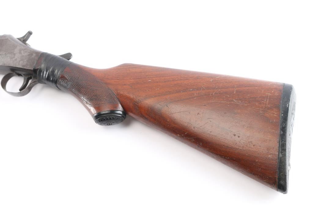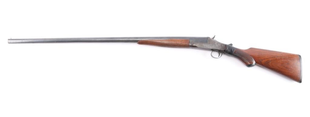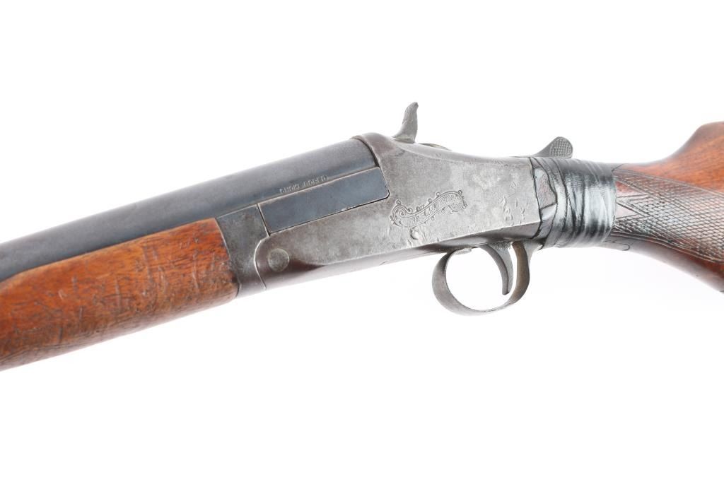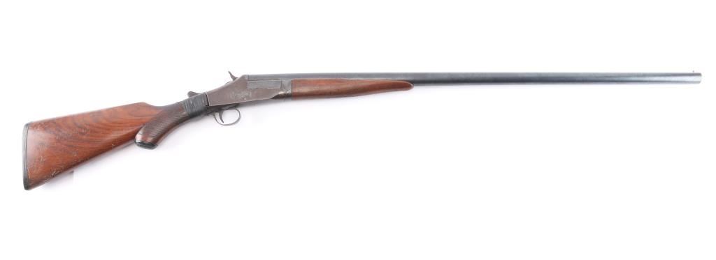 Single-shot, break-action shotgun manufactured circa 1905-1918. Features 32" barrel marked "Genuine Armory Steel", checkered wood splinter forend, wood butt with checkered wrist & open curved grip, gutta percha grip cap & buttplate, brass front bead, double triggers, tang safety removed as cracked wrist has been repaired with black electrical tape, extractor plate. Bore is very good/bright, fixed CLY choke. Barrel retains a dull blue finish Metal surfaces on action have turned a gray/brown patina. The checkering on the wood is worn. 13-3/4" Length of Pull. 2 3/4" chamber.