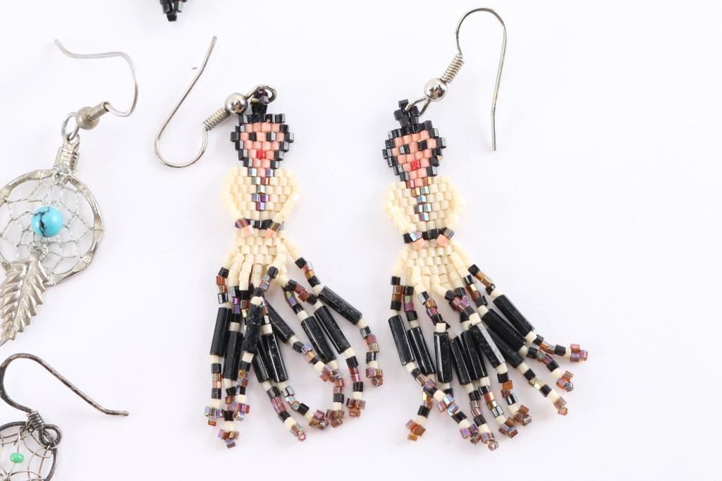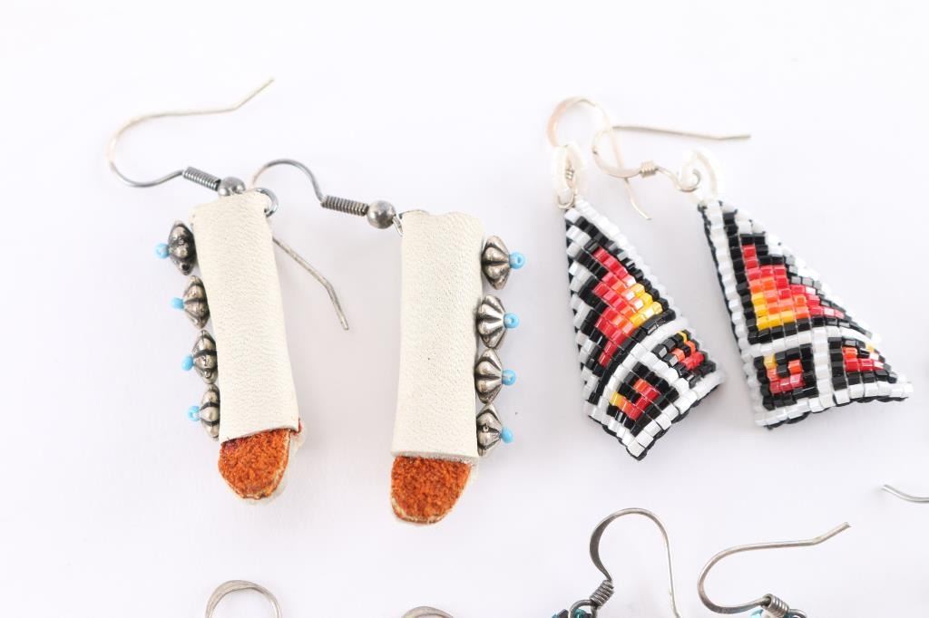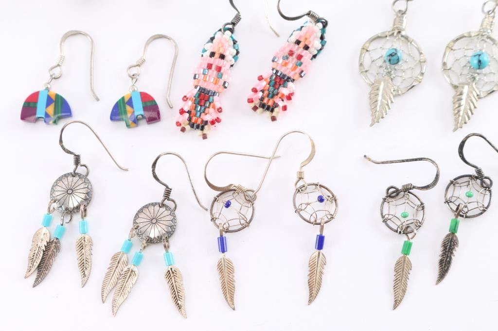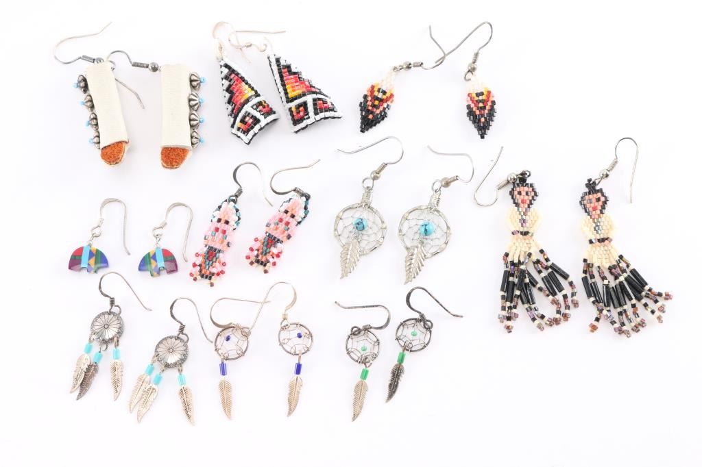 All pierced, some beaded, some sterling dream catchers, leather moccasins with silver conchos and turquoise dots, among others.