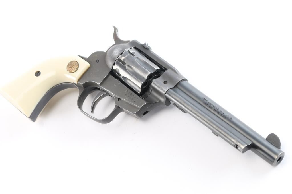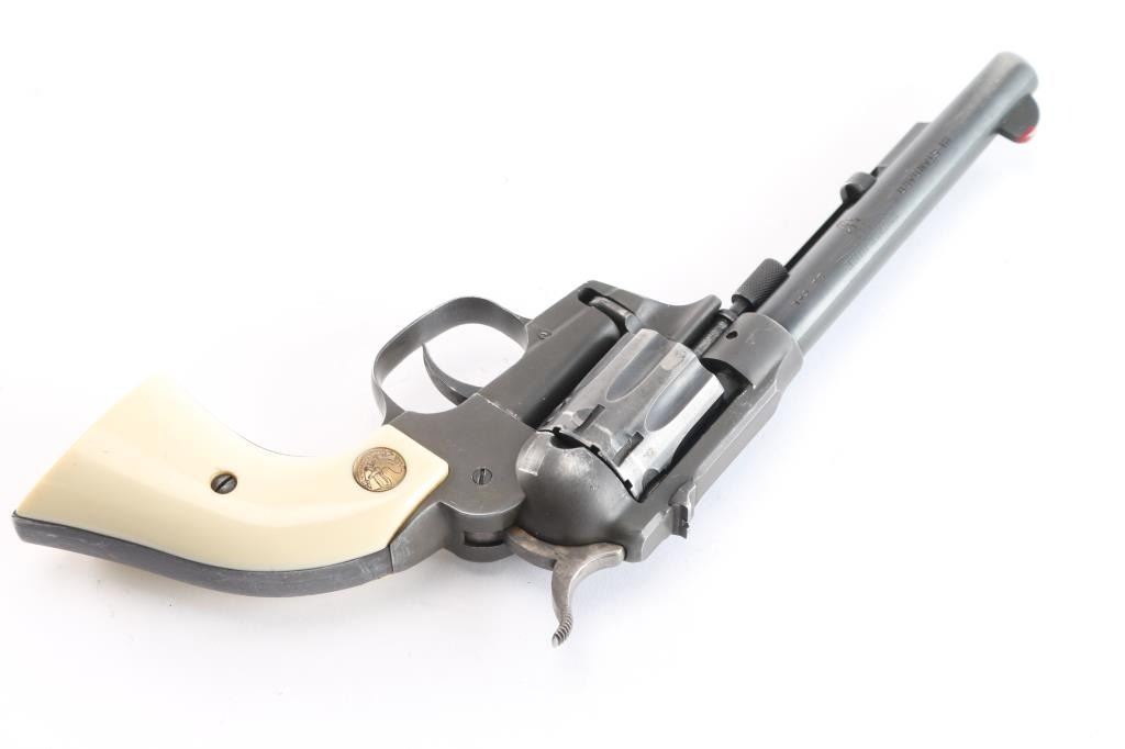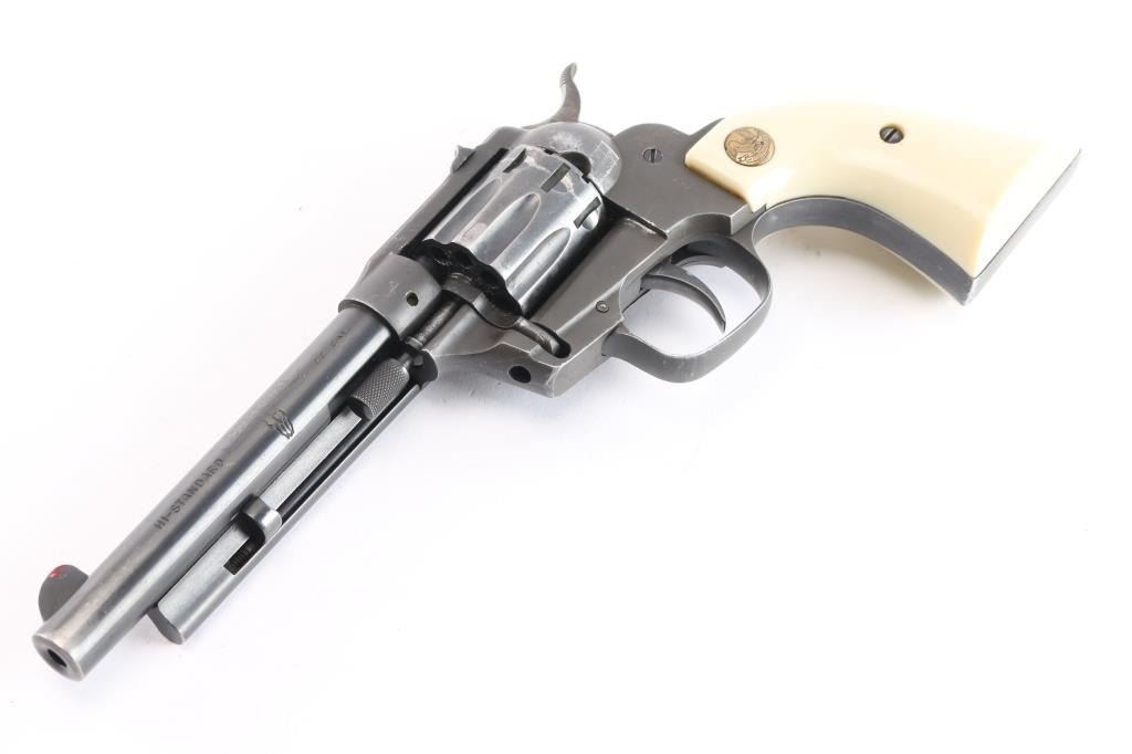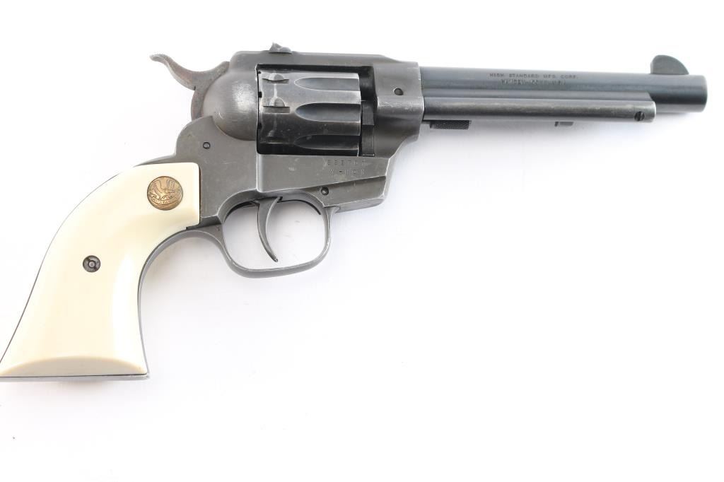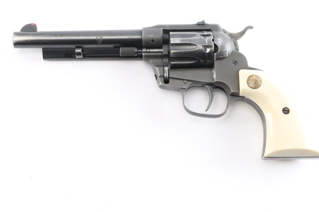 Vintage High standard double/single action 9-shot revolver, manufactured 1958. 5.5" barrel, blade front and dovetailed square notch rear sights. Blue barrel and cylinder, matte frame, faux ivory grips with brass High standard medallions, fluted 9 round swing-out cylinder. Action is smooth with tight lock-up, grips are excellent, bore is excellent/bright and the finish is about 75% with handling/edge wear, some minor scratches and tracking on the cylinder.