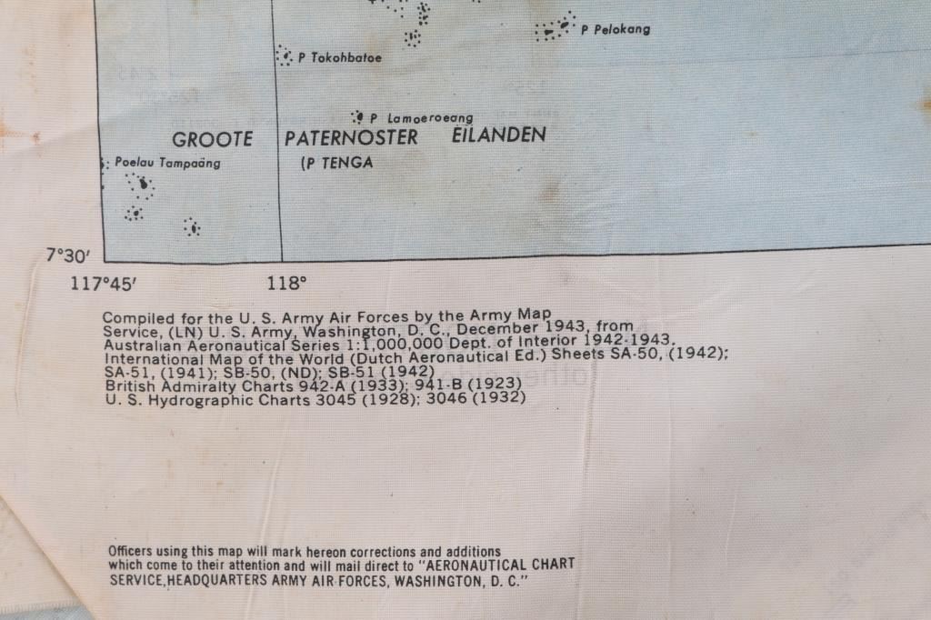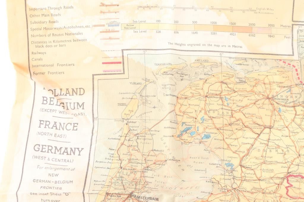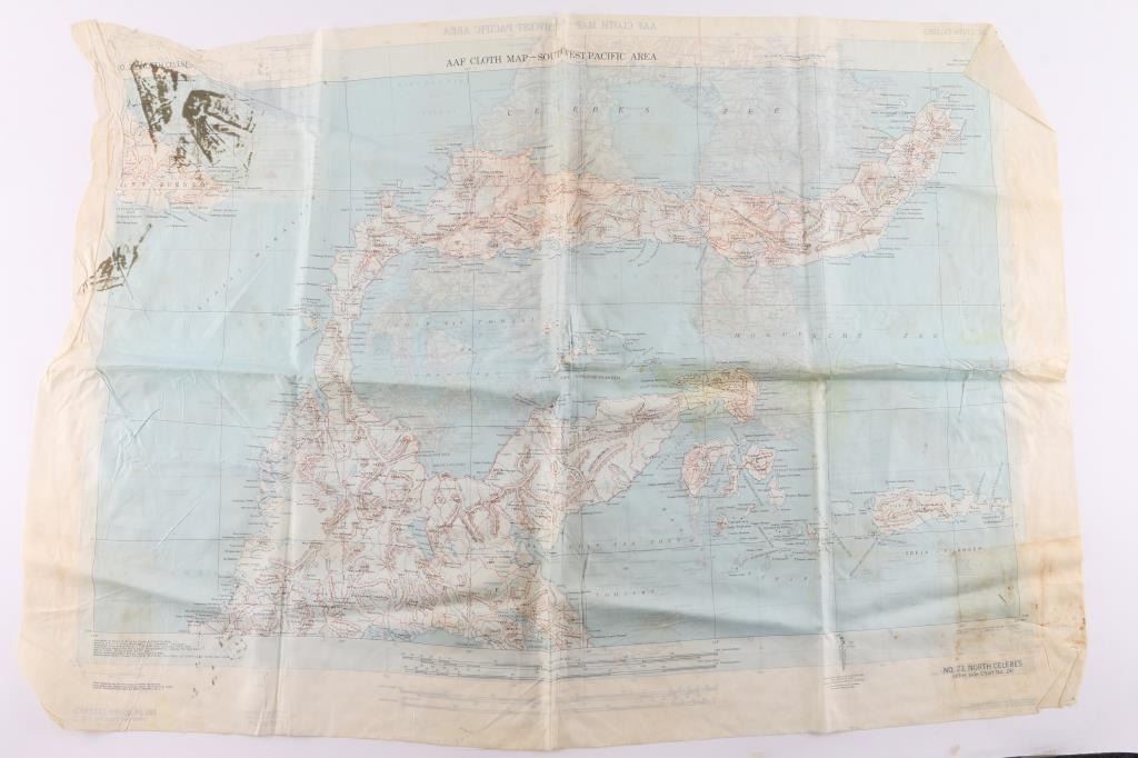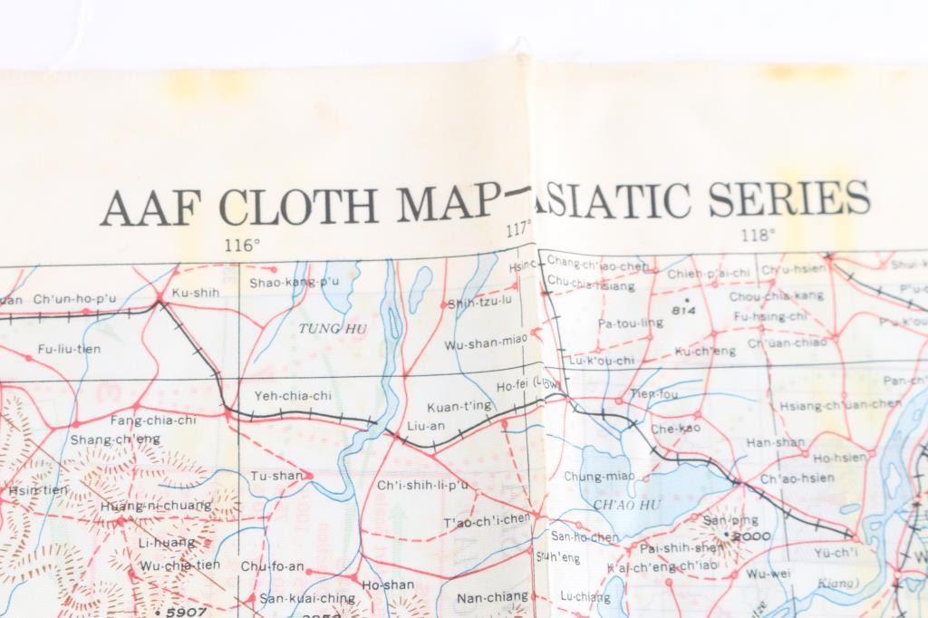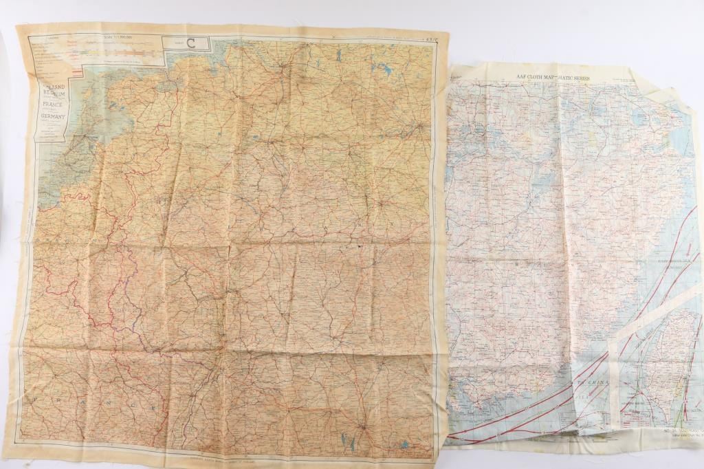 Lot of three 2-sided maps. AAF silk maps, also known as silk escape and evasion maps, were crucial tools used by Allied aircrews during World War II to aid in escape and evasion if they were shot down over enemy territory. Includes N0.34, Southeast China, No. 24 Southwest Pacific Area and map withone side of Holland, Belgium, France and Germany, Series C, showing the "New German-Belgium Frontier. All in very good condition, no rips or tears, No. 24 has some staining.