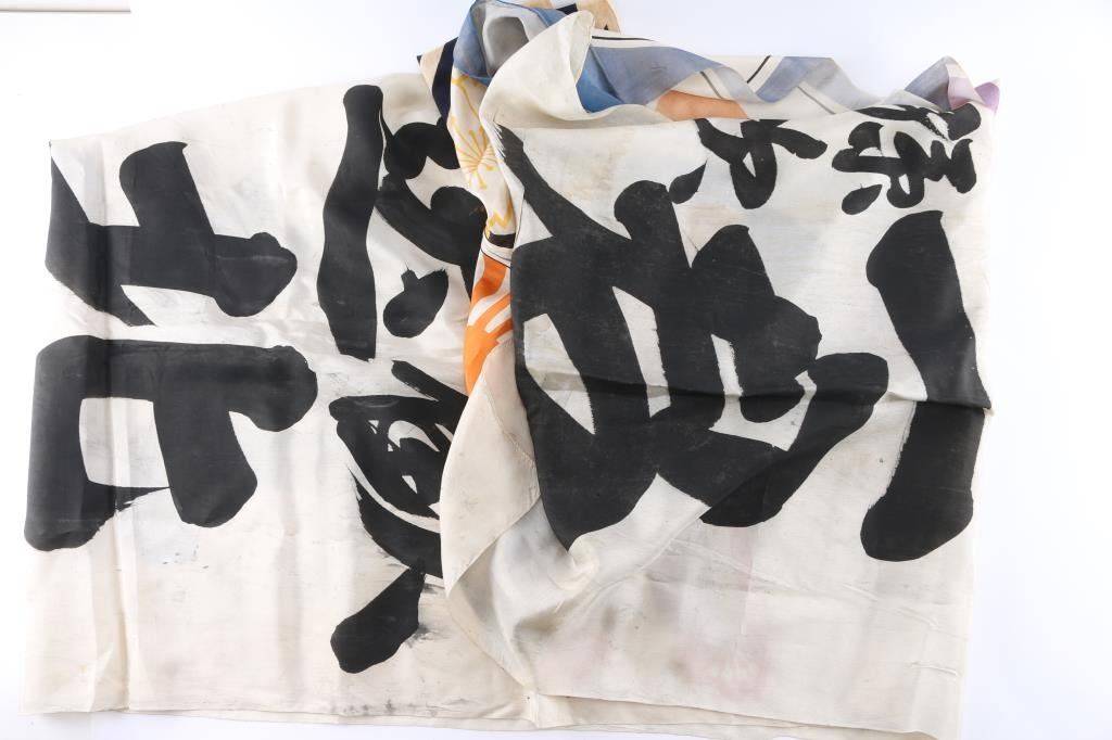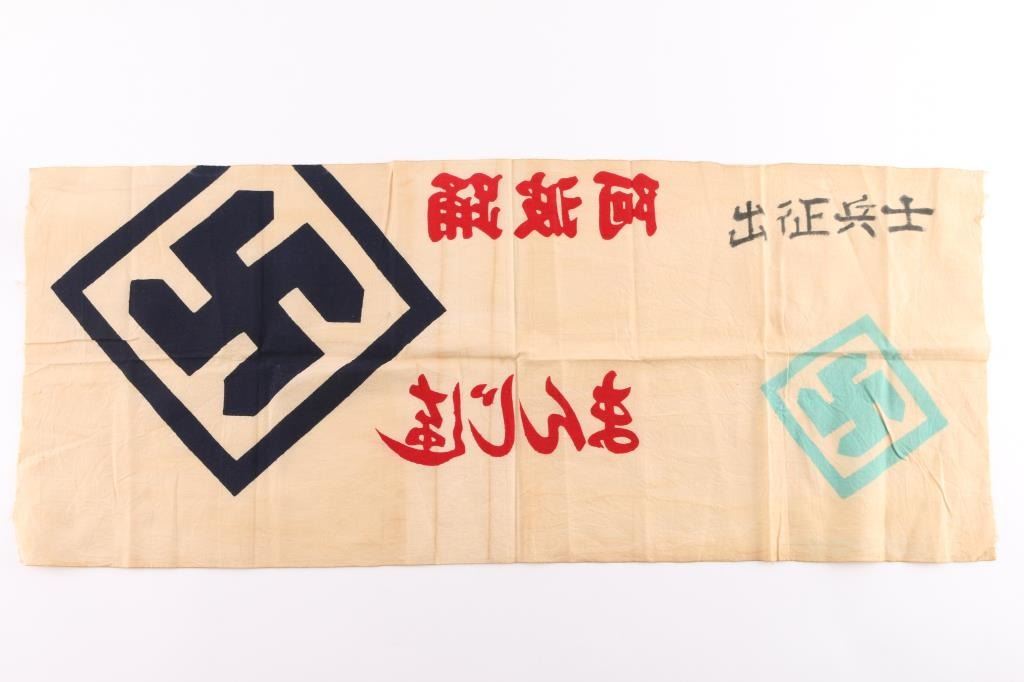 1) LARGE WWII Japanese Off To War banner With Kanji, Certified. Nice version of a Patriotic “Off To War” banner. It features an image of crossed national flag & Battle flag with large black Knaji writing The flag is made of cotton blend linen and is hand painted and has very high quality material. Measures 132" long and 28 1/2" Wide. Has Cherry blossom symbols and signed in gold on the top rear. Condition and colors are very good, no rips or tears. 2) Smaller banner of white cotton blend material with red and black Kanji writing. Depicts a a black tilted swastika in a square at the top, and a smaller green one at the bottom, the arms of the swastikas have pointed tips. In Japan, the swastika symbol known as manji, is primarily a Buddhist symbol representing peace, prosperity, and good luck, and is not associated with the Nazi party. Very good condition, no rips or tears.