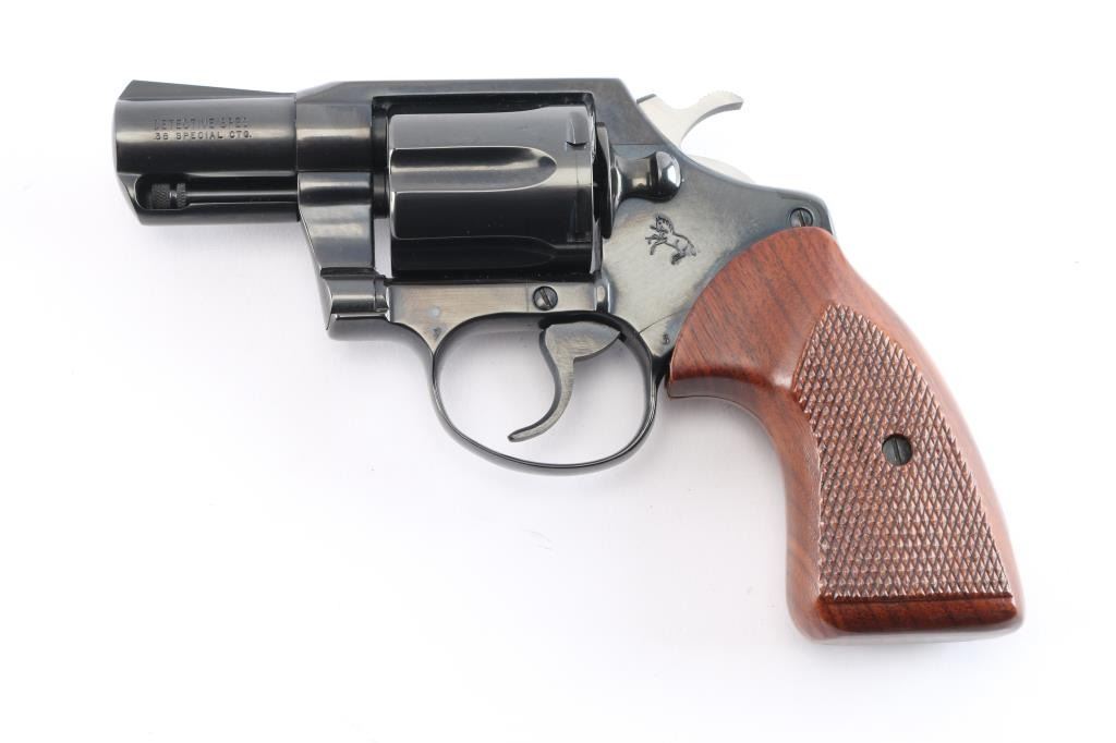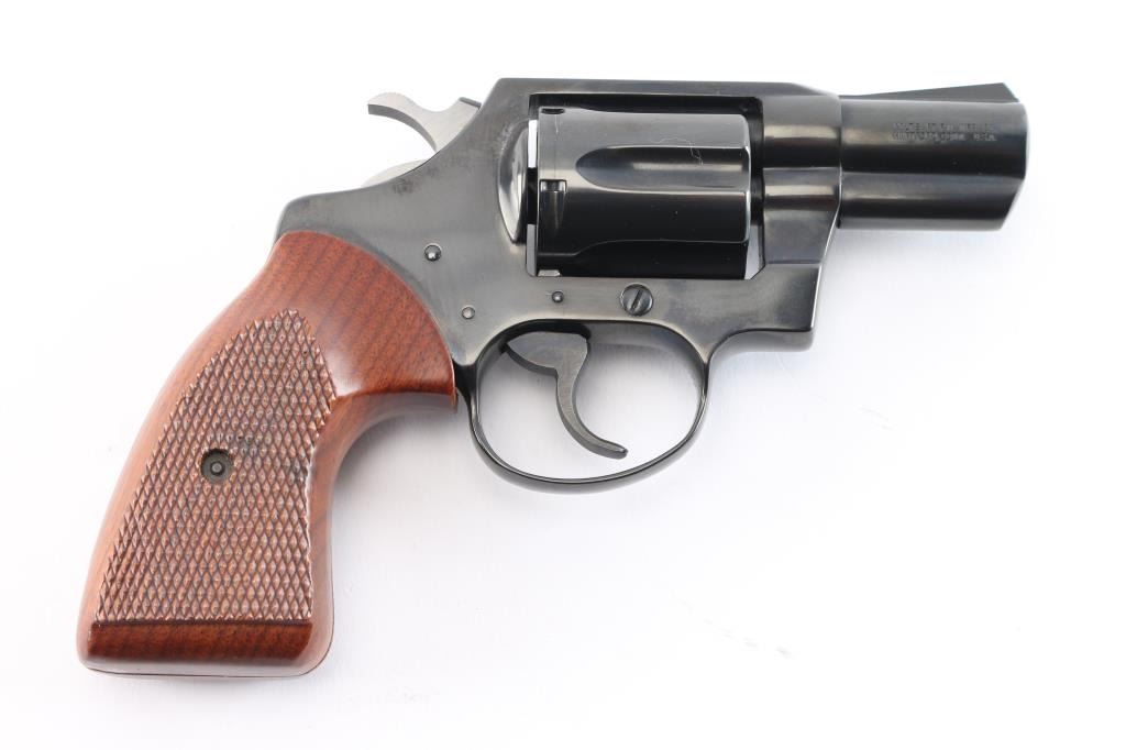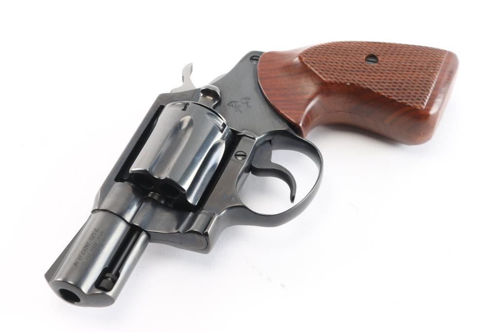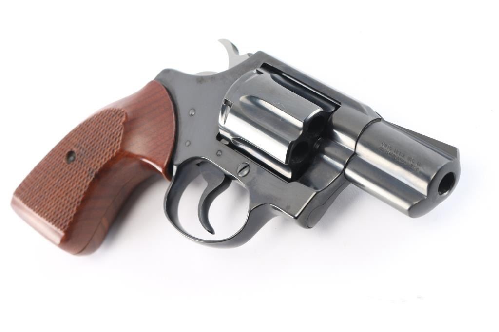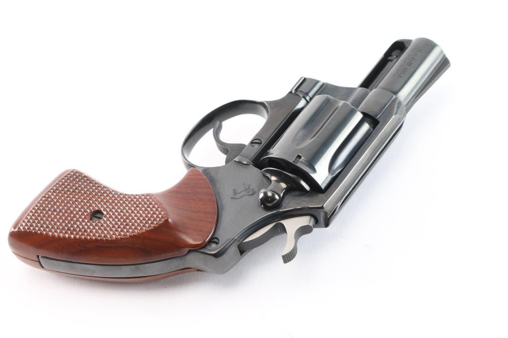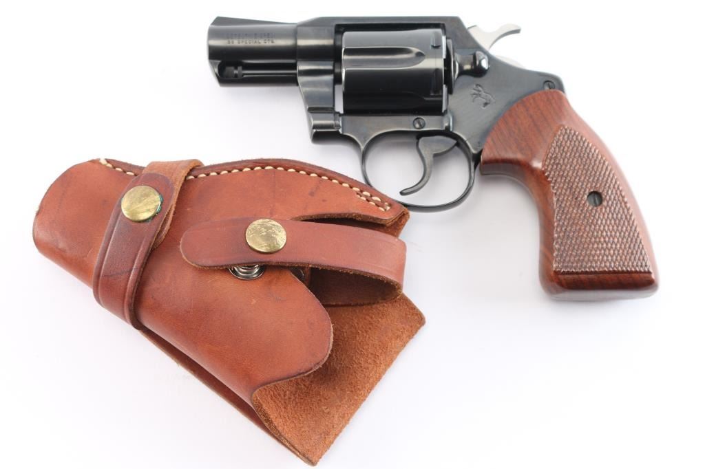 Manufactured 1982, third series (1973-86). Snub nosed double action revolver chambered in .38 Special. Features a blued finish, 2" barrel, fixed sights, shrouded ejector rod, long fluted six-shot cylinder, smooth trigger, serrated hammer spur, polished hammer sides and two piece checkered walnut grips. Revolver is in like new condition, bore is excellent bright, action is smooth with tight lock-up. Comes with a nice Brauer Bros brown leather snap holster.