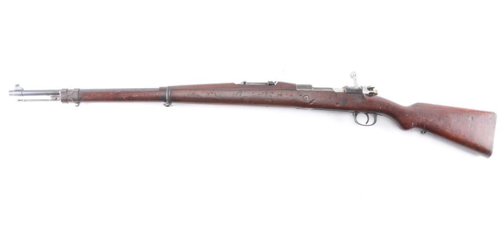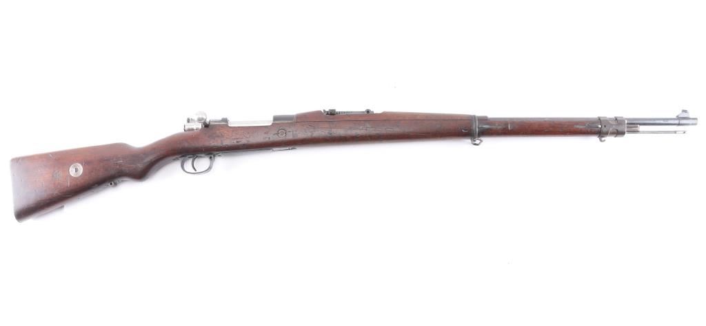 Brazilian Military contract bolt action rifle. Brazilian crest on receiver ring, along with "Mod.1908". DWM, Berlin markings on rail. Chambered in 7x57mm Mauser, manufactured in Germany . Features a blued finish, 29." barrel, raised dovetailed inverted 'v' front sight, tangent rear sight graduated to 2,000 meters, bayonet lug, cleaning rod, polished bolt with straight handle & three-position safety on the rear, rounded trigger, internal 5 round box magazine, two barrel bands, sling swivel, smooth wood handguard and near full-length pistol grip shoulder stock with inlayed steel disc, "a" next to intertwined letter cartouche & smooth metal buttplate. Serial numbers match on the receiver, stock and triggerguard. Rifle retains approximately 60% of it's blued finish showing scattered wear, handling, and minor pin prick pitting. Action is smooth, the bore is good with strong rifling Crest is sharp and the wood stocks are very good with minor scratches and dings. Missing rear sling swivel. Imported by CAI, marked on left barrel.