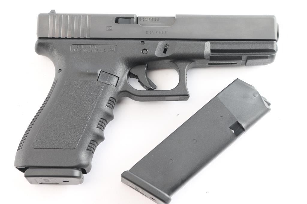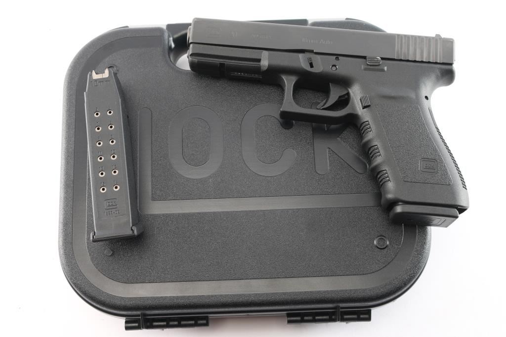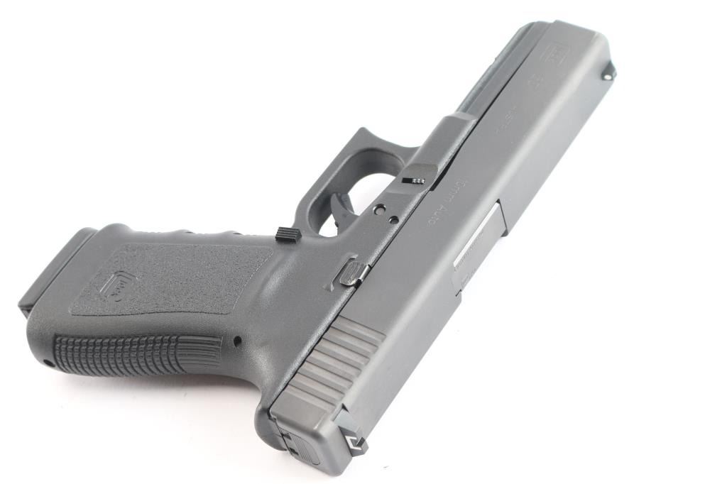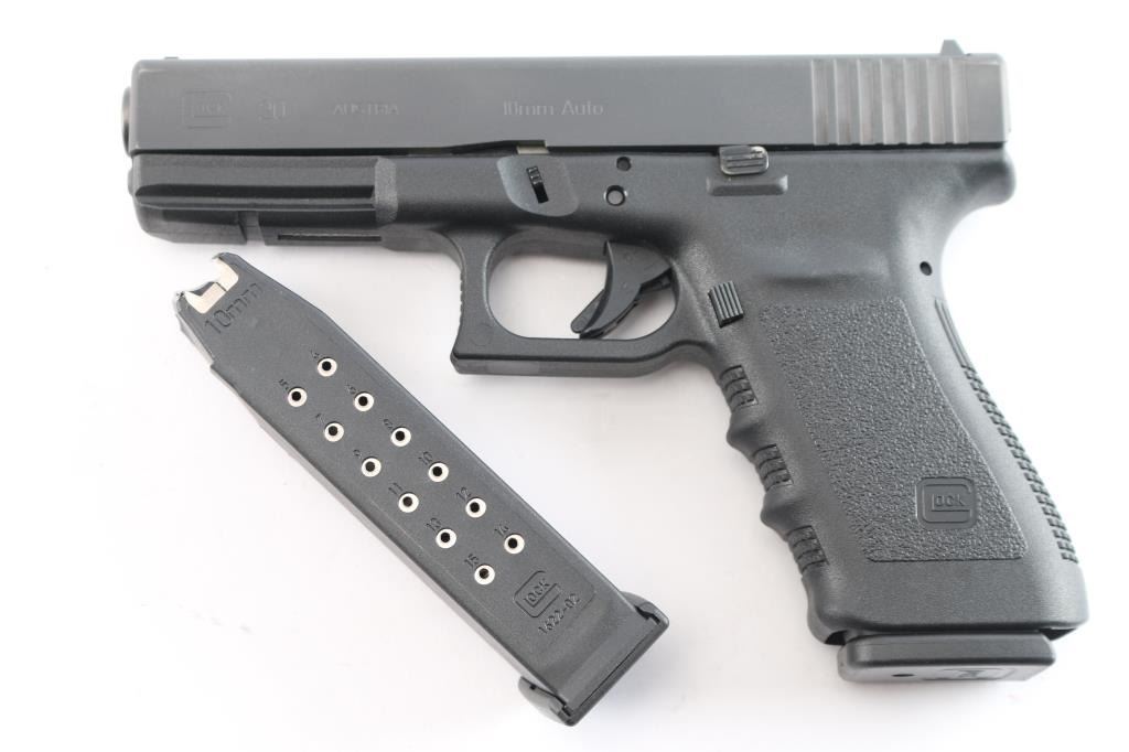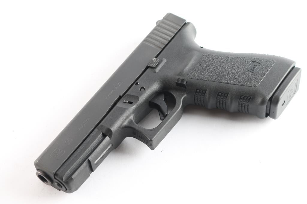 Austrian made full size safe-action semi-automatic pistol chambered in 10mm Auto. Features a matte finish, 4.61" barrel, white dot front sight, dovetailed rear sight with white outlined square notch, trigger safety, push button magazine release, factory 15 round magazine, and durable black polymer frame with integral accessory rail & finger groove grip. Pistol retains approximately 98% of its original finish showing only minor edge wear. Bore is pristine and polymer is excellent. Comes with the original factory hard case with spare magazine, cleaning tools, and documents.
