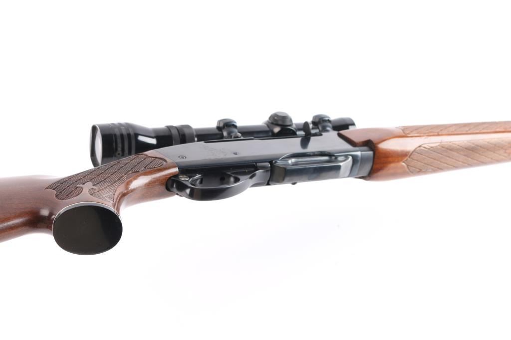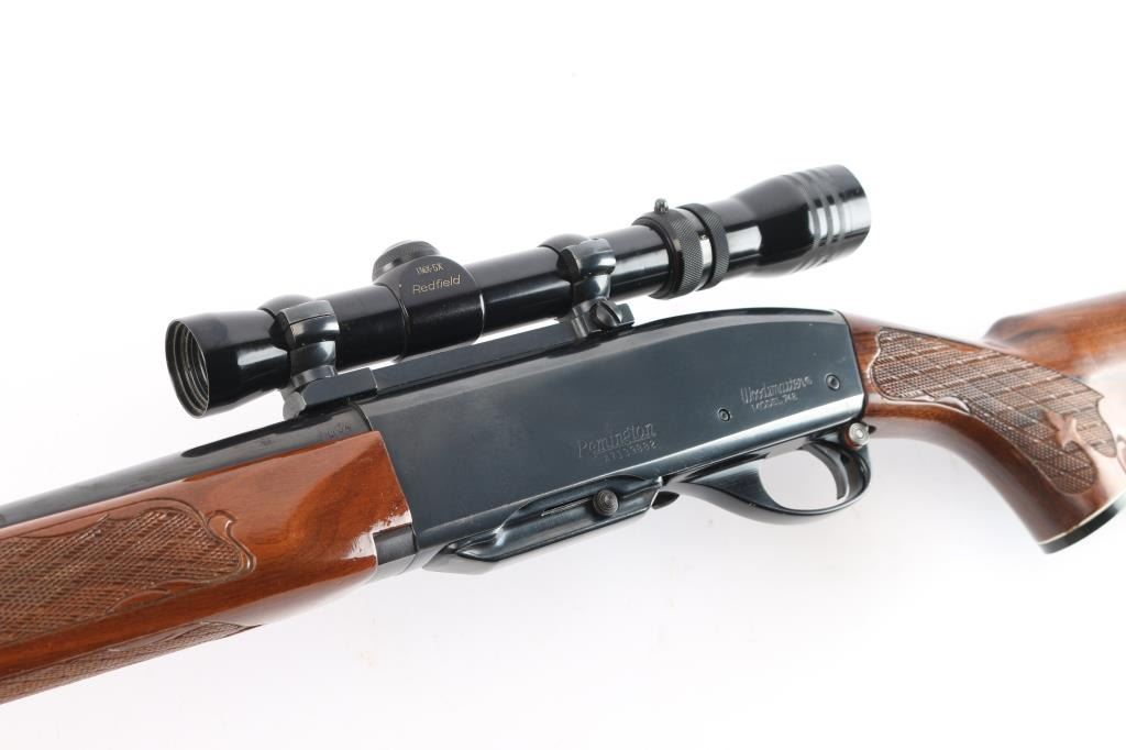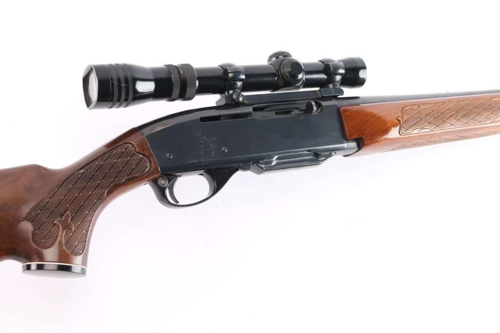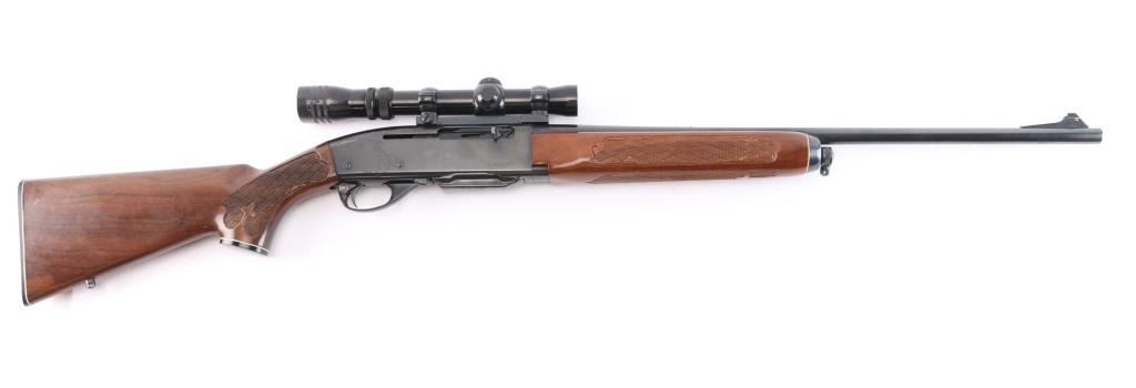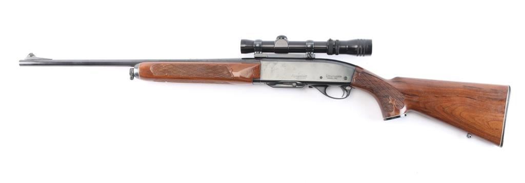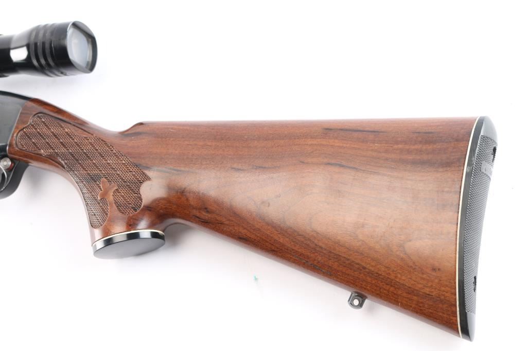 Semiautomatic rifle manufactured circa 1960-80, this one manufactured1976. Features 22" barrel, ramp front sight with beaded blade, rear sight removed, filler screws in holes,push button safety, blued finish, wood stock with impressed checkering at wrist & forend, factory buttplate and grip cap with white spacers. Sling swivel studs. Mounts a good condition Tasco Redfield 1 3/4X-5X Scope, duplex reticle, clear view. Bore is very good, strong rifling. Retains about 95% blued finish with minor scratches. There is a patch of pin-prick pitting on the right receiver. Wood is nearly excellent with few minor scratches. One magazine.