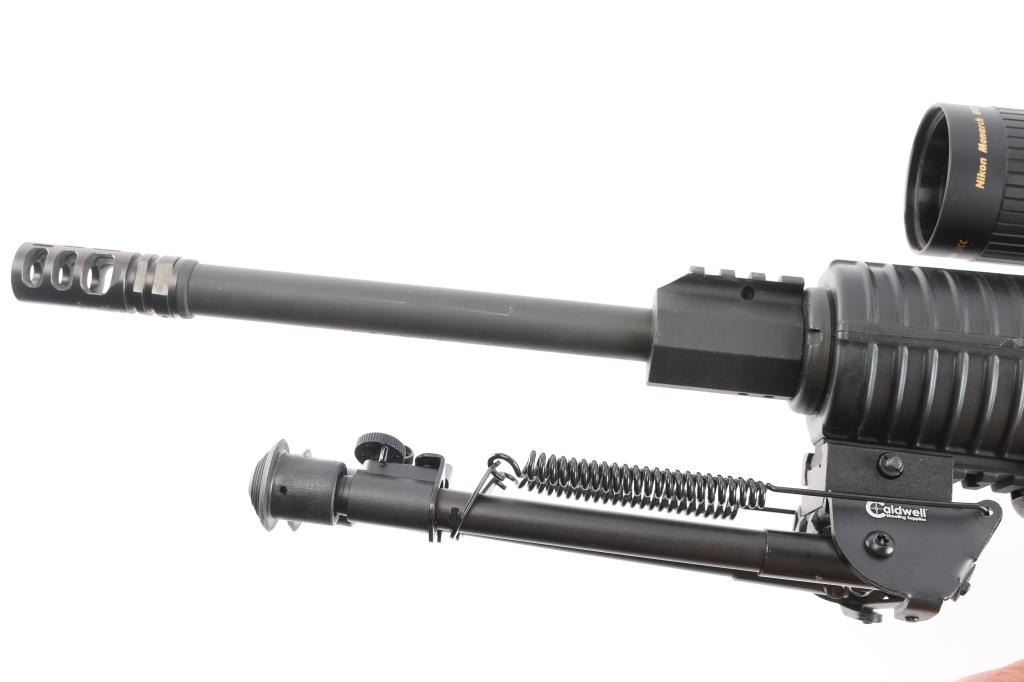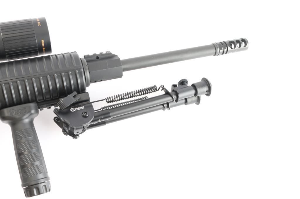 Upgraded Panther Arms pattern AR-10 semi-automatic rifle. Matte black finish. Features a Timney AR-15 Drop-In single-stage 3 lb Trigger, 16" barrel with Gamma VG6 muzzle break, round handguards. 2" sight rail installed on barrel, Caldwell bipod and Daniel Defense vertical grip installed on handguards, MOE+ grip, fixed A2 style stock, combo shell deflector/forward assist. Mounted with a Nikon Monarch UCC 6.5-20X44 scope. duplex reticle, clear optics. M-308 base. Bore is pristine. Overall excellent with a couple of very minor scratches. One 20-rd magazine.